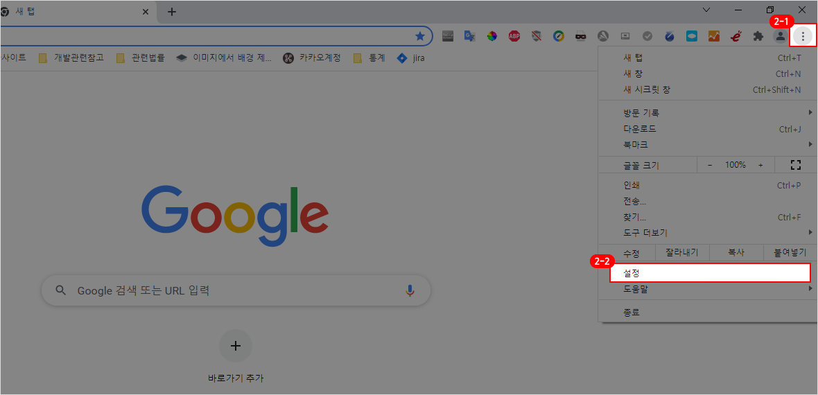 2크롬브라우저를 킨 뒤 우측 상단의 버튼(2-1)을 클릭하여 메뉴가 열리면 설정(2-2)을 클릭합니다