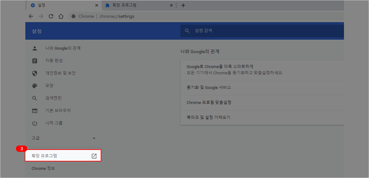 3설정 메뉴가 열리면 하단의 확장프로그램(3)을 클릭합니다