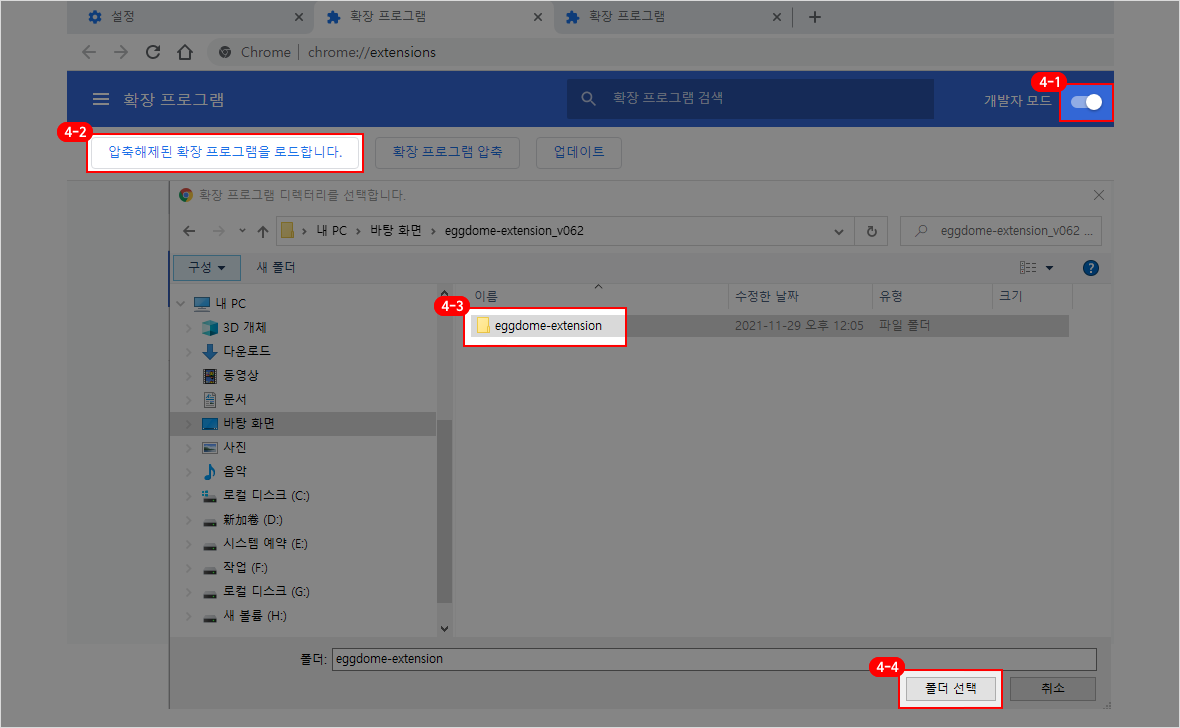 압축 푼 폴더를 찾아 eggdome-extension 폴더(4-3)를 클릭한 뒤 폴더선택(4-4)를 클릭합니다