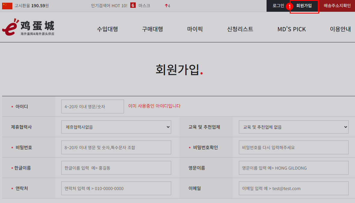우측 상단의 회원가입을 클릭하여 회원가입을 진행합니다