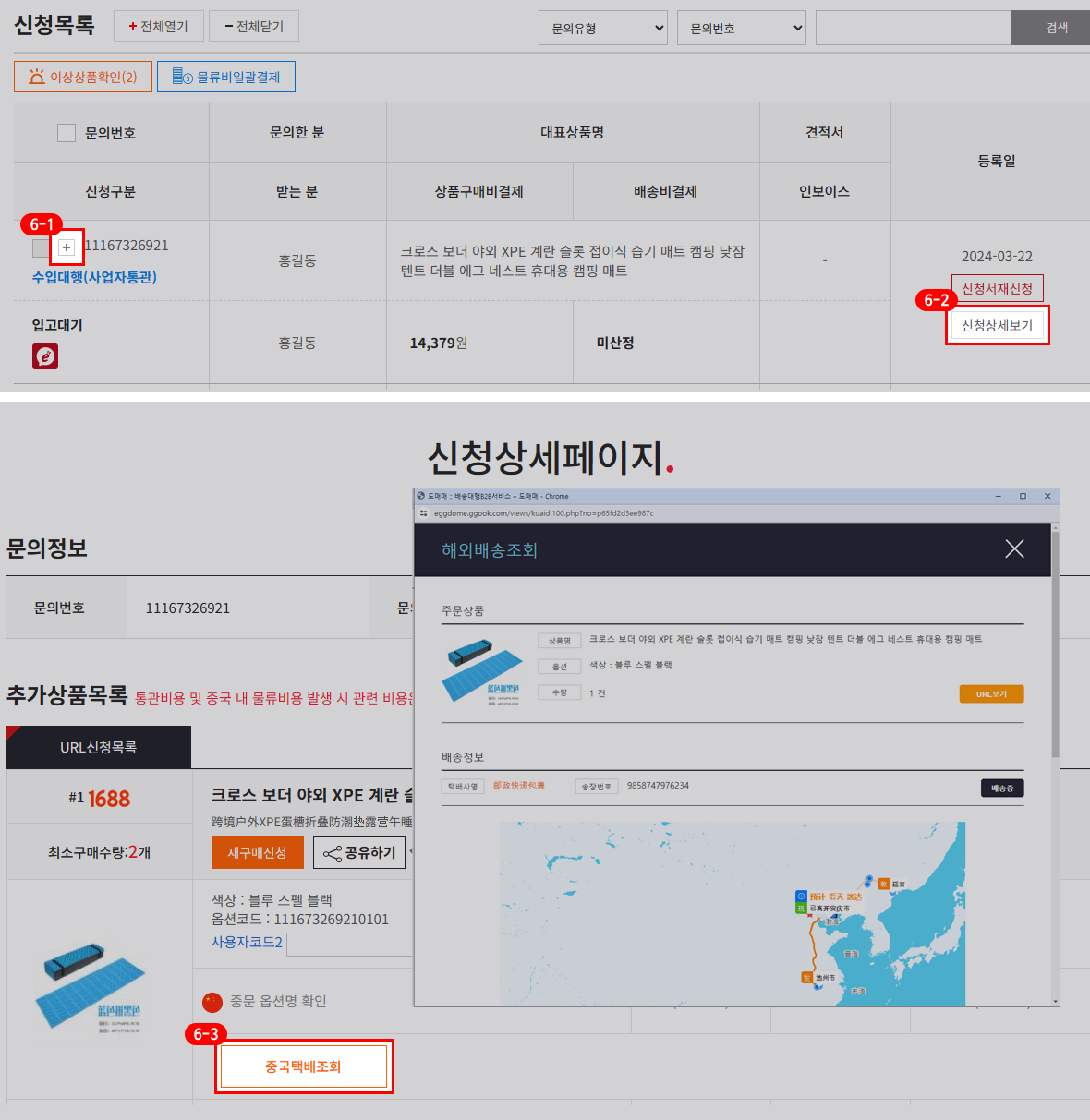 상품구매비 결제 후 중국 내 배송이 시작된 경우 +(6-1) 버튼 또는 신청상세보기(6-2) 를 클릭한 다음 중국택배조회(6-3) 버튼을 클릭하여 중국 내 배송현황을 확인할 수 있습니다