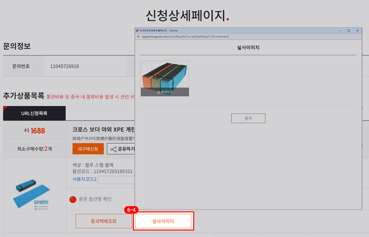 현지 물류창고로 입고가 완료된 경우 +(6-1) 버튼 또는 신청상세보기(6-2) 를 클릭한 다음 실사이미지(6-4) 버튼을 클릭하여 입고된 상품의 사진을 확인할 수 있습니다