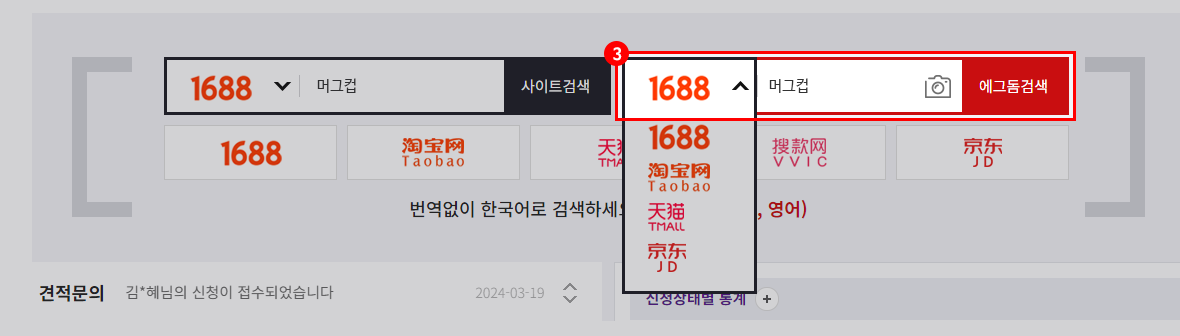 메인 또는 대행신청 페이지에서 상품을 검색할 쇼핑몰을 선택한 뒤 키워드를 입력한 후 에그돔검색을 클릭합니다