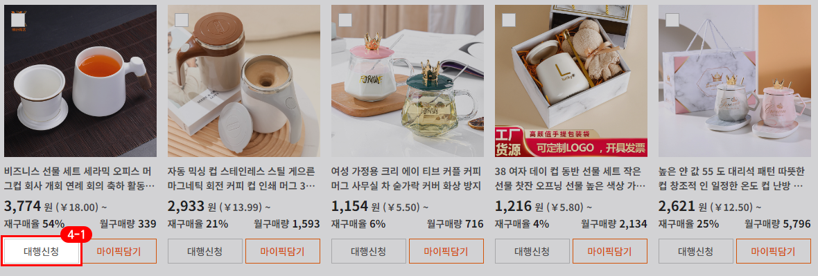 상품 검색결과가 노출되면 수입을 원하는 상품을 찾아 대행신청(4-1) 버튼을 클릭합니다