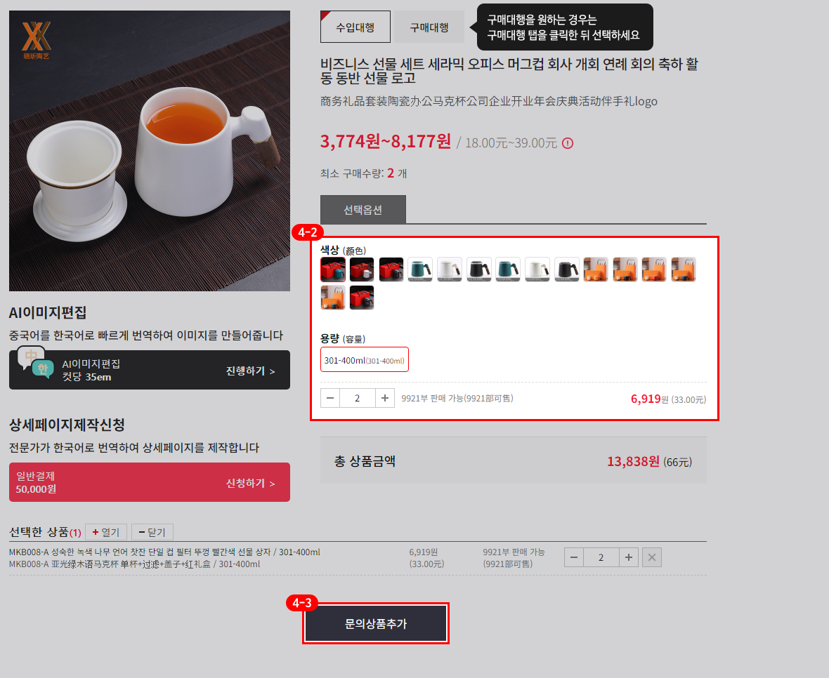 수입할 상품의 옵션 및 수량을 선택(4-2)한 뒤 문의상품추가(4-3)를 클릭합니다