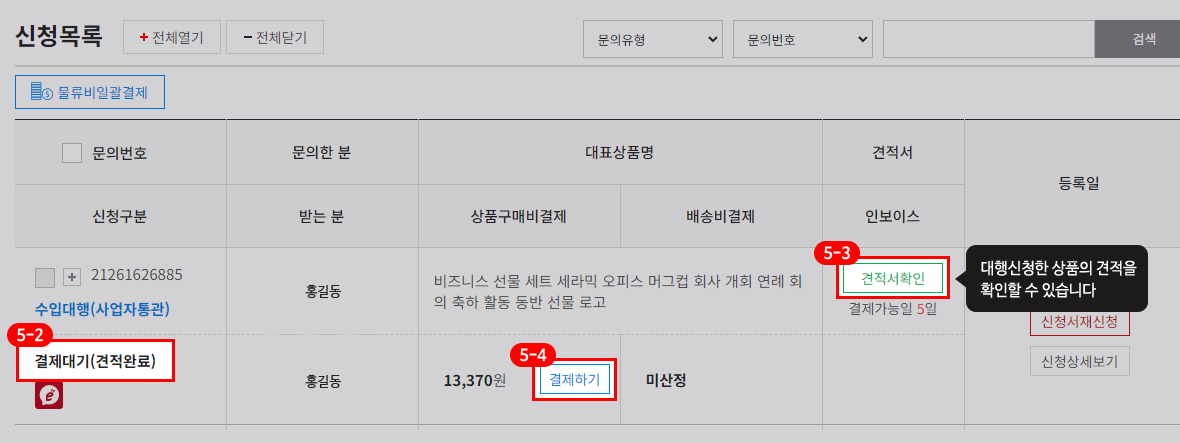 신청상태가 견적대기 → 결제대기(견적완료)(5-2)로 변경되면 견적서 확인(5-3)이 가능하며 결제하기(5-4)를 클릭하여 상품구매비 결제를 할 수 있습니다