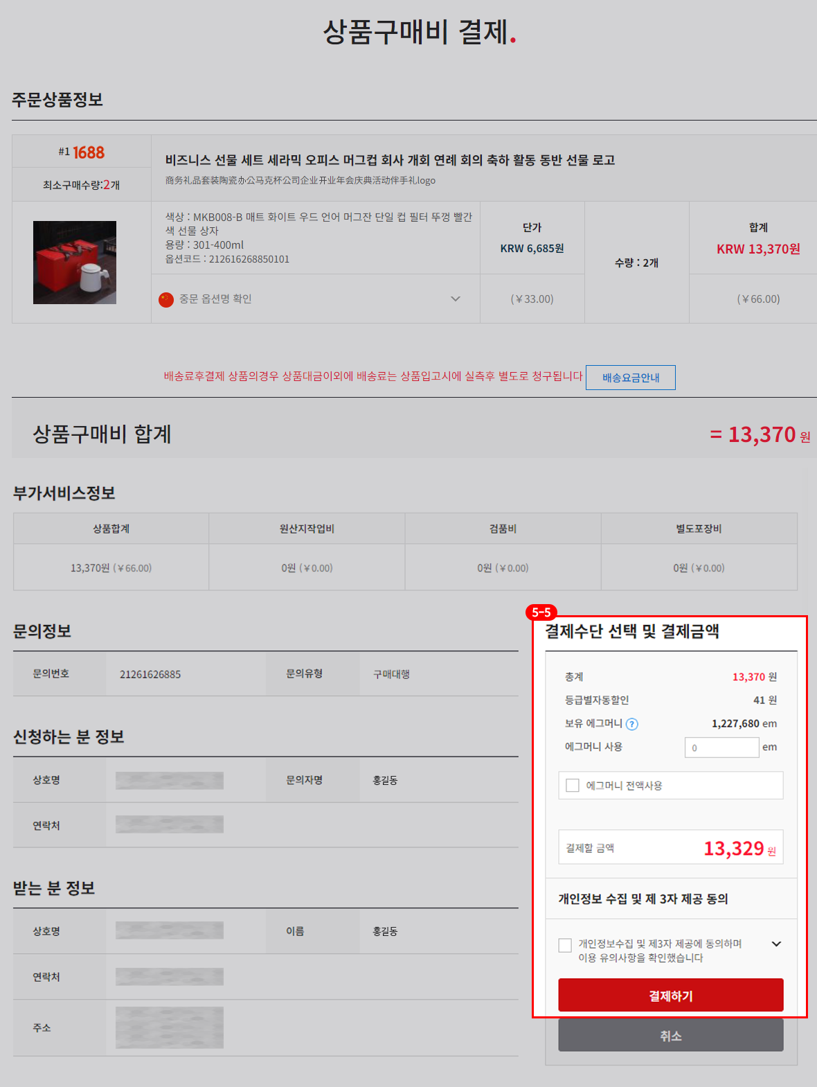 대행신청 페이지에 상품(4-4)이 담기면 대행신청 시 필요한 추가 정보를 입력 후 문의등록(4-5)합니다