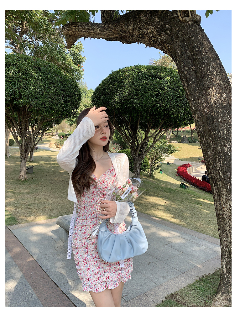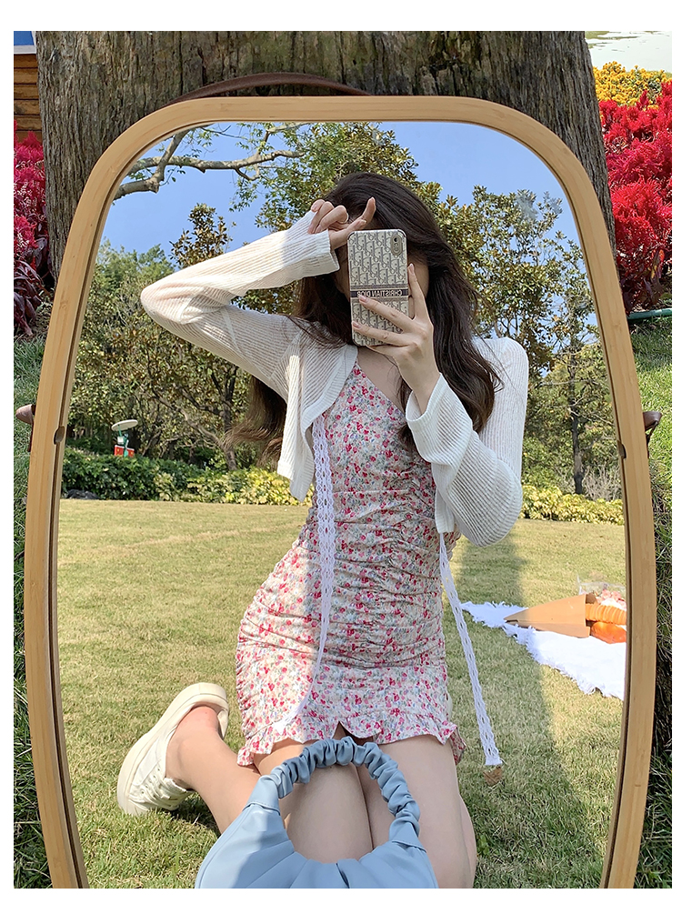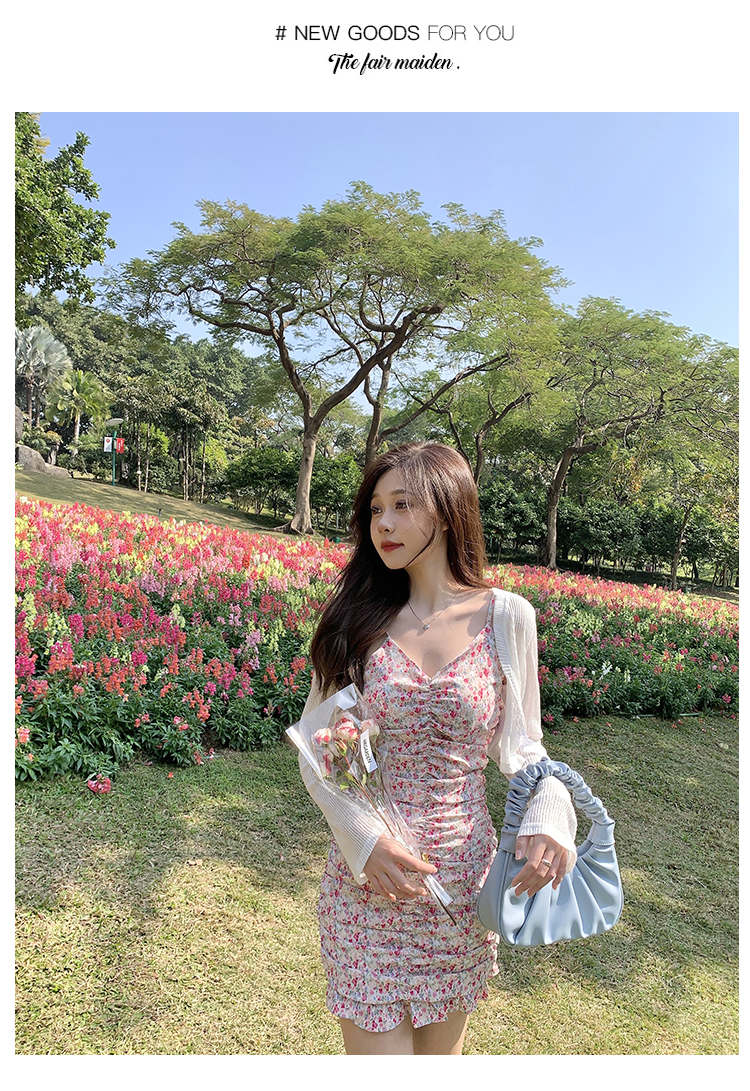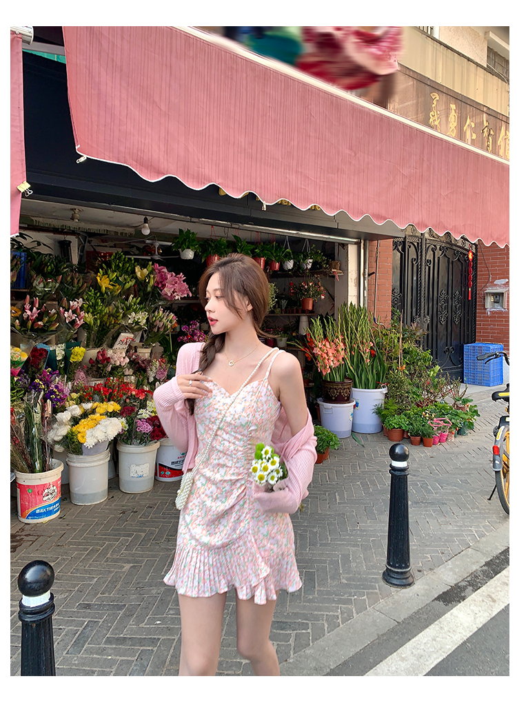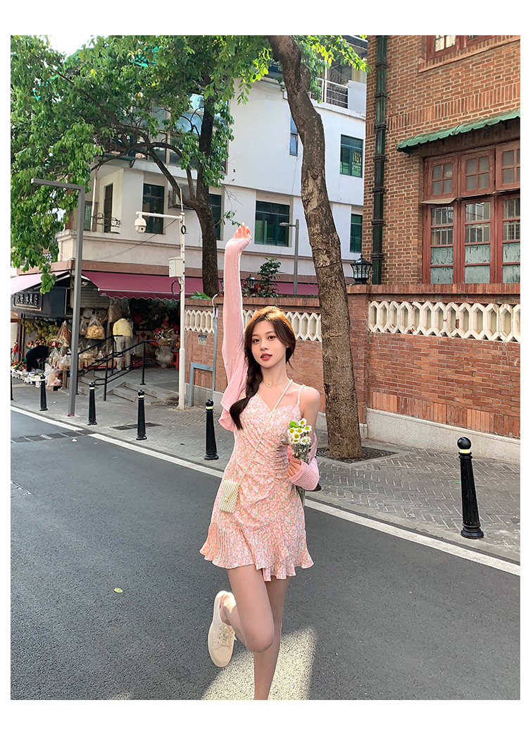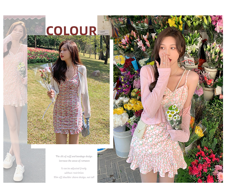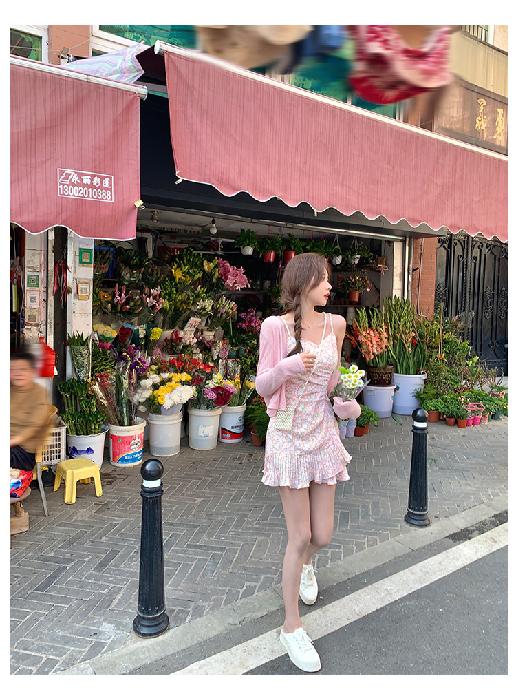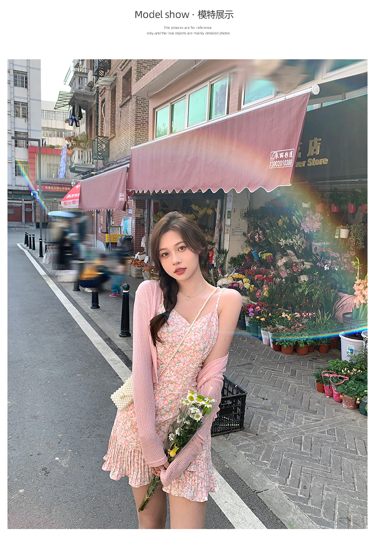 张大人大码女装胖妹妹mm显瘦遮肉碎花吊带连衣裙套装洋气两件套夏