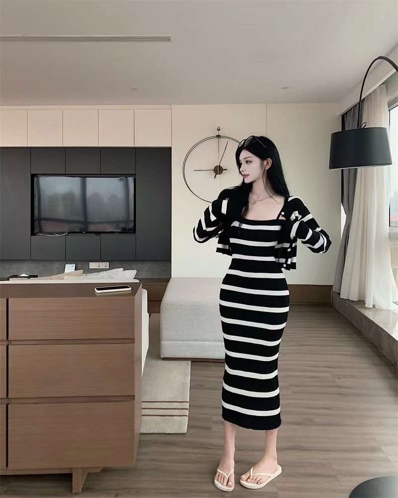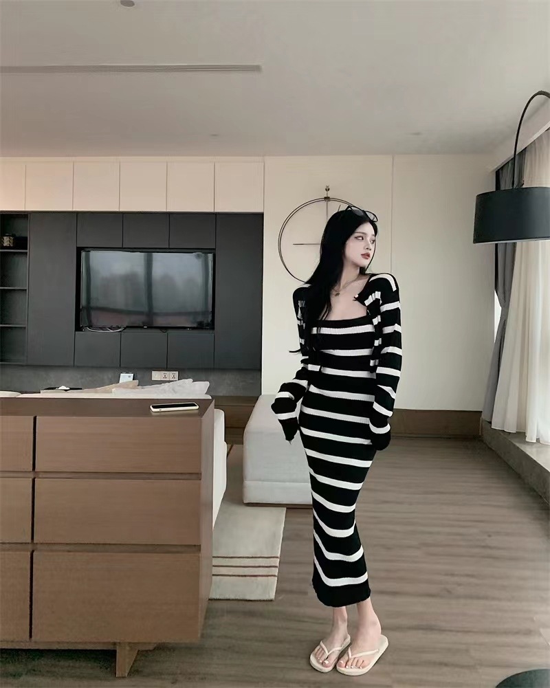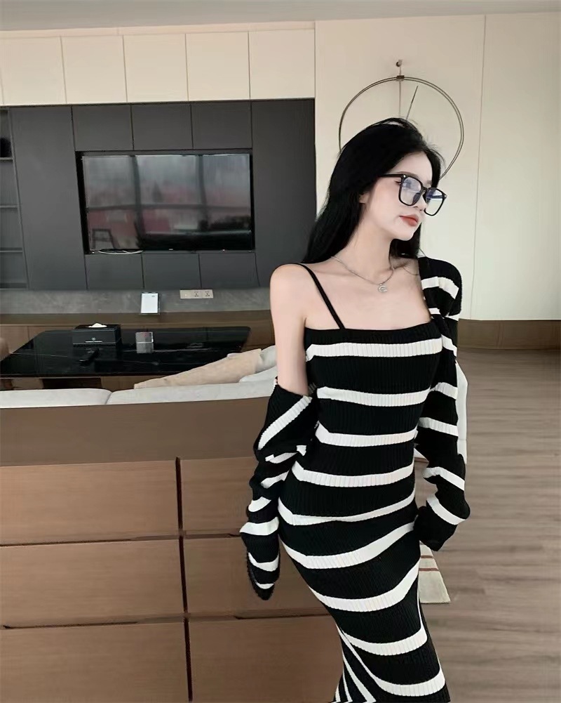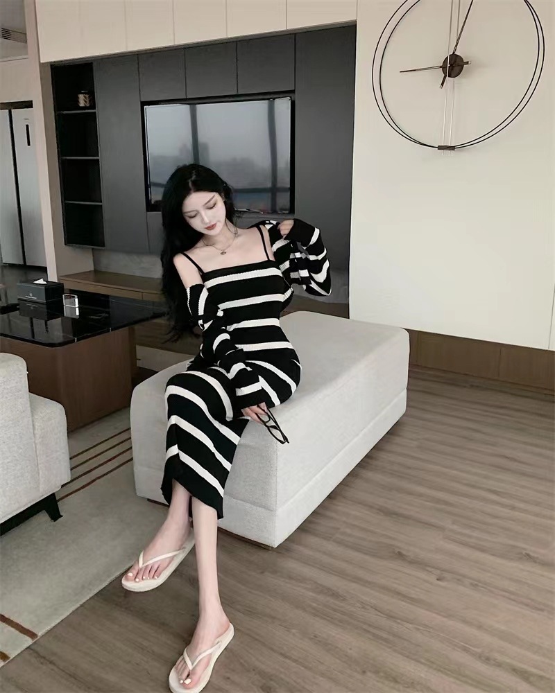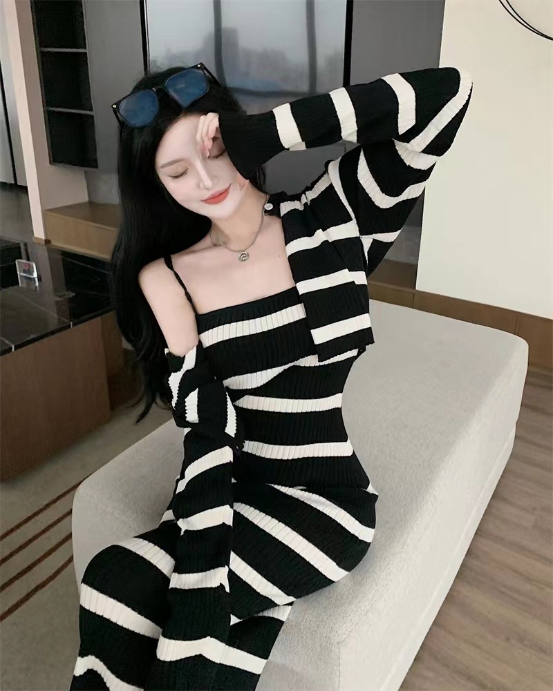 夏装新款女装套装女短款长袖针织上衣一字肩条纹吊带连衣裙两件套
