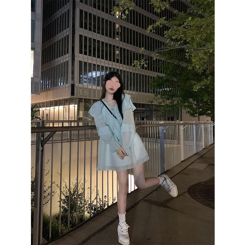新森林氧吧薄荷绿大翻领连衣裙时尚气质清新甜美风高腰A字裙女装