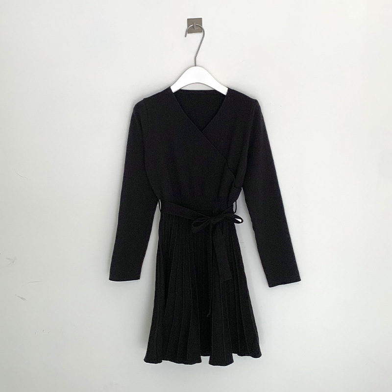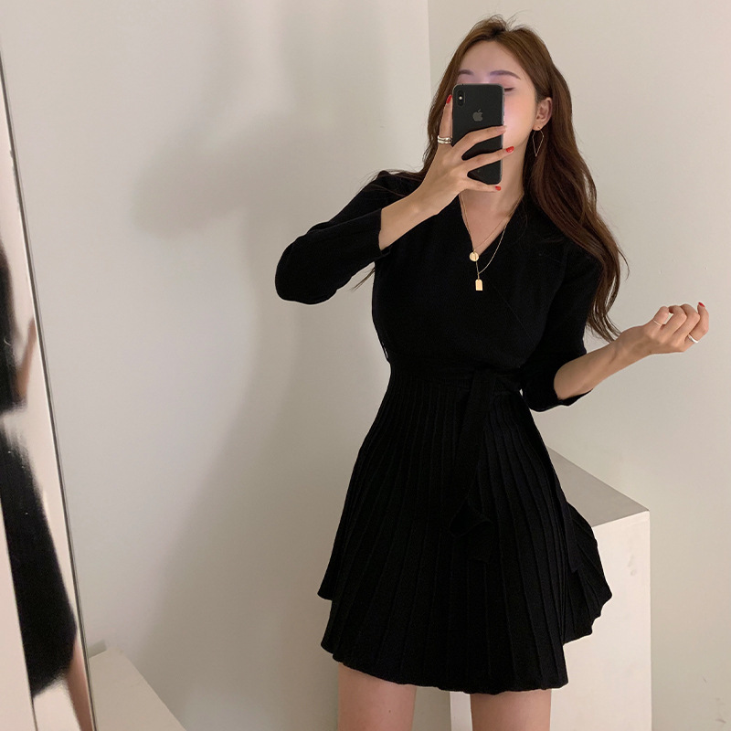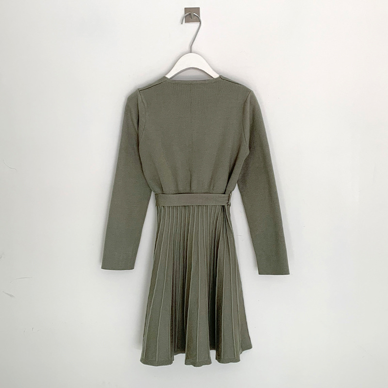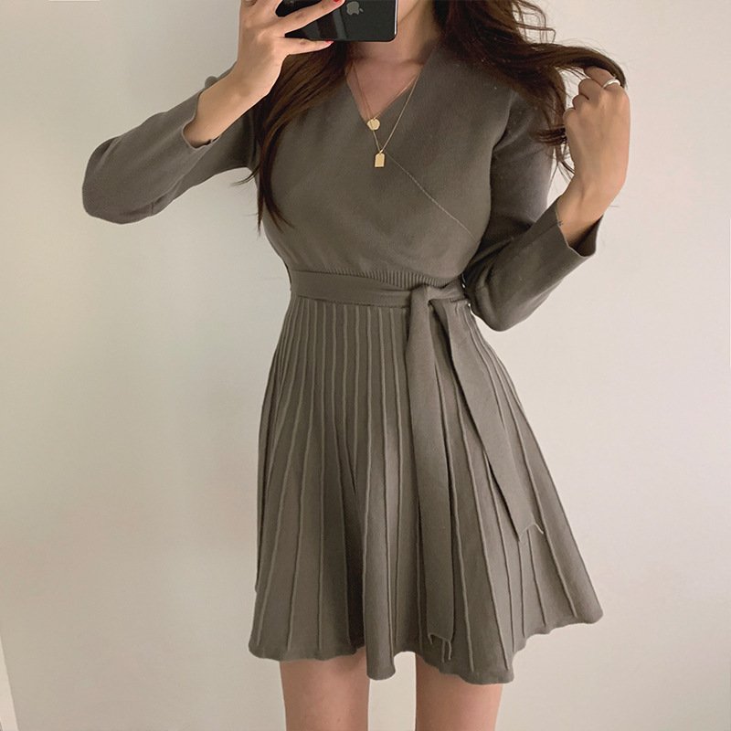 韩国chic秋冬款气质V领收腰系带中长款打底针织连衣裙