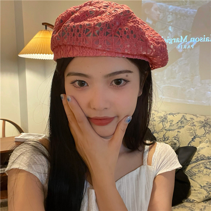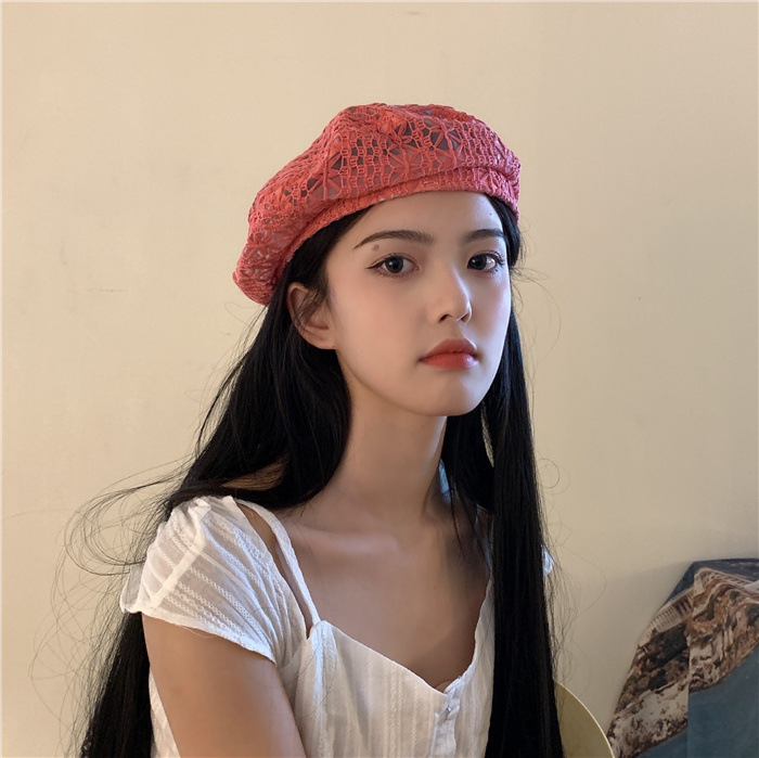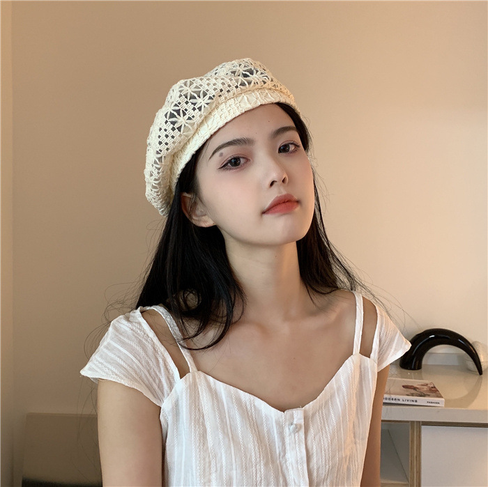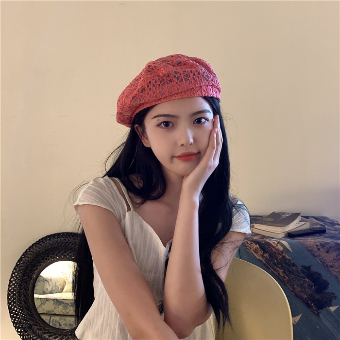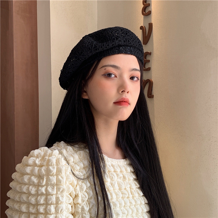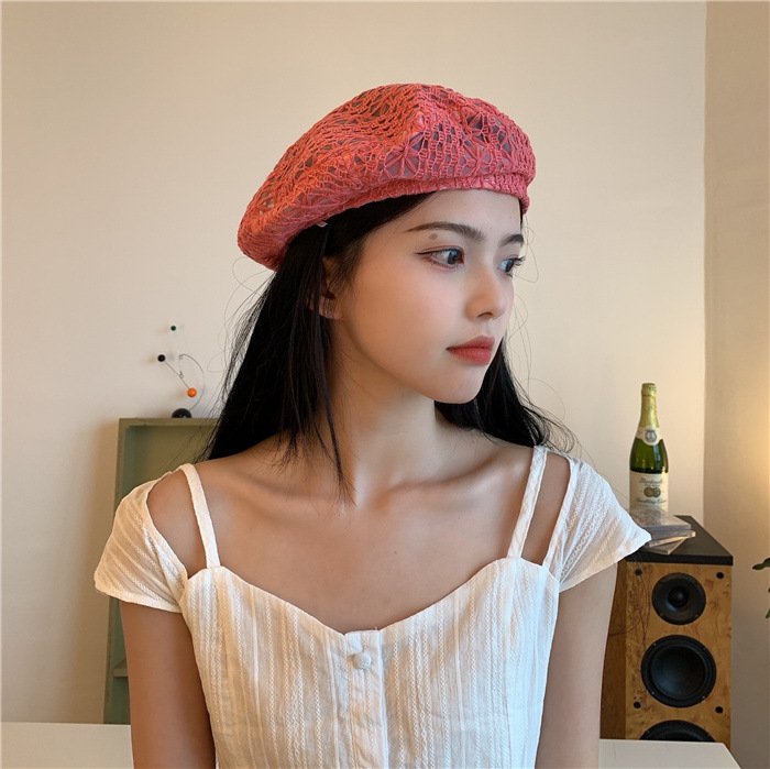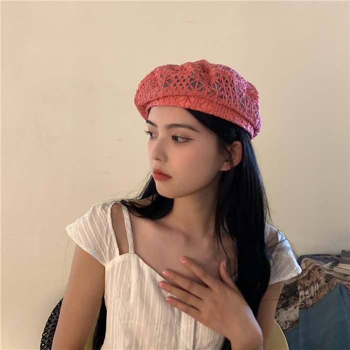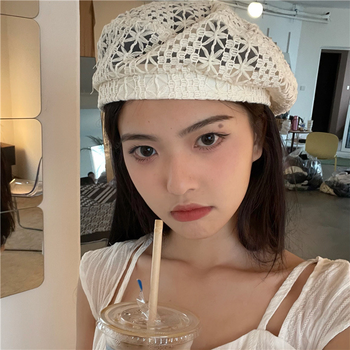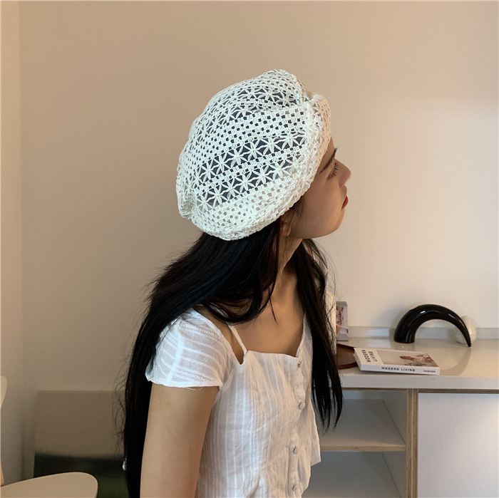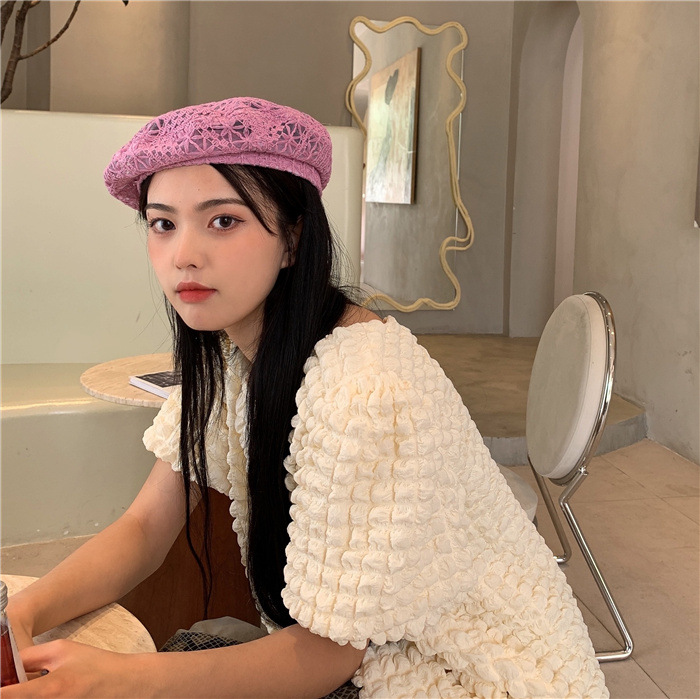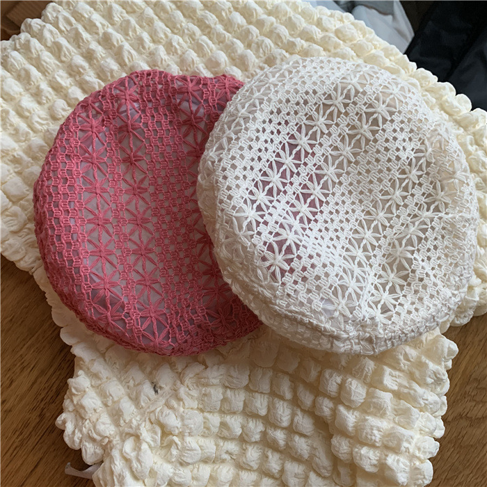 帽子女韩国甜美镂空透气蕾丝贝雷帽夏季薄款透气百搭时尚画家帽潮