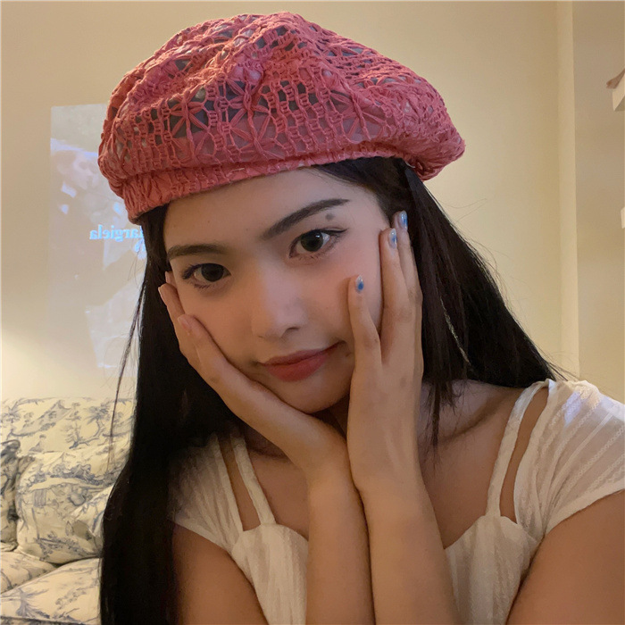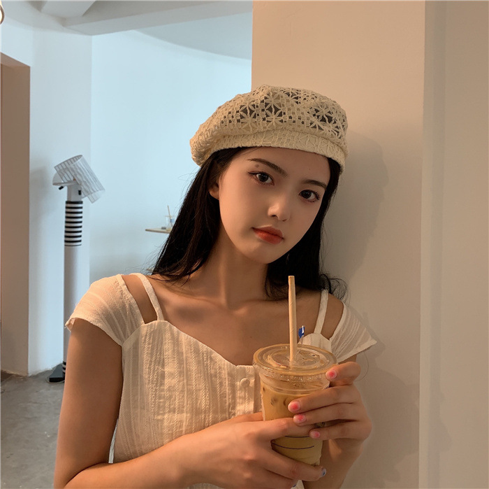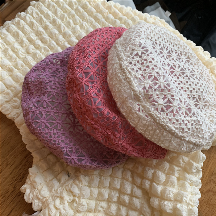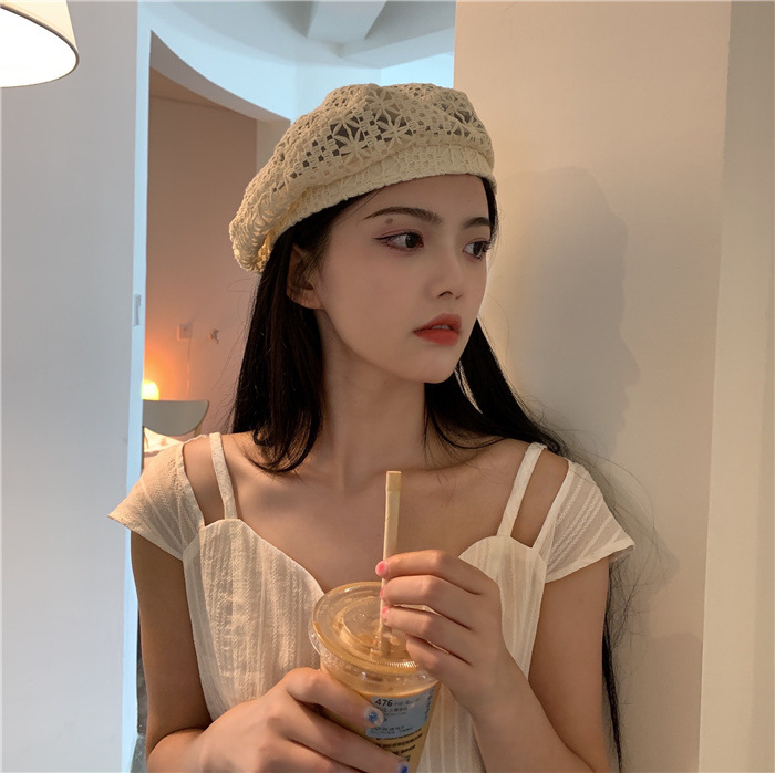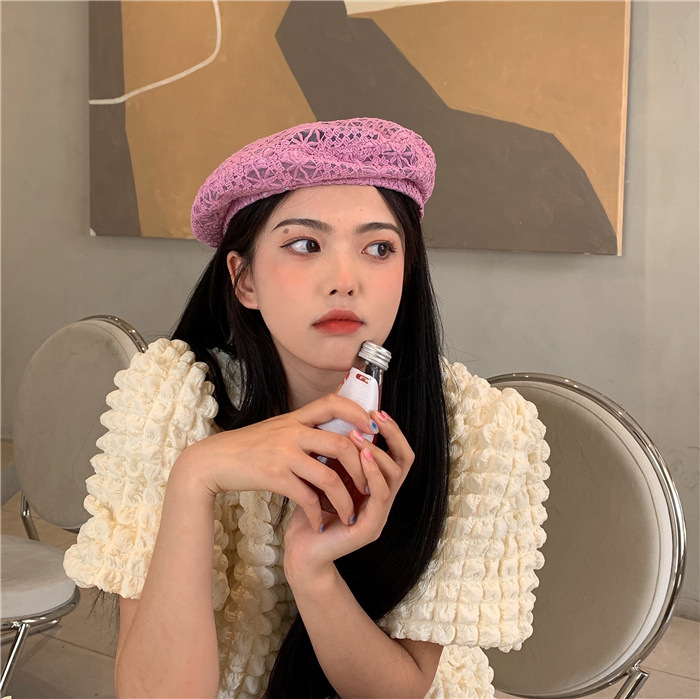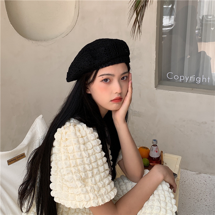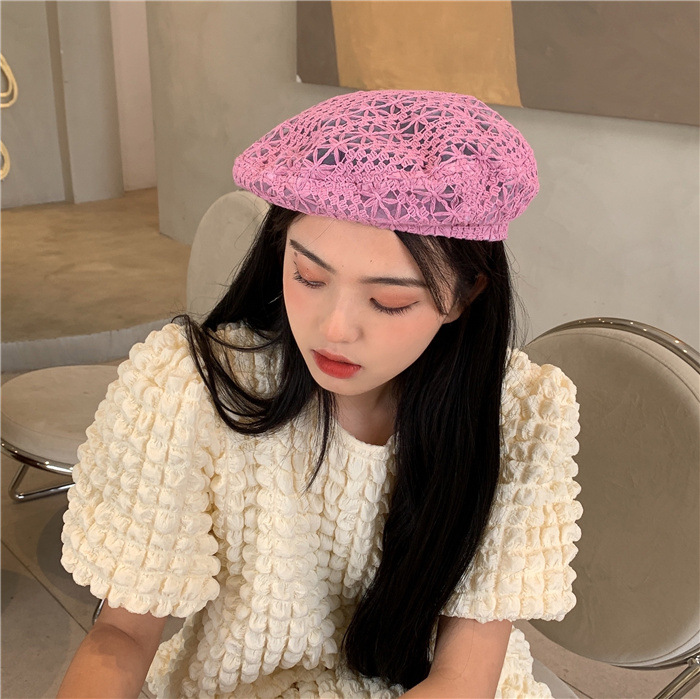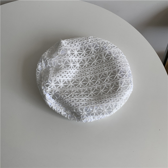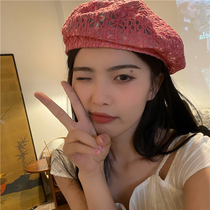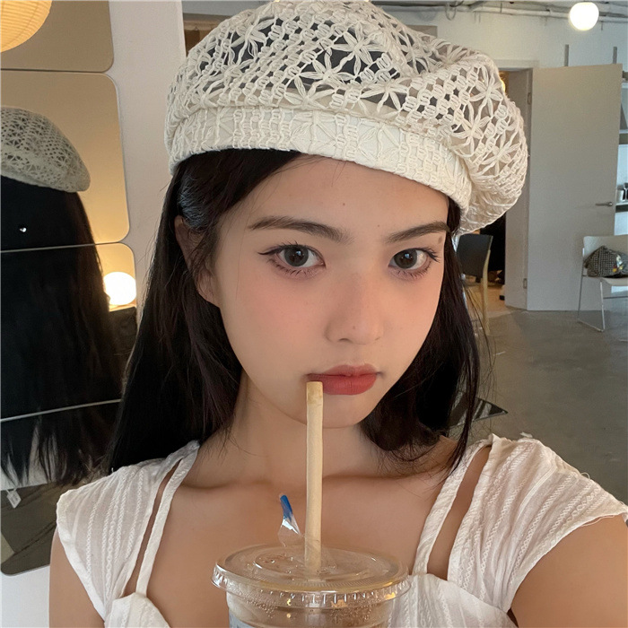 帽子女韩国甜美镂空透气蕾丝贝雷帽夏季薄款透气百搭时尚画家帽潮