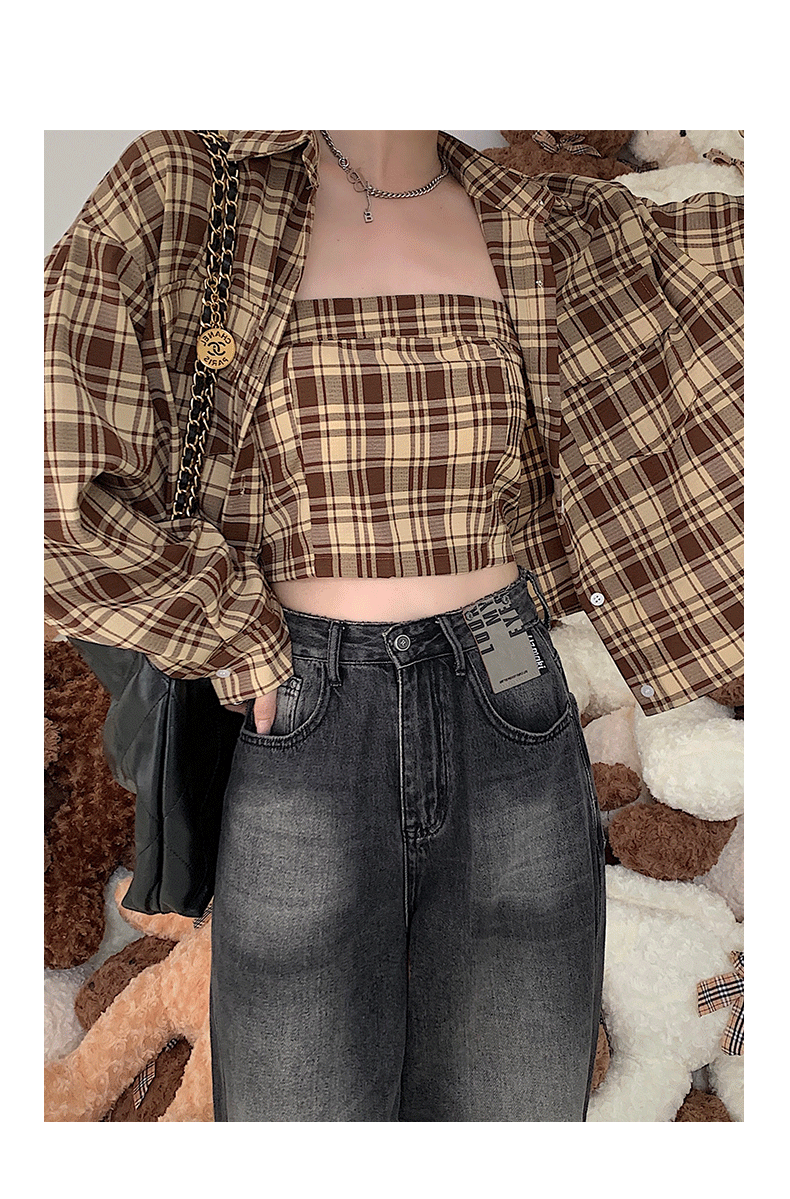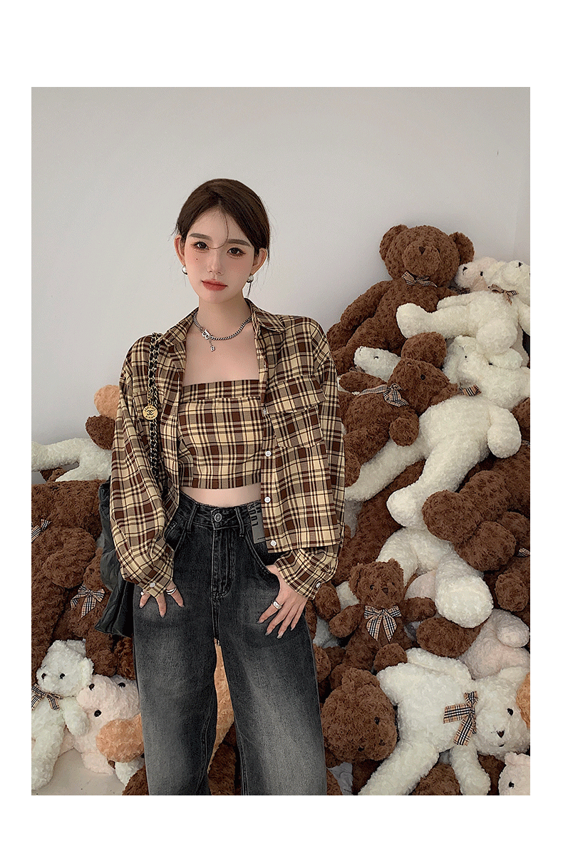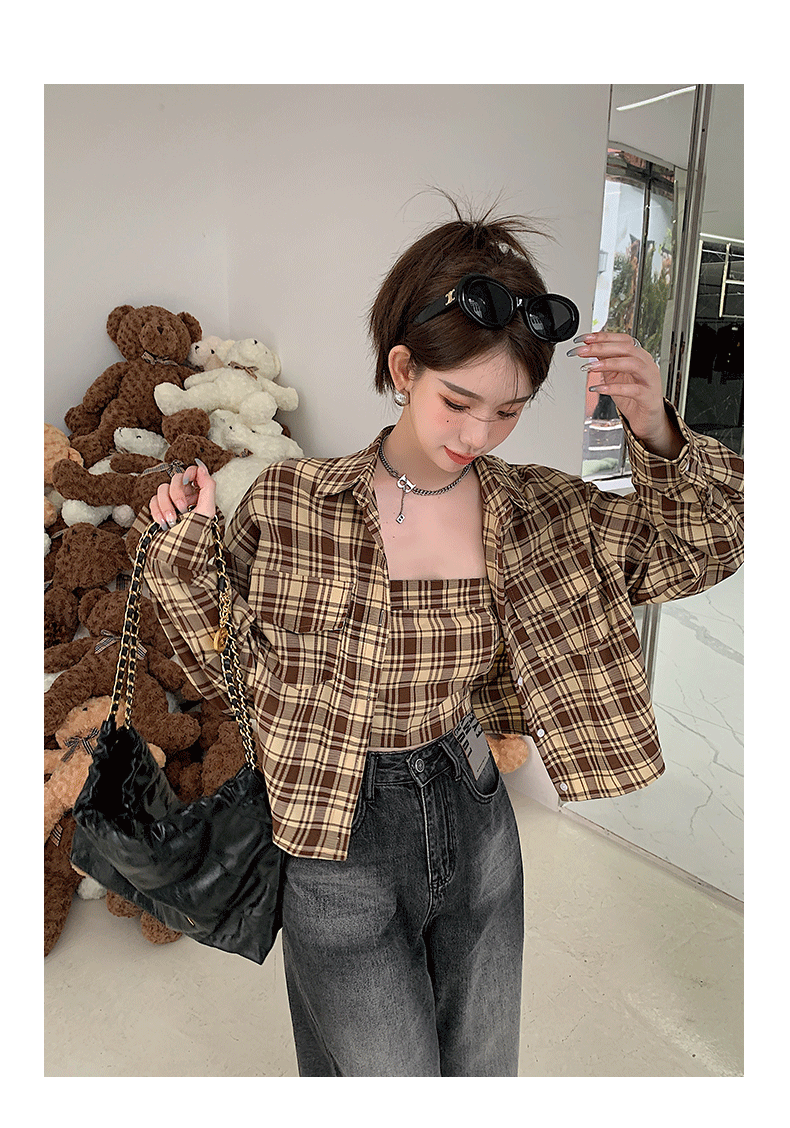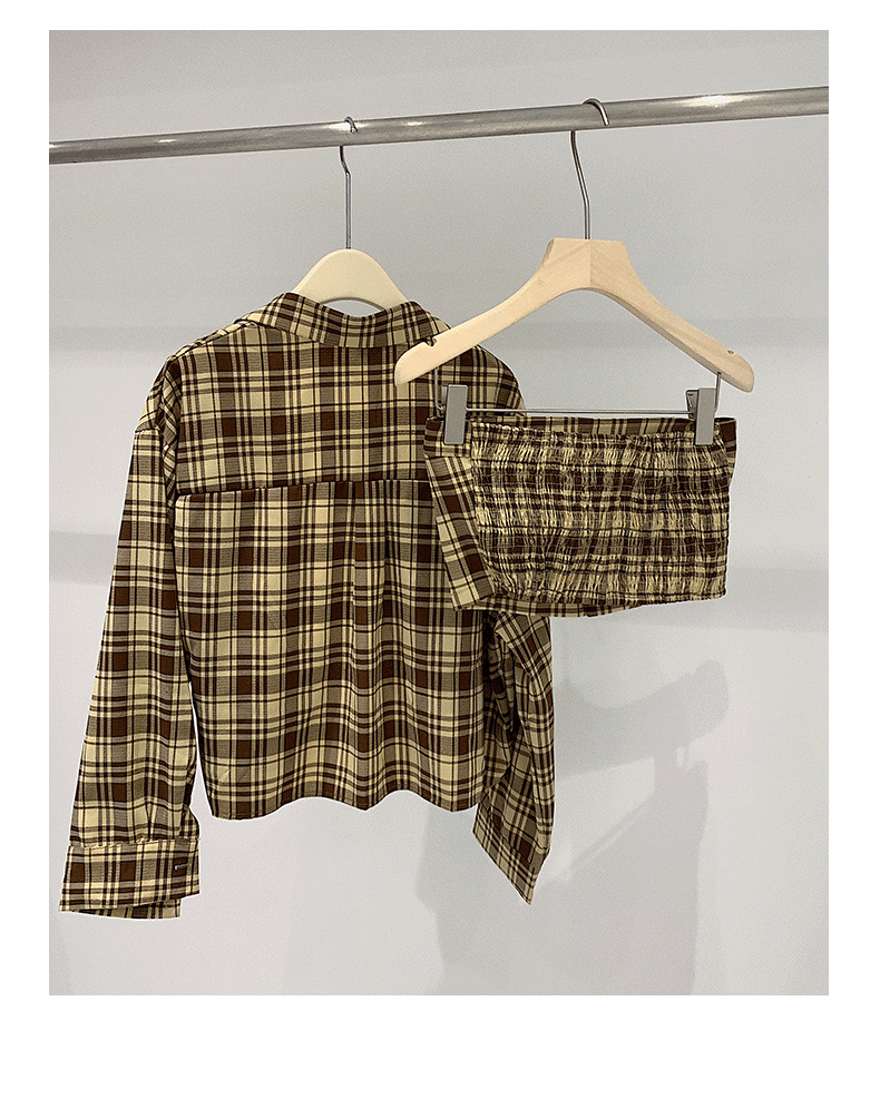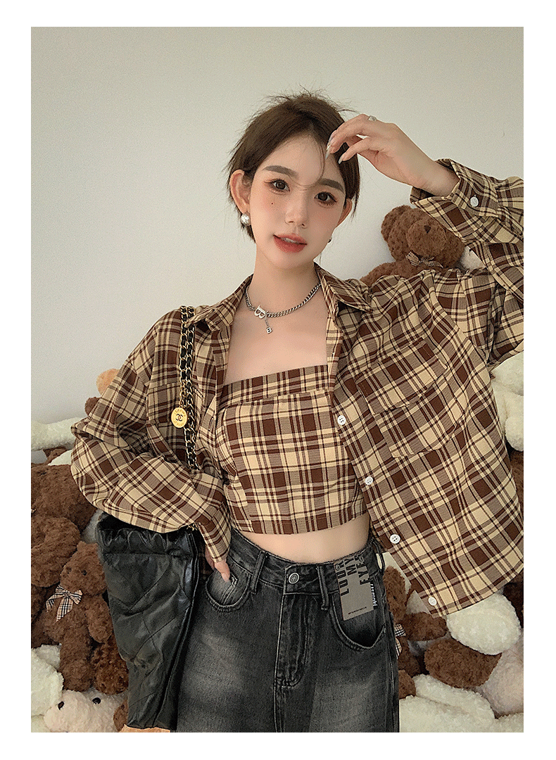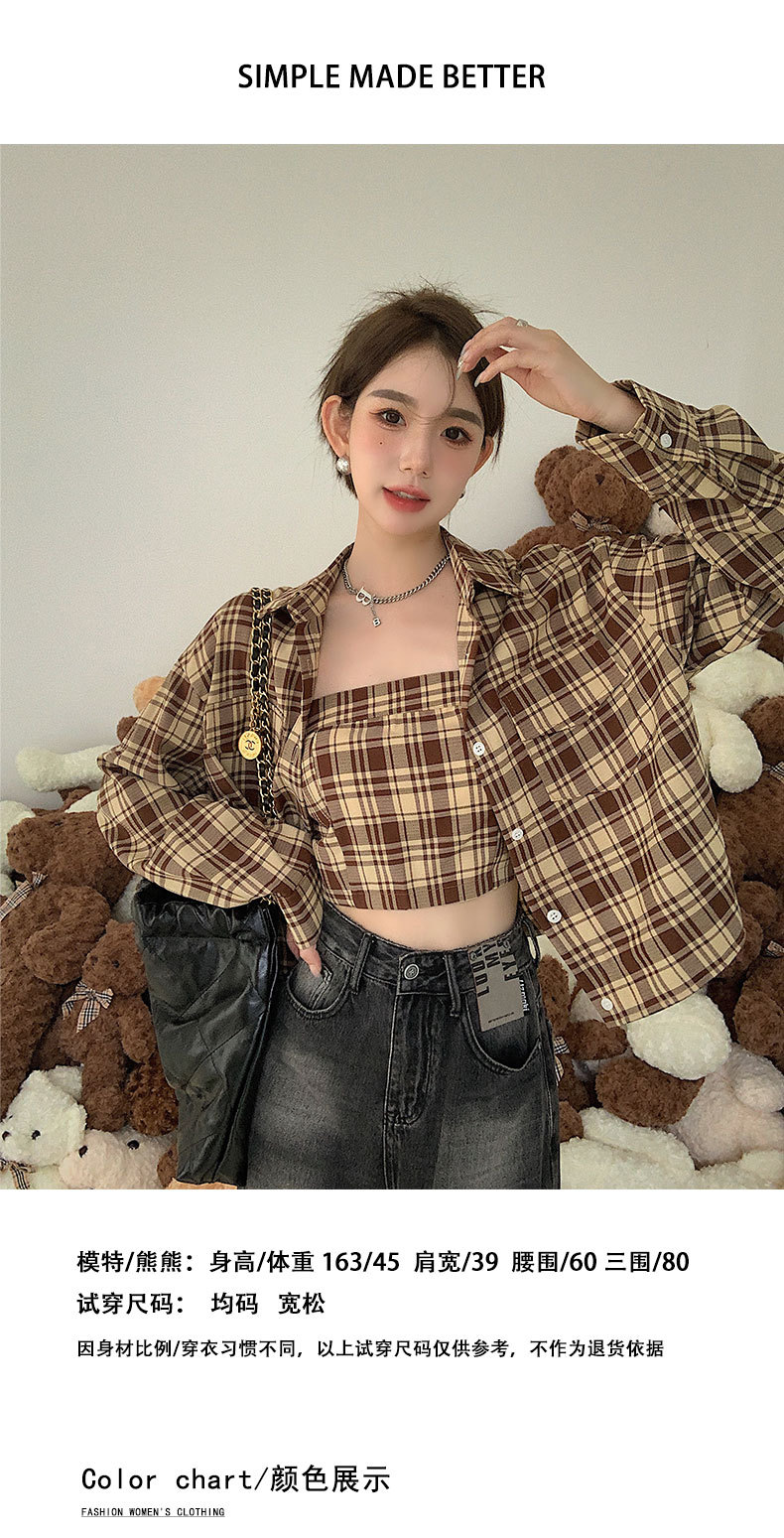 NONO 十三行秋季新款内搭抹胸外穿长袖格子衬衫外套女