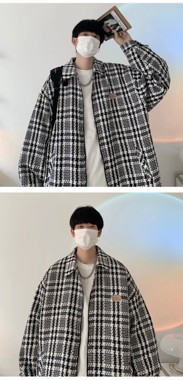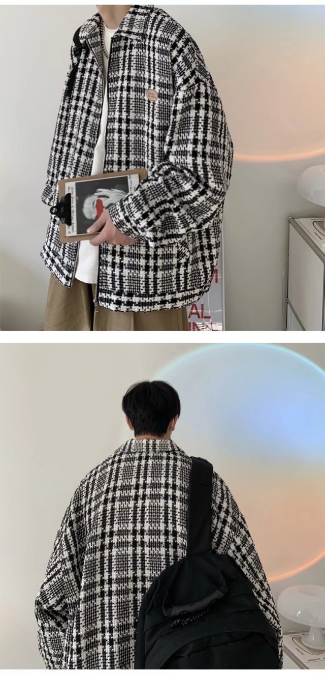 스타일리시 오버핏 터틀넥 체크 재킷
