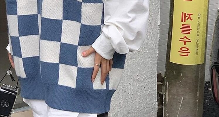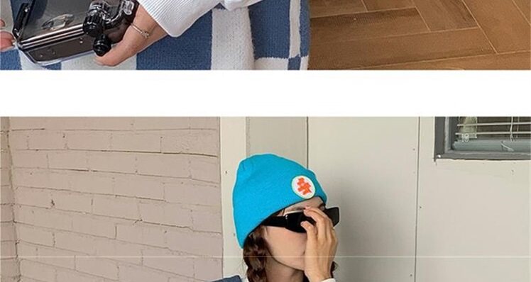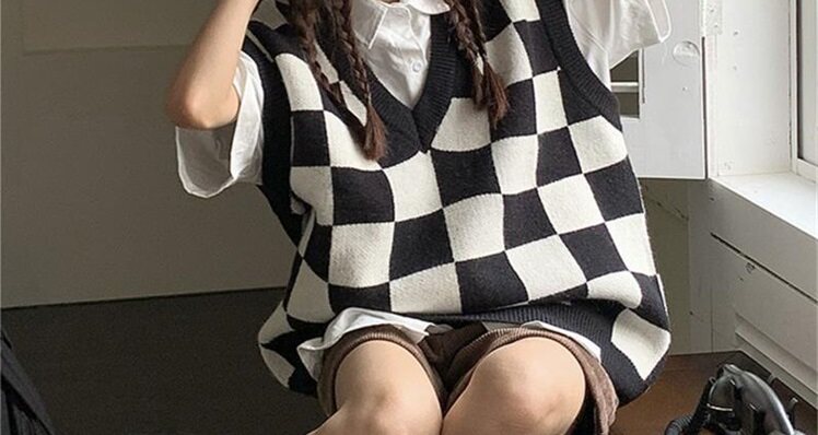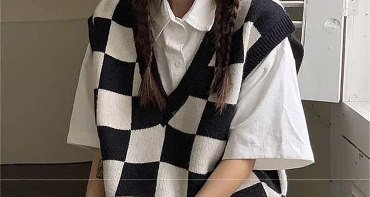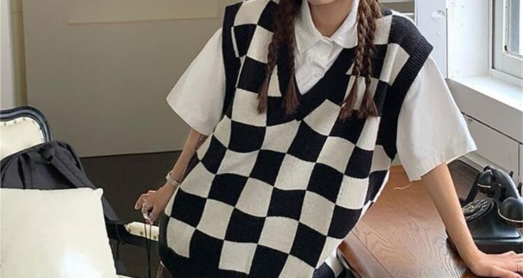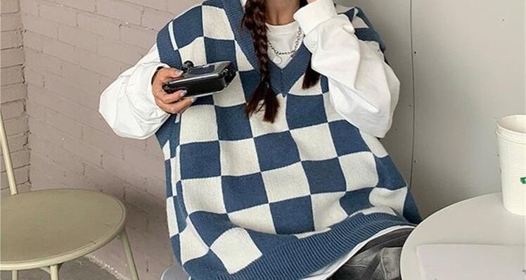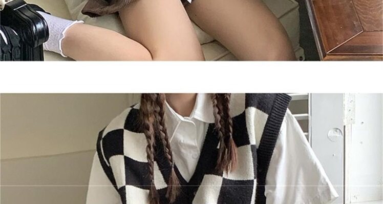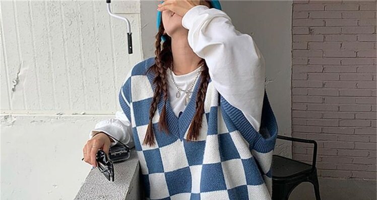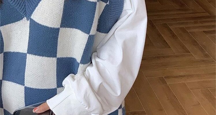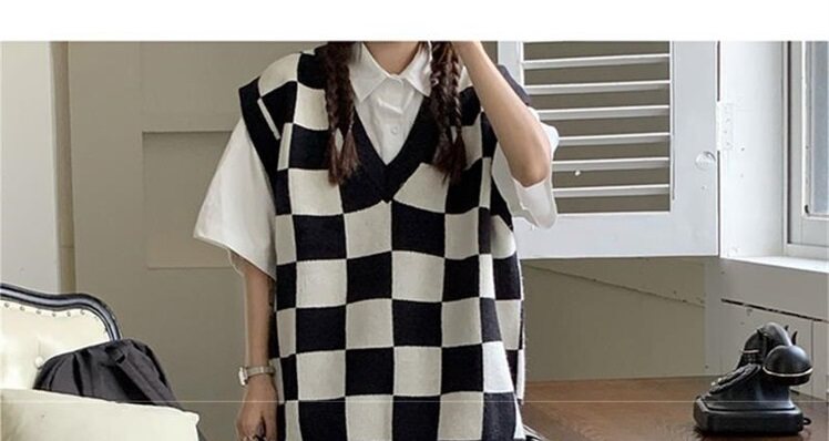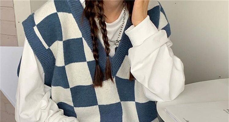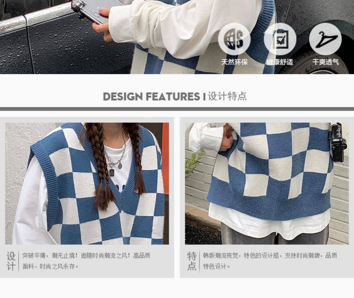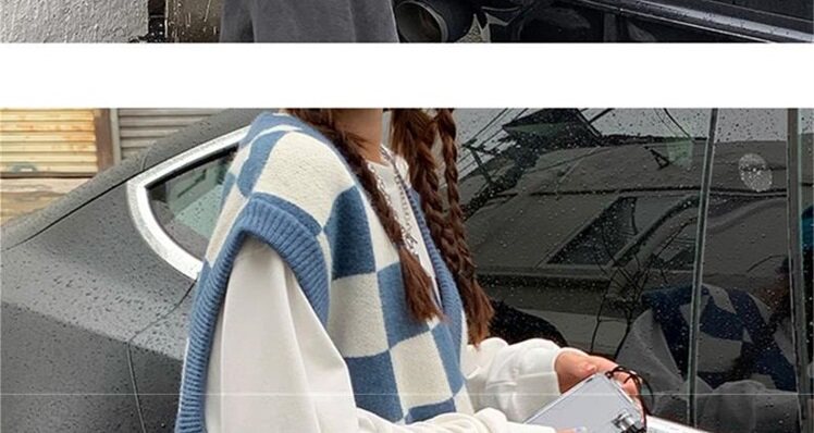 软奶格子毛衣背心女秋冬宽松慵懒风V领针织马甲春秋外穿学生百搭
