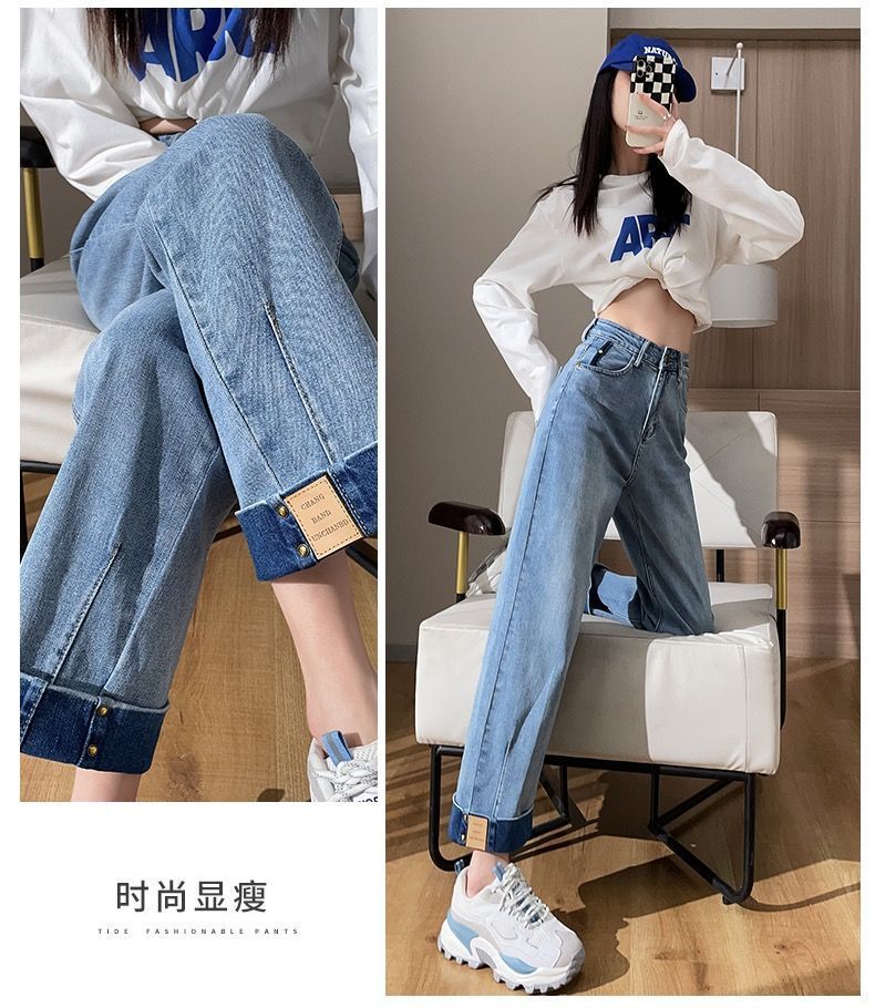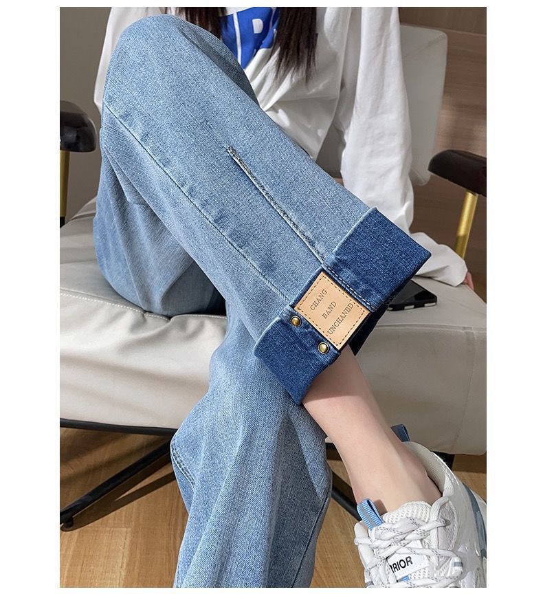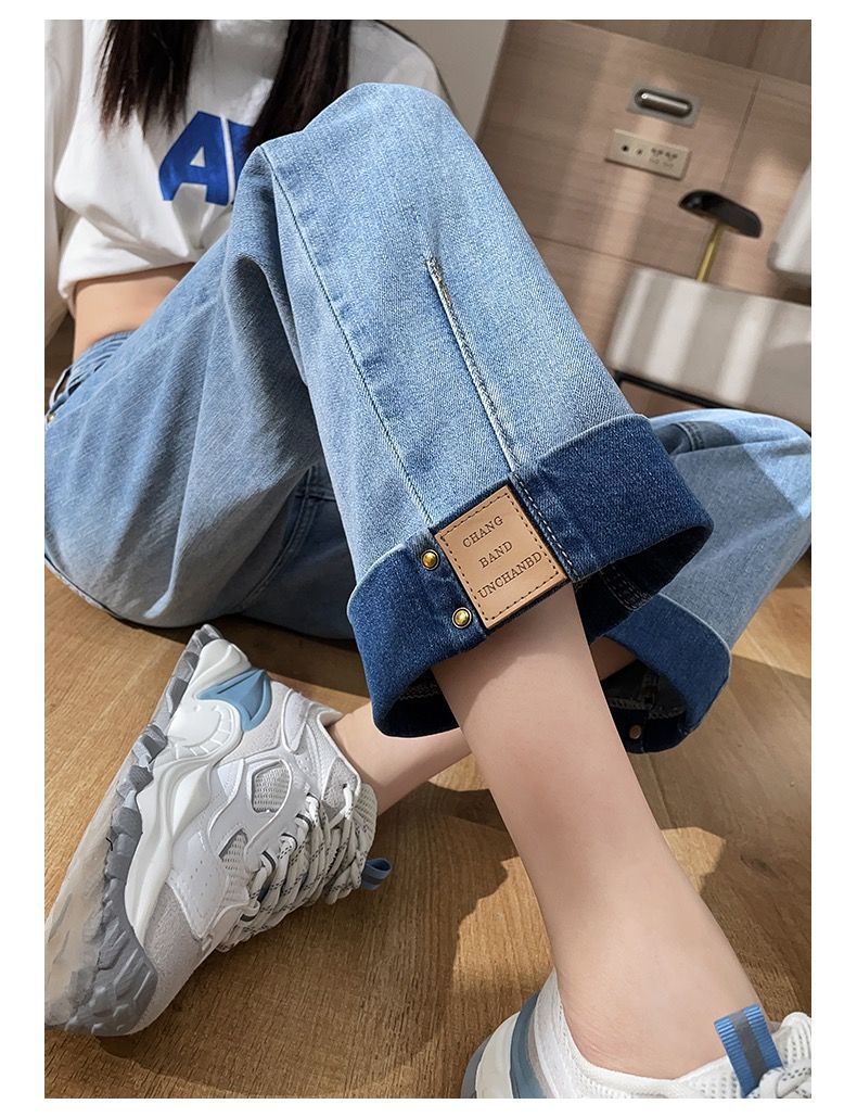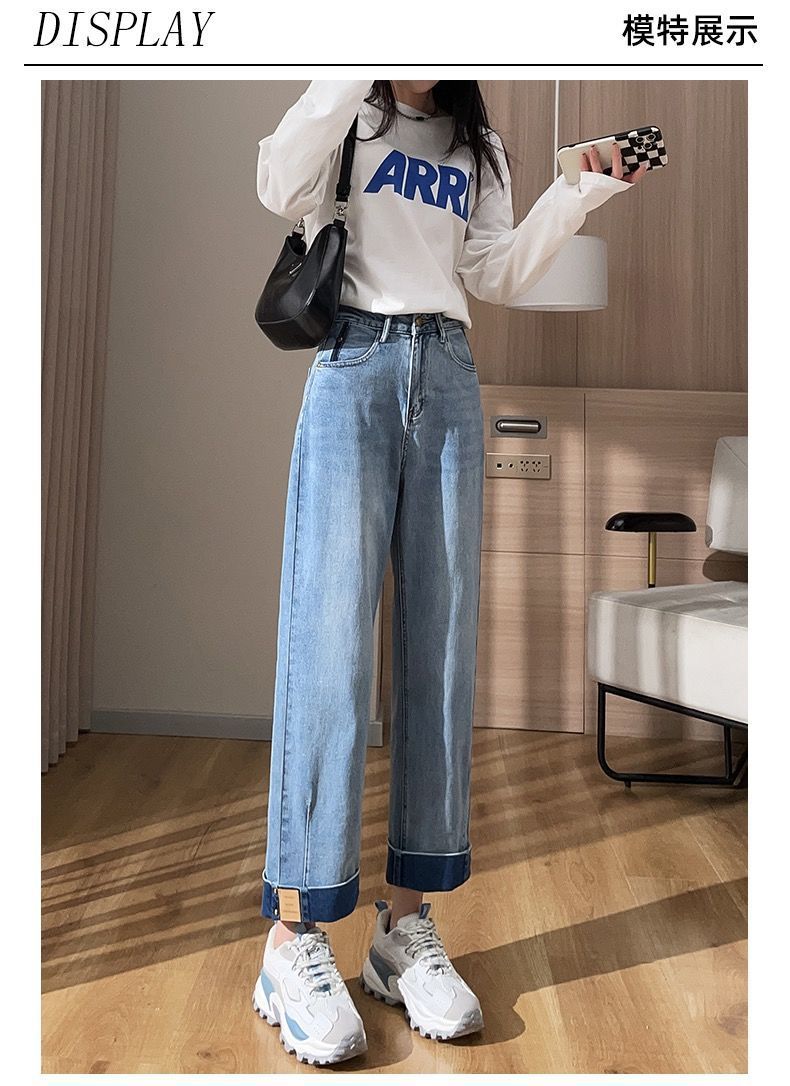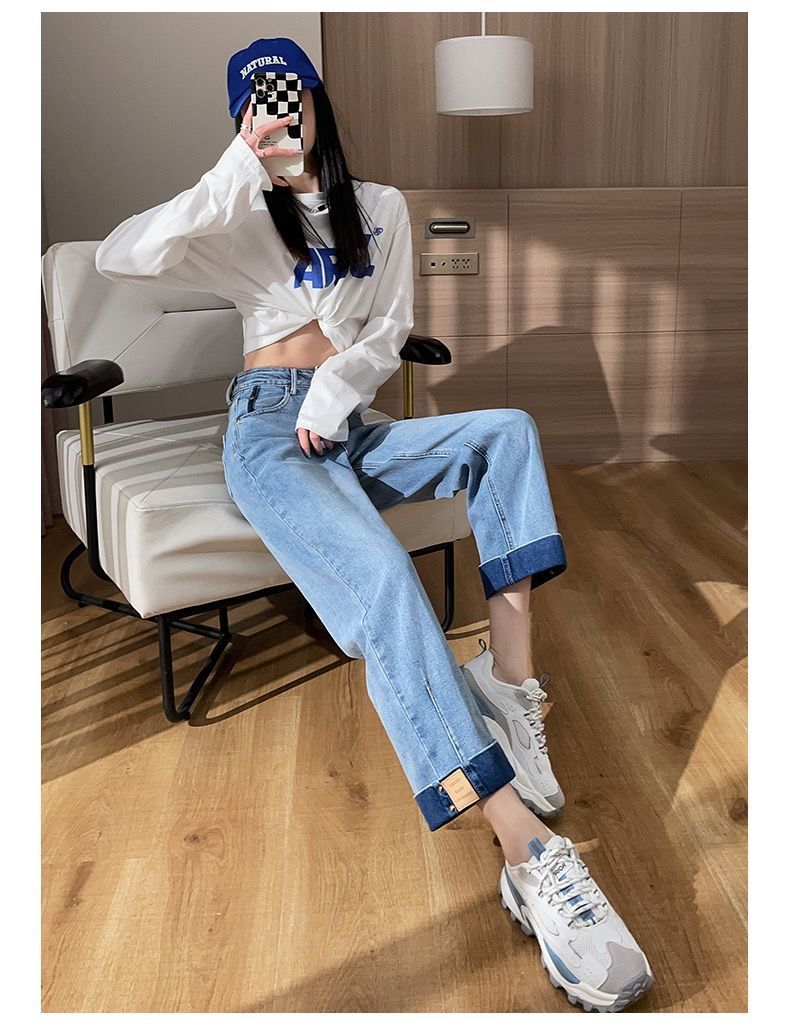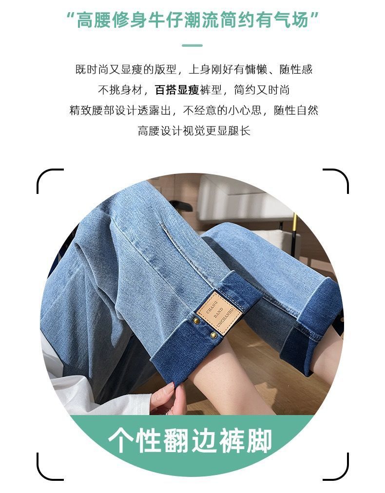 卷边牛仔裤女新款直筒烟管裤宽松显瘦翻边高腰九分裤小个子阔腿裤