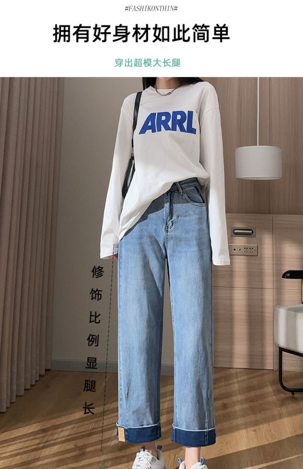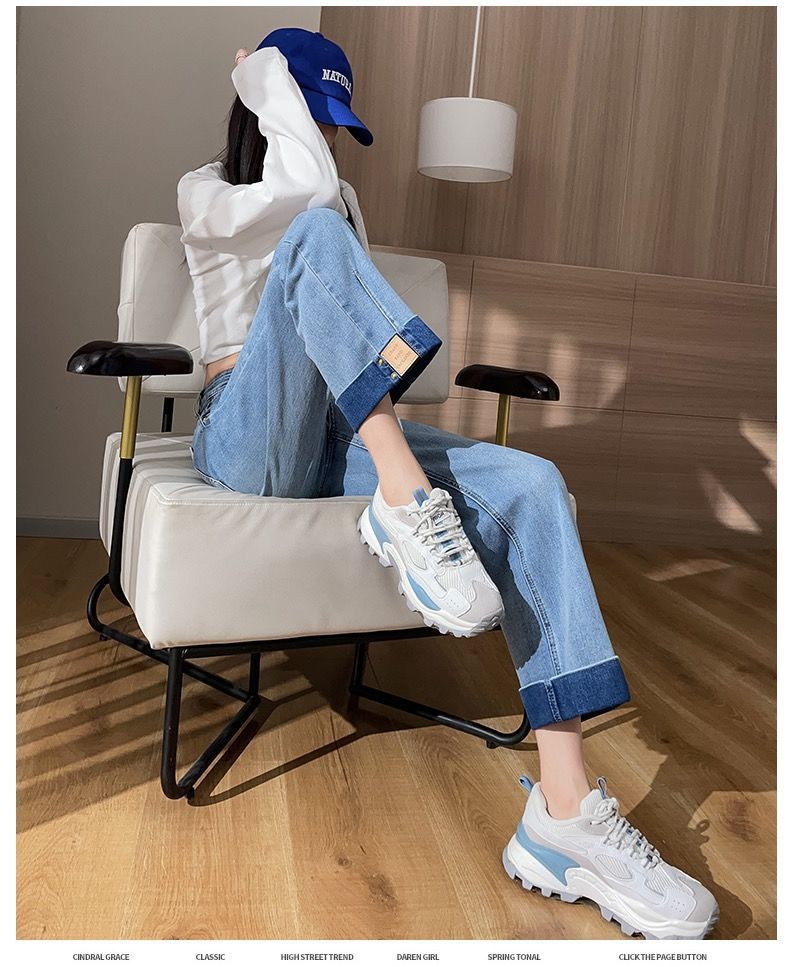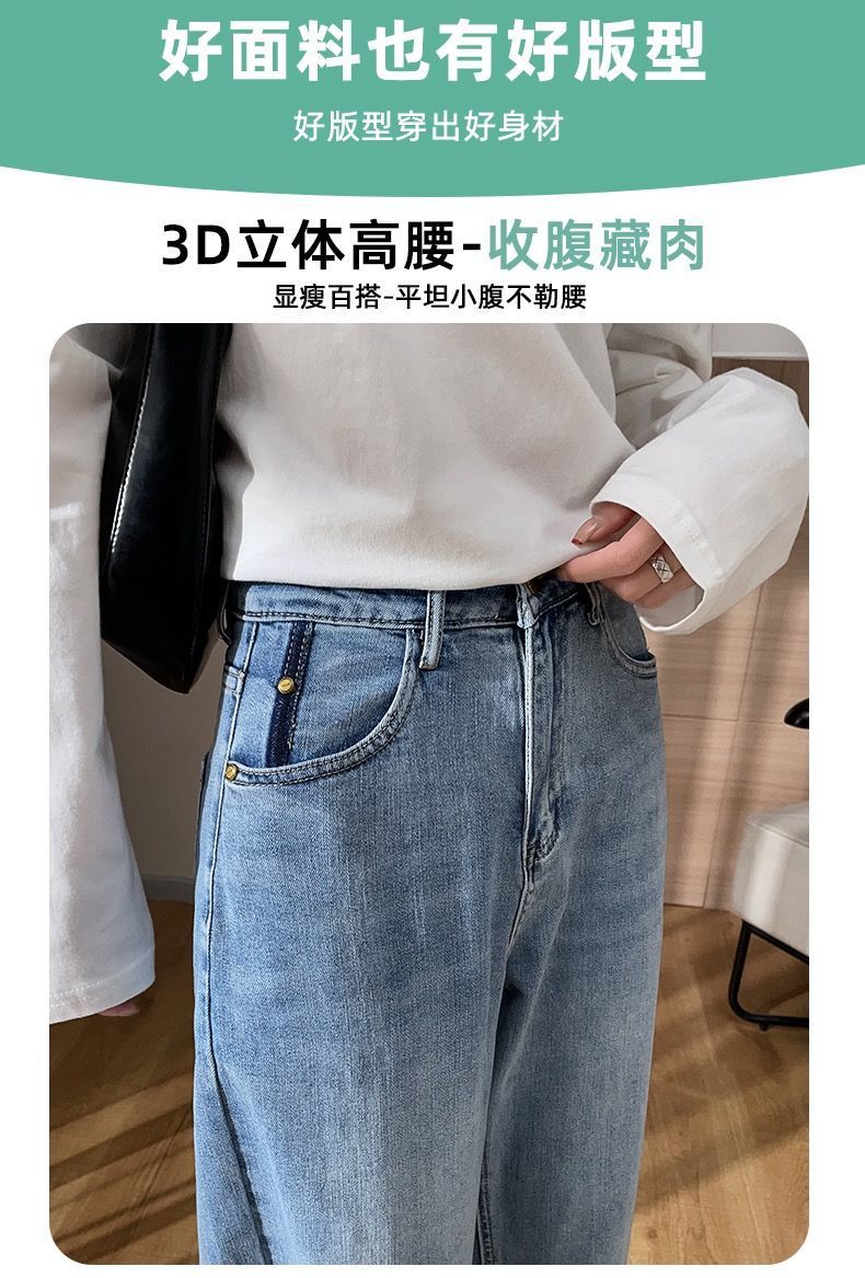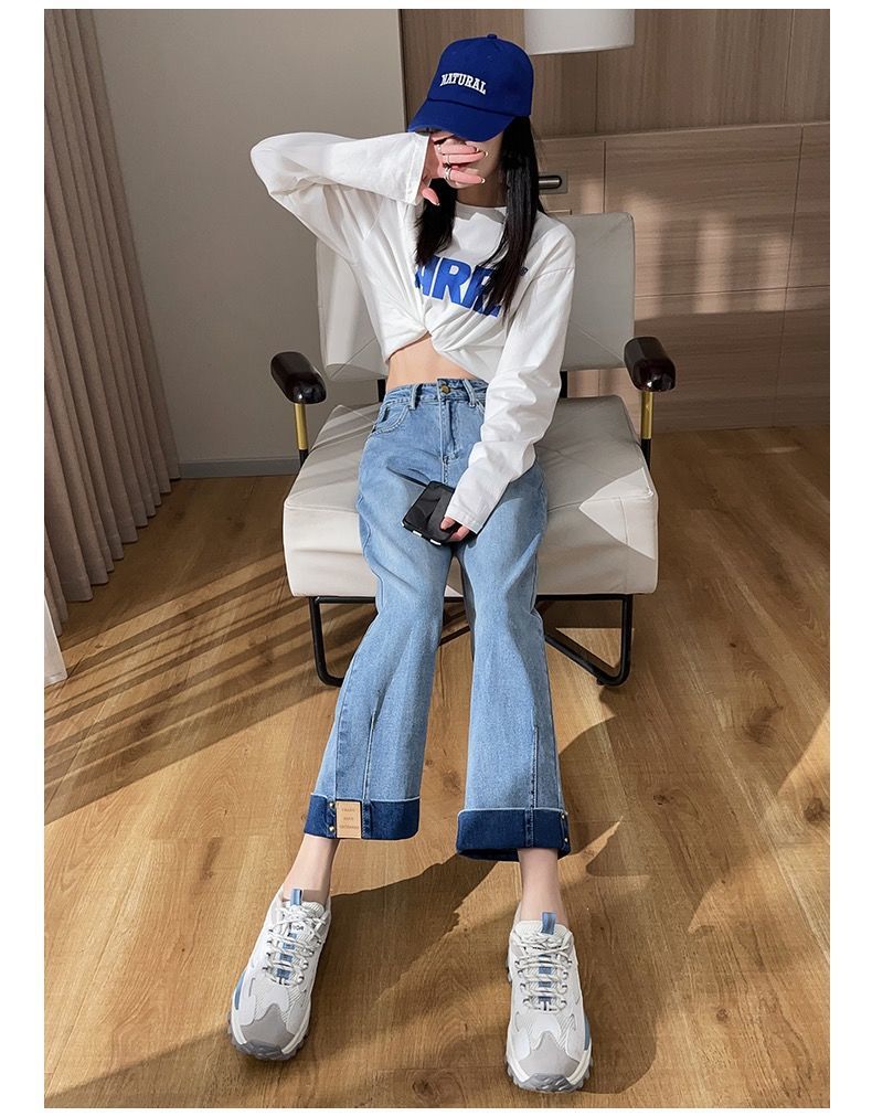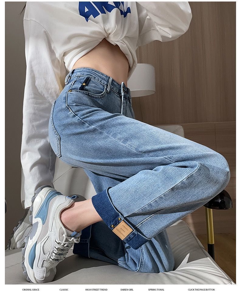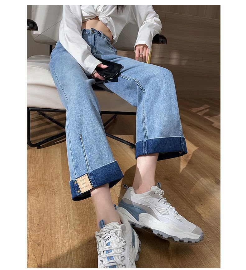 卷边牛仔裤女新款直筒烟管裤宽松显瘦翻边高腰九分裤小个子阔腿裤