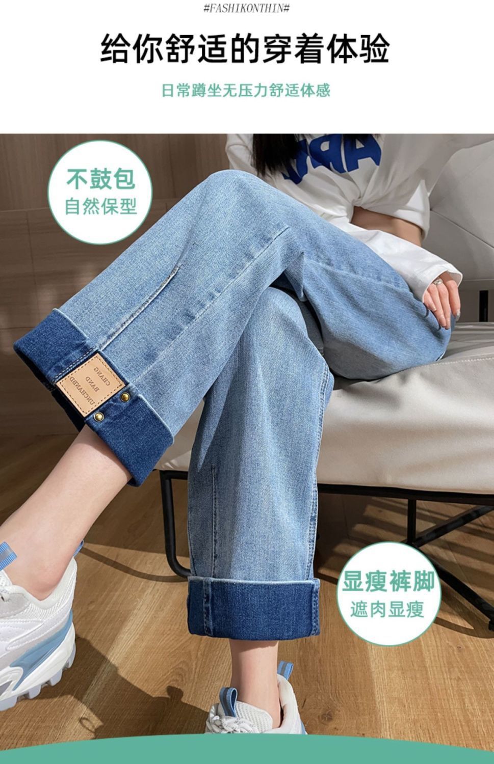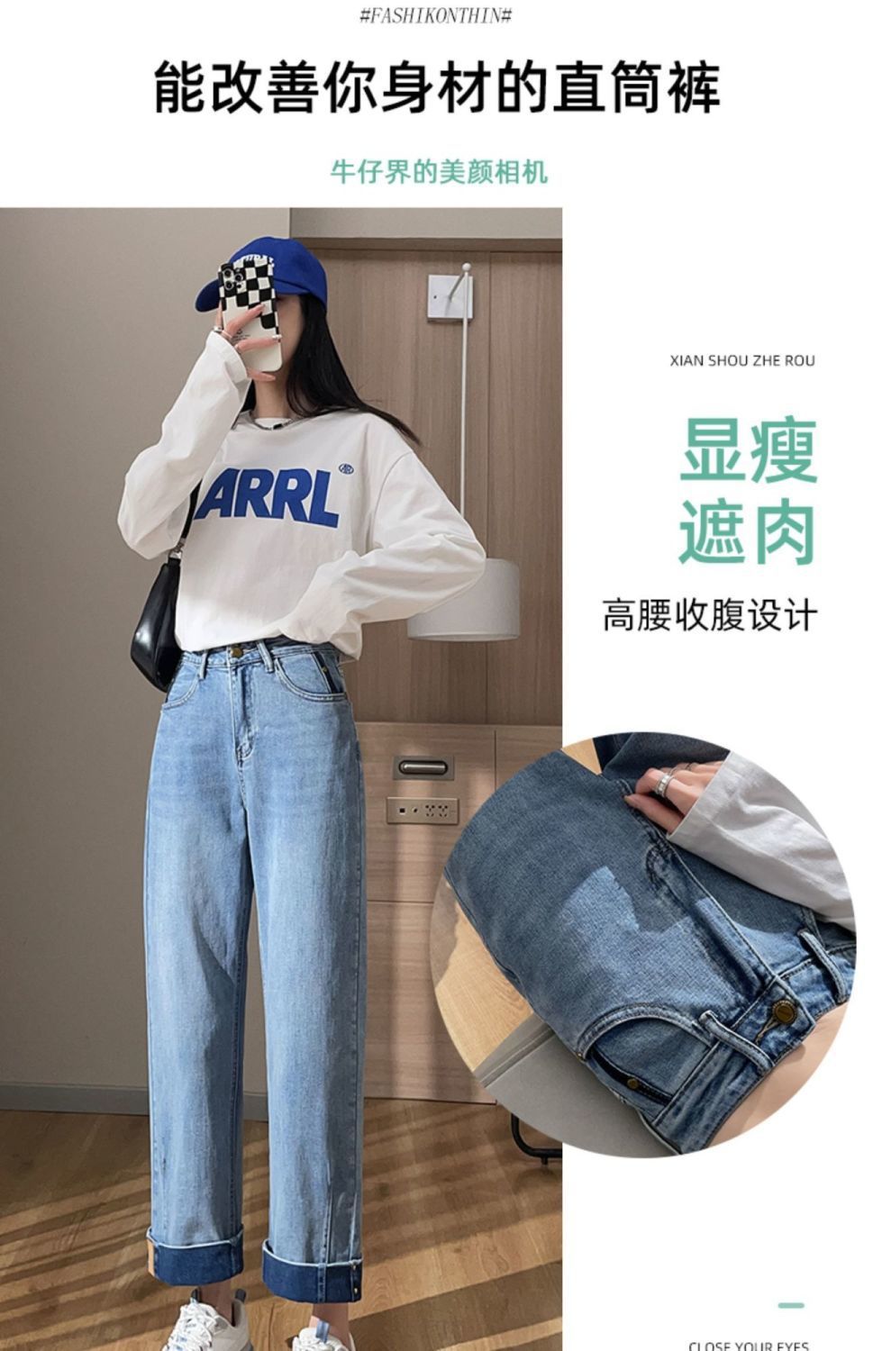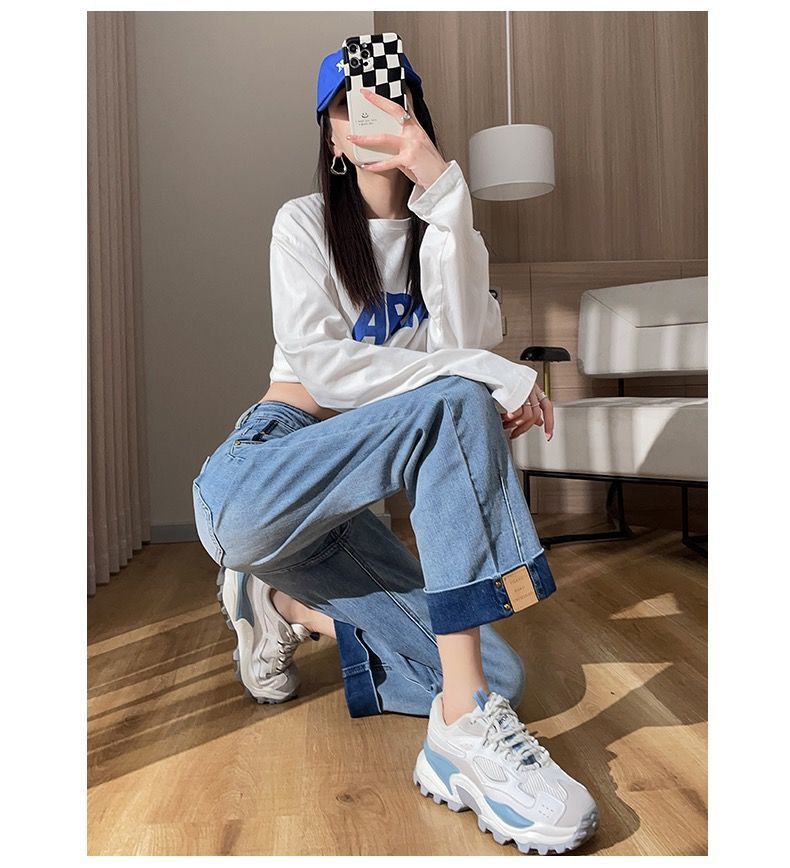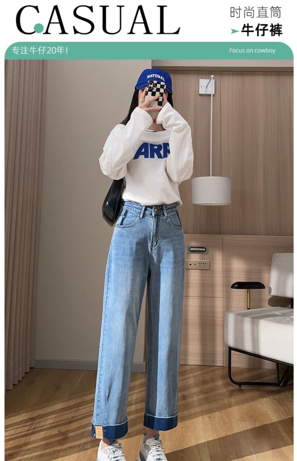 卷边牛仔裤女新款直筒烟管裤宽松显瘦翻边高腰九分裤小个子阔腿裤