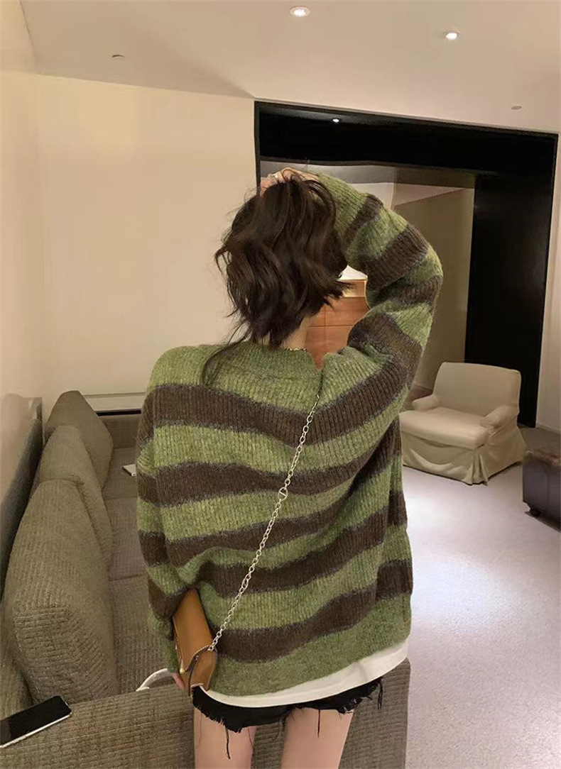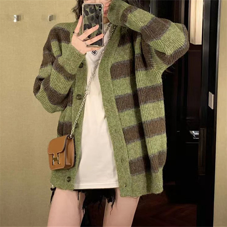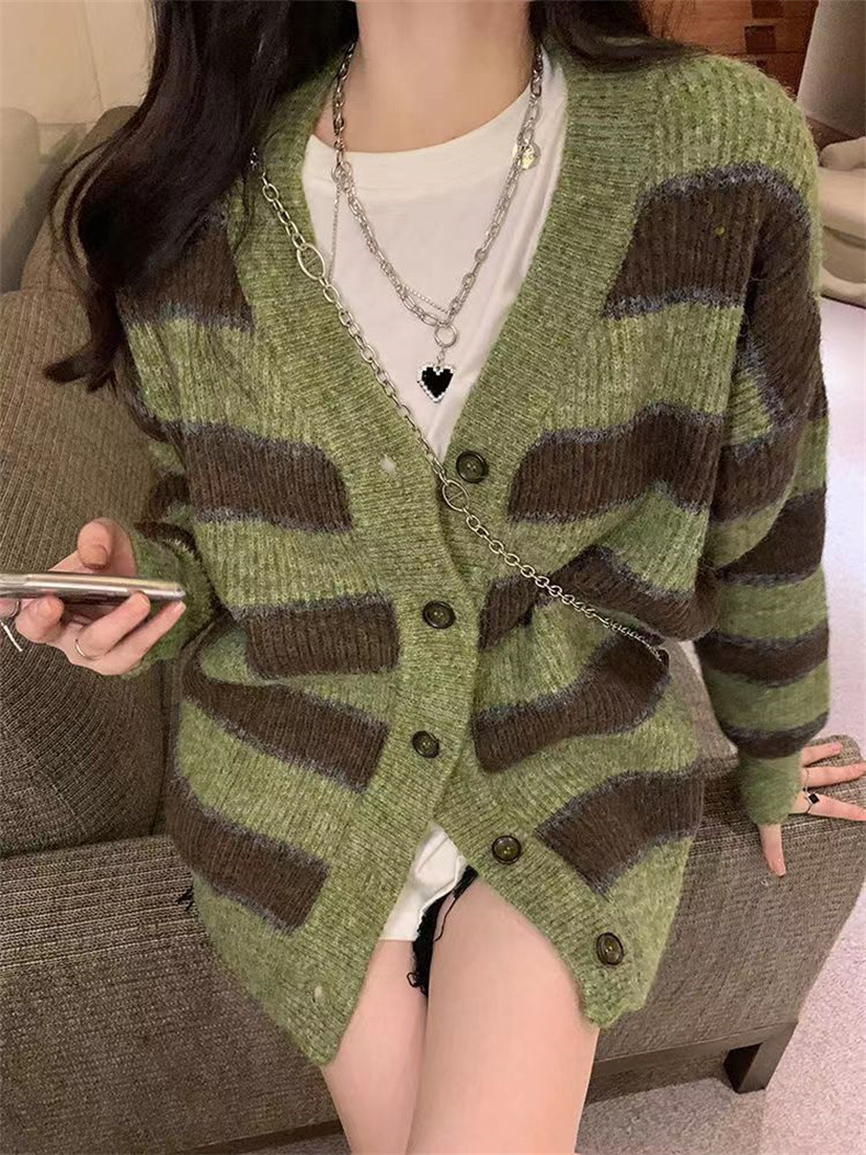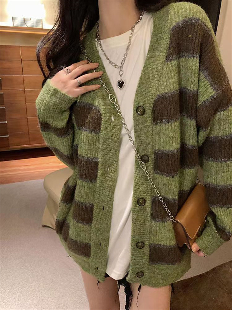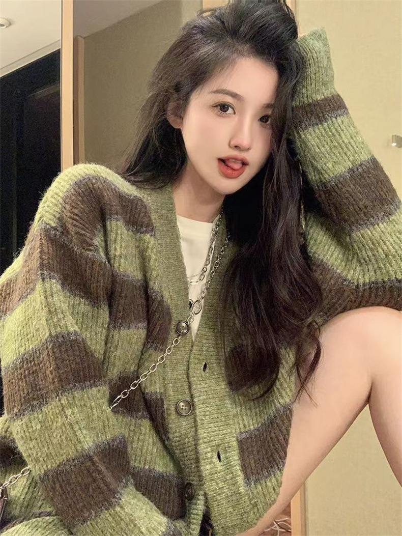 慵懒风撞色条纹毛衣女韩版设计感小众宽松休闲针织开衫外套上衣女