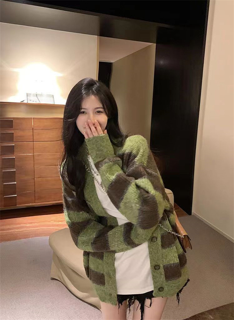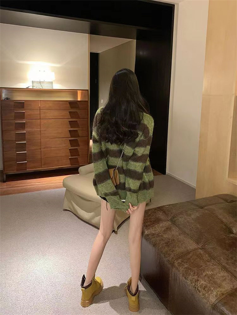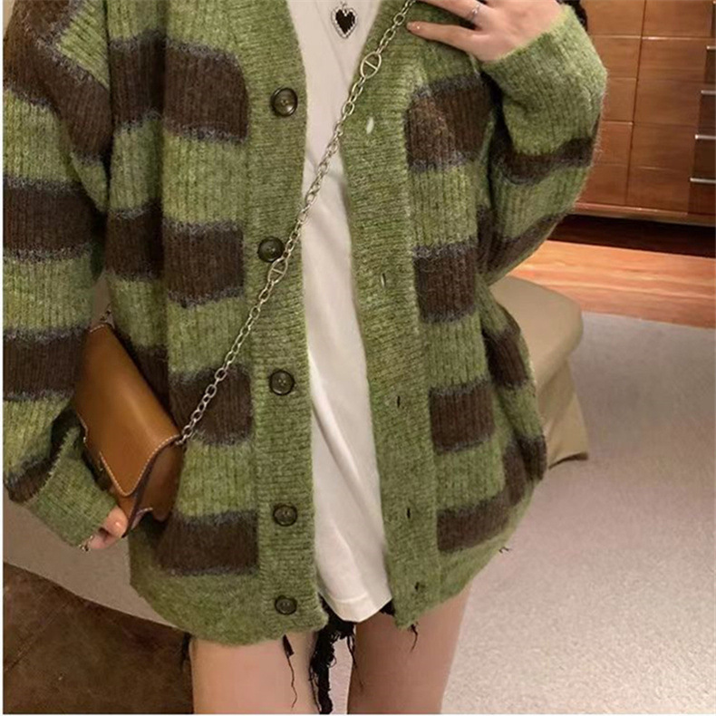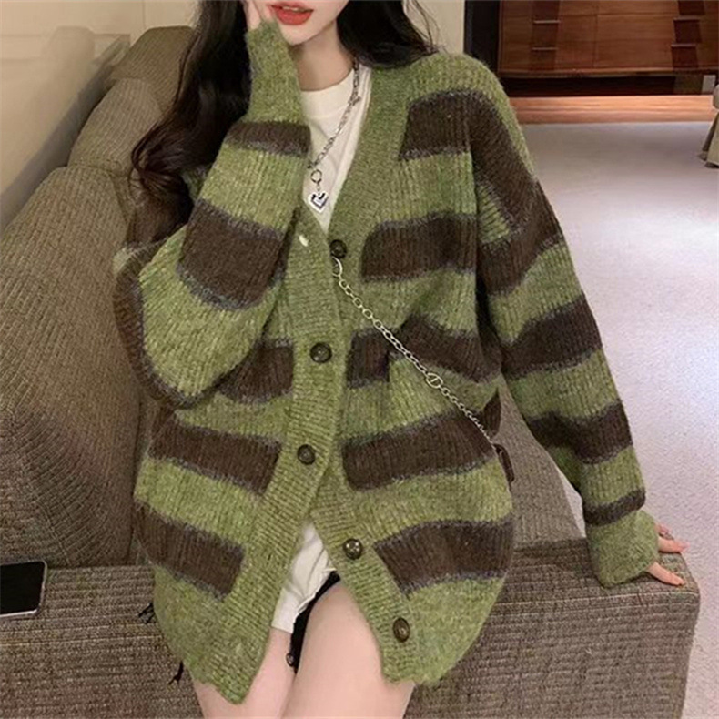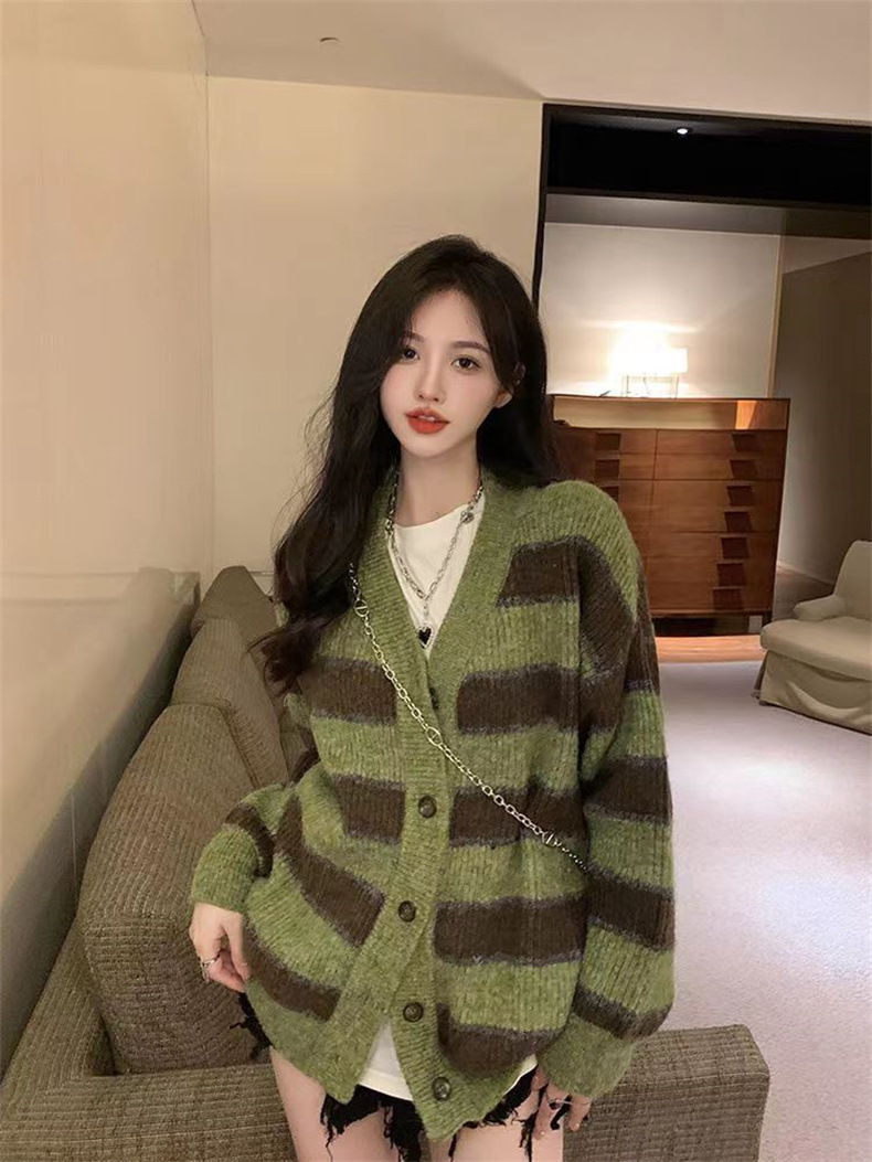慵懒风撞色条纹毛衣女韩版设计感小众宽松休闲针织开衫外套上衣女