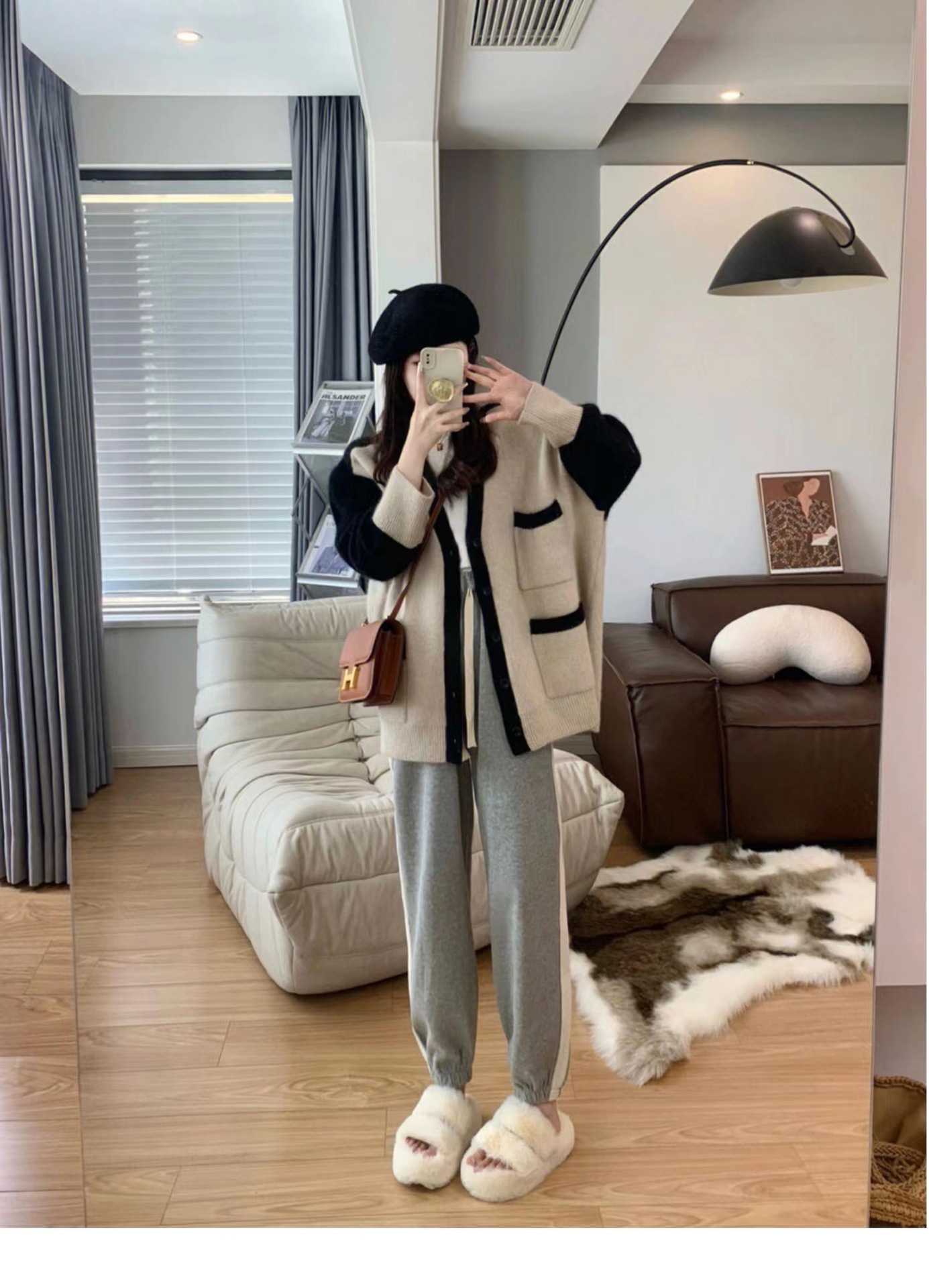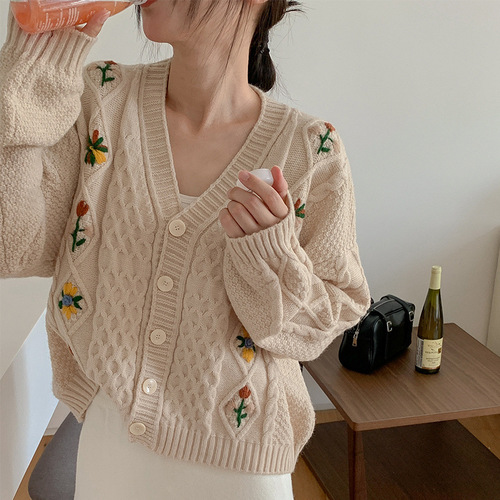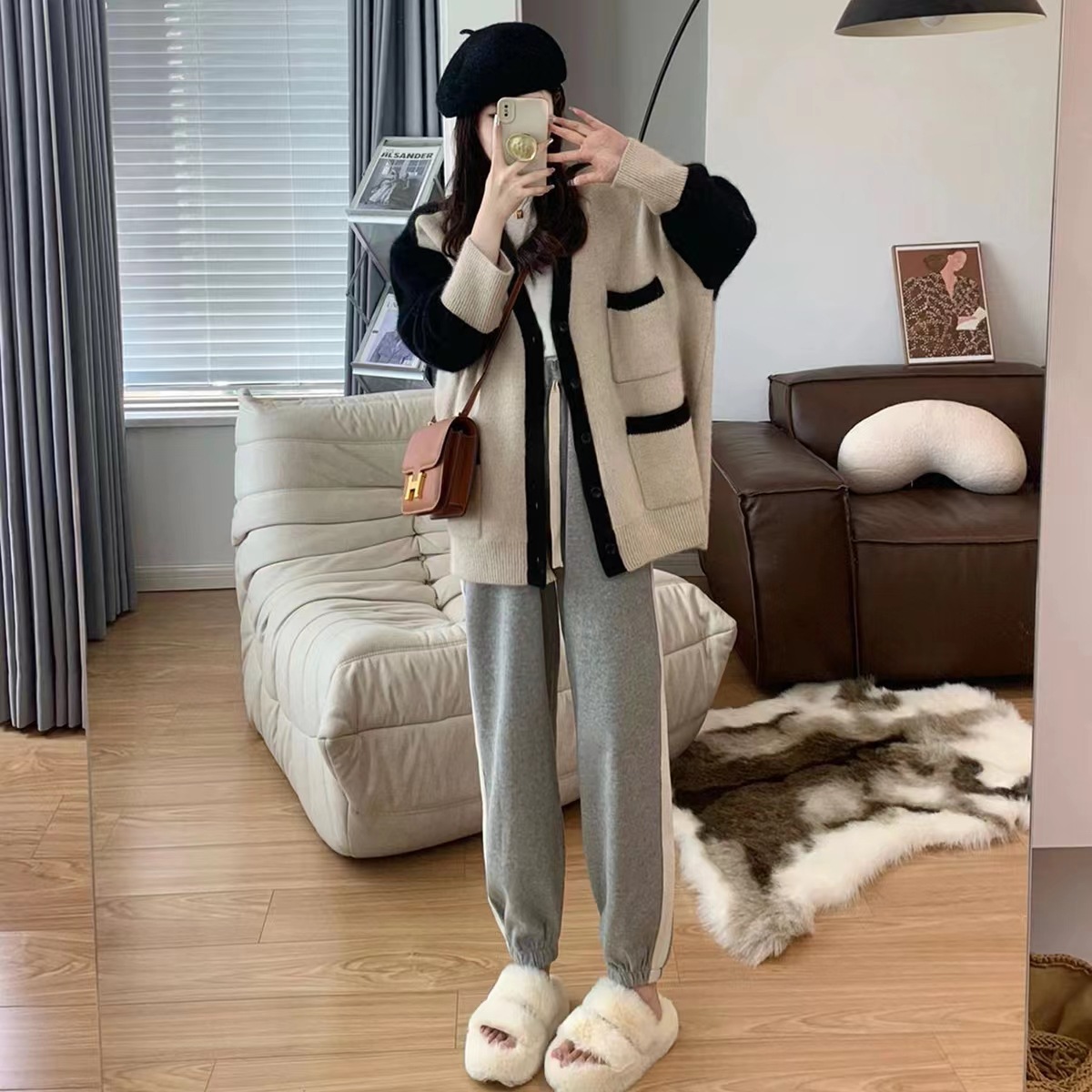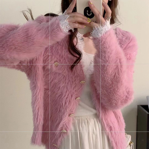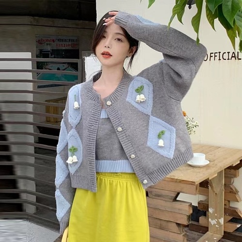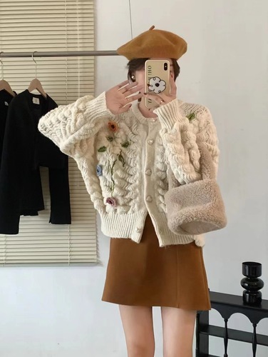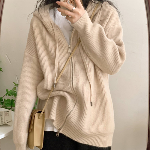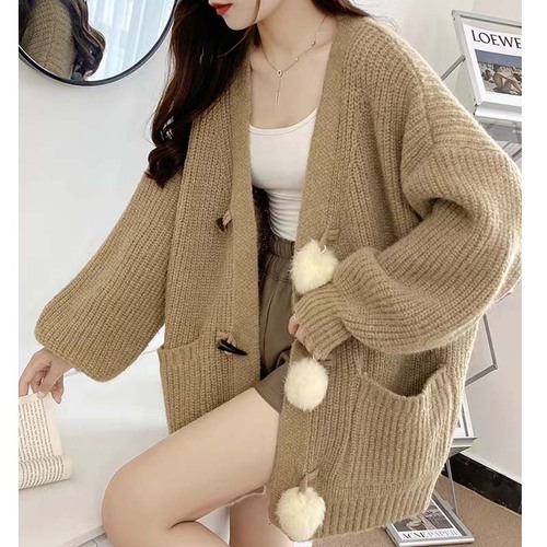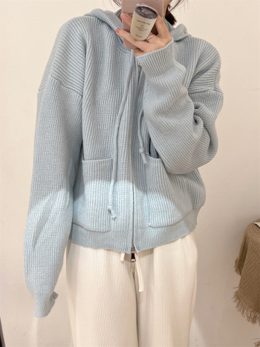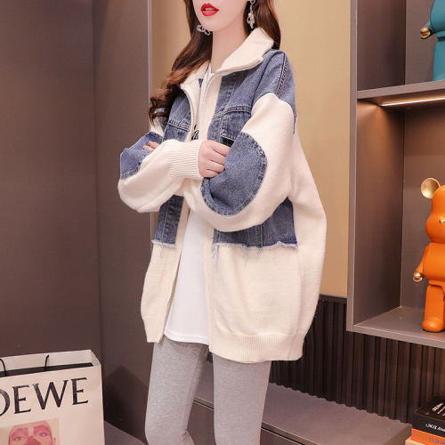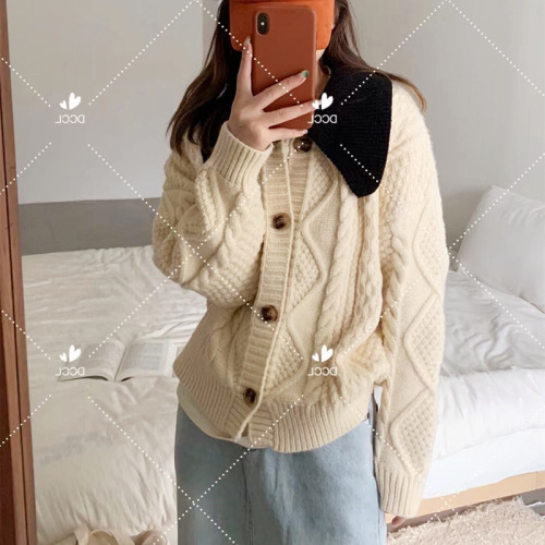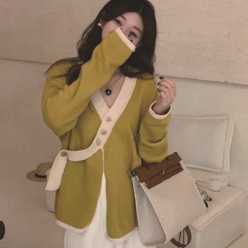 毛衣开衫外套女慵懒风秋冬新款韩版宽松设计感拼色口袋针织上衣潮