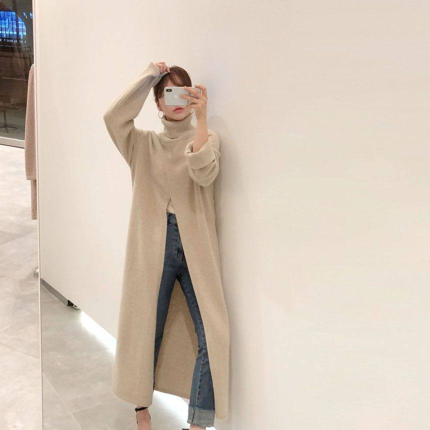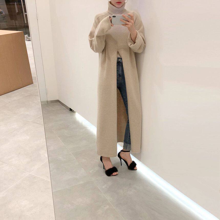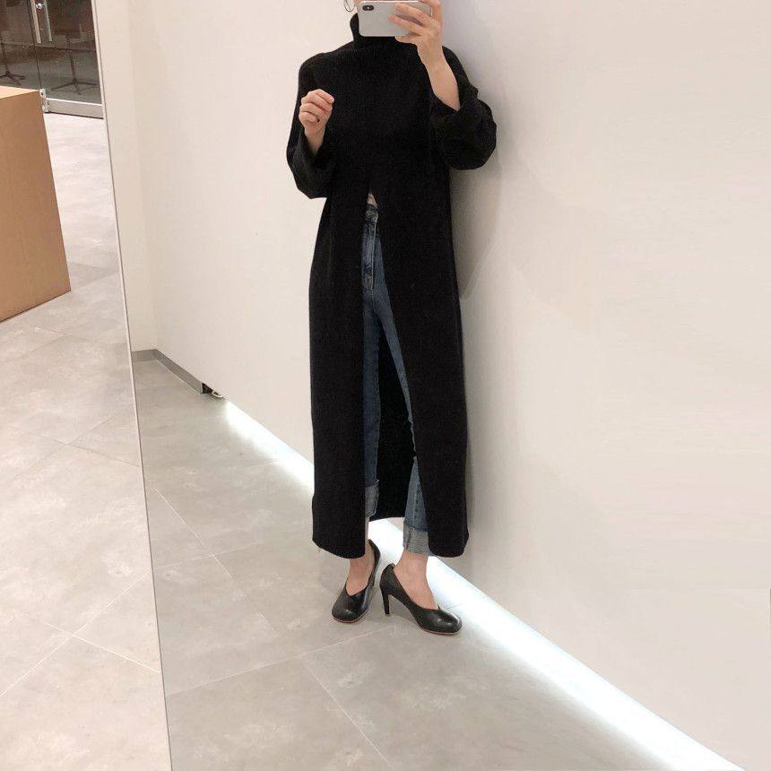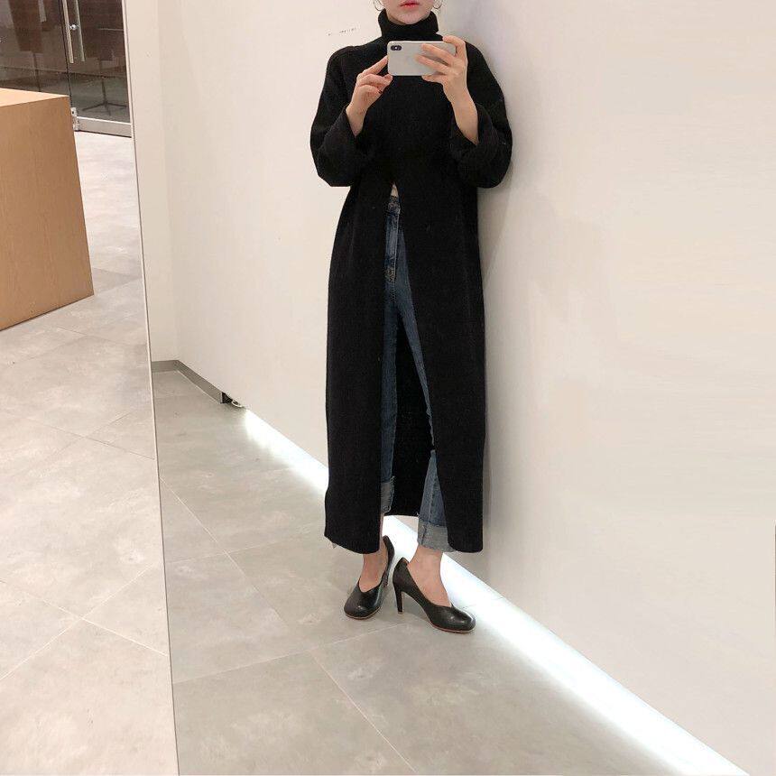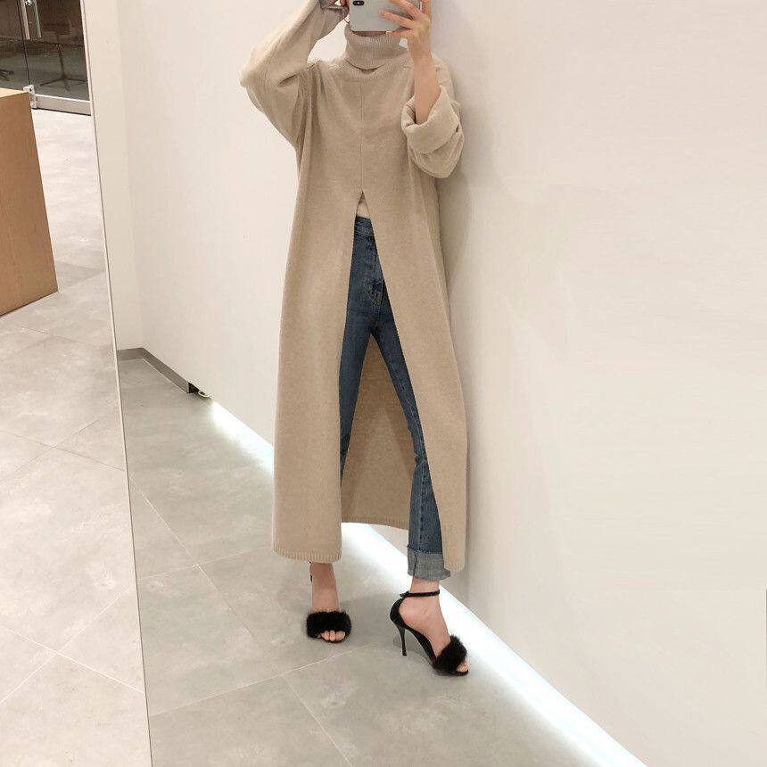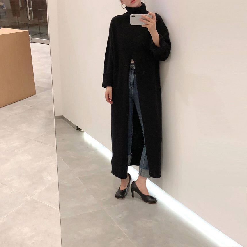 韩国chic秋冬小众设计高领套头宽松休闲开叉过膝长款针织衫毛衣女