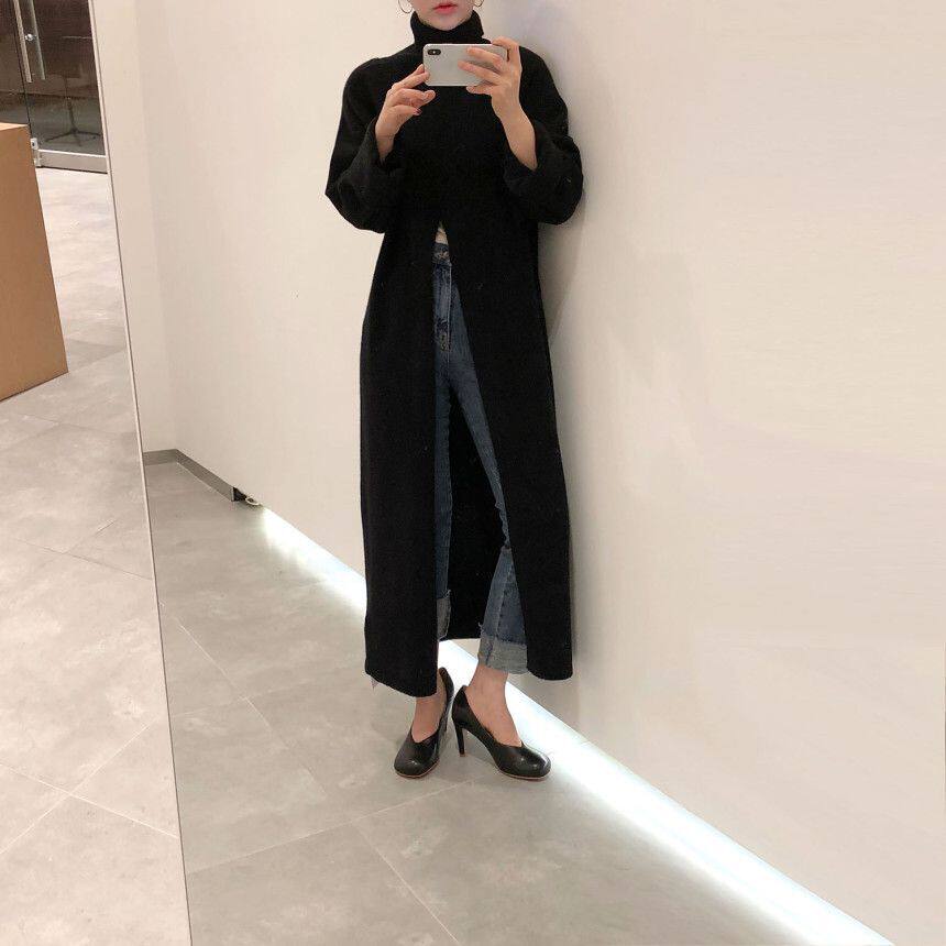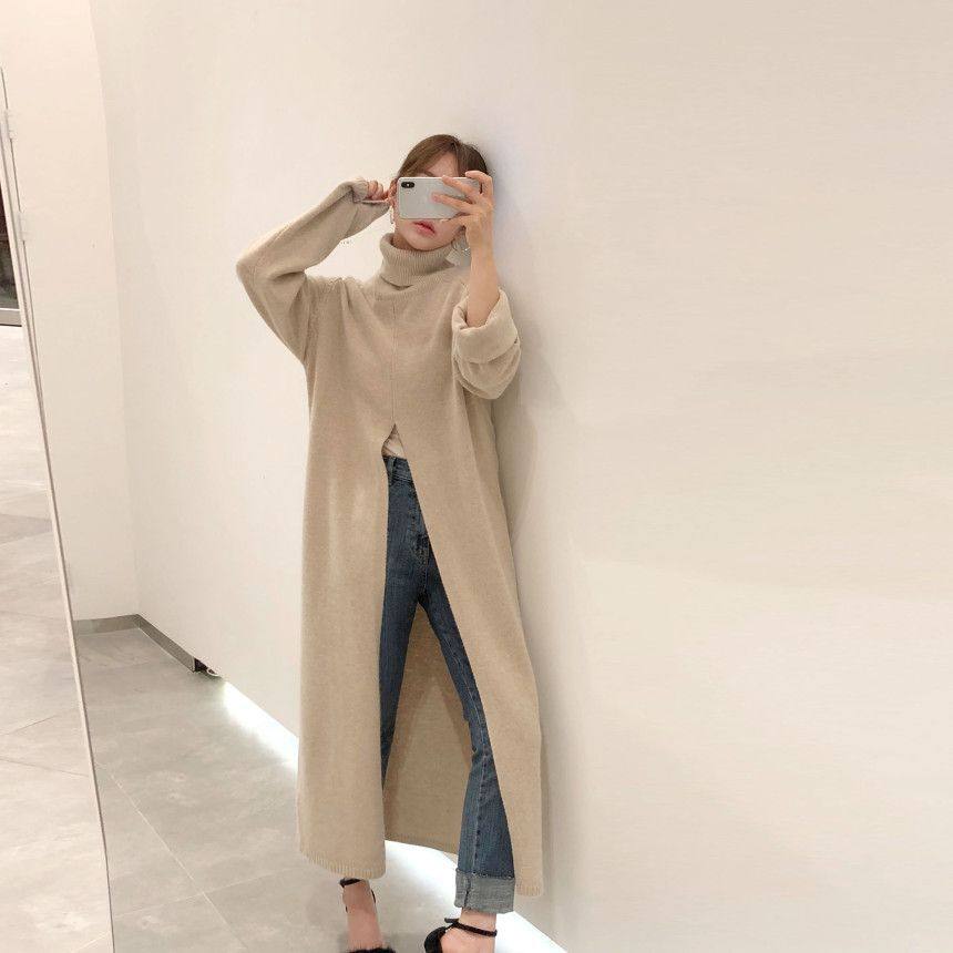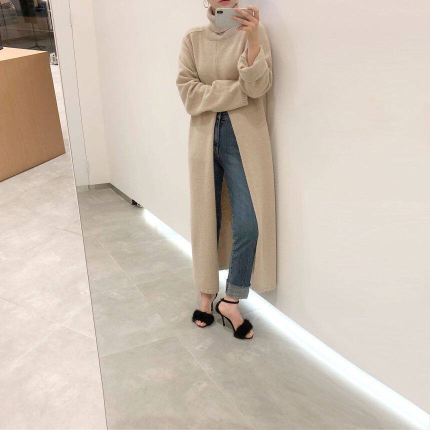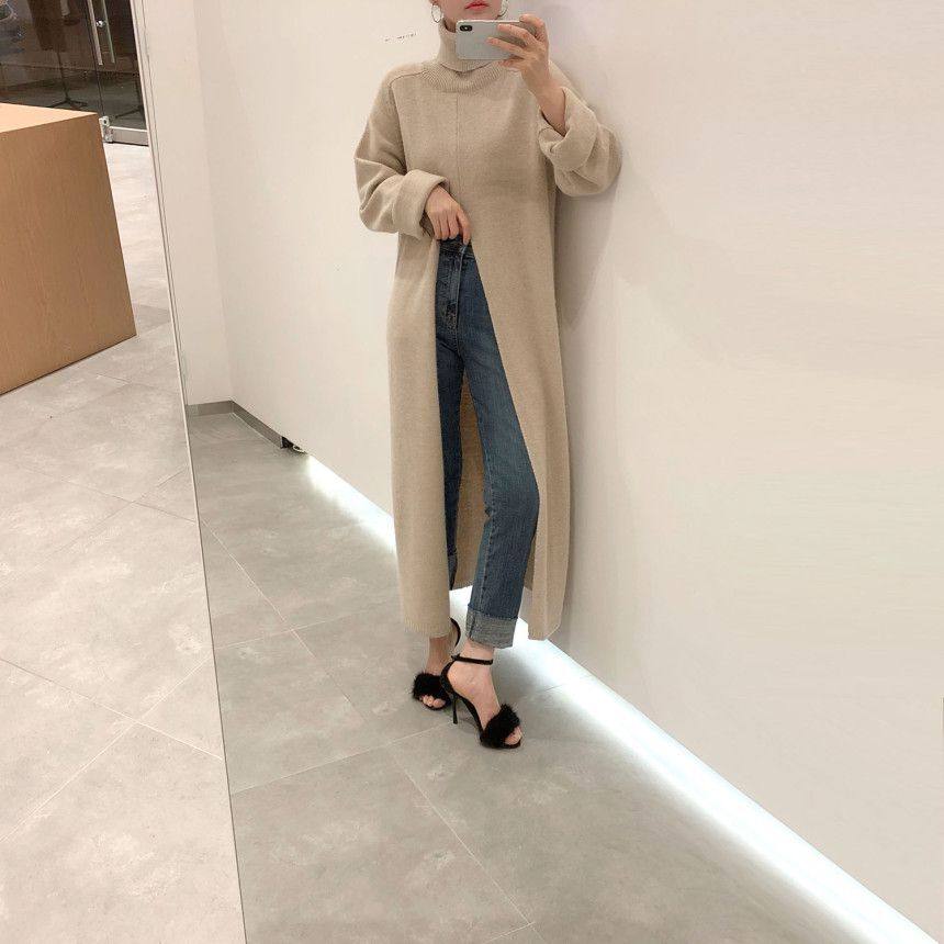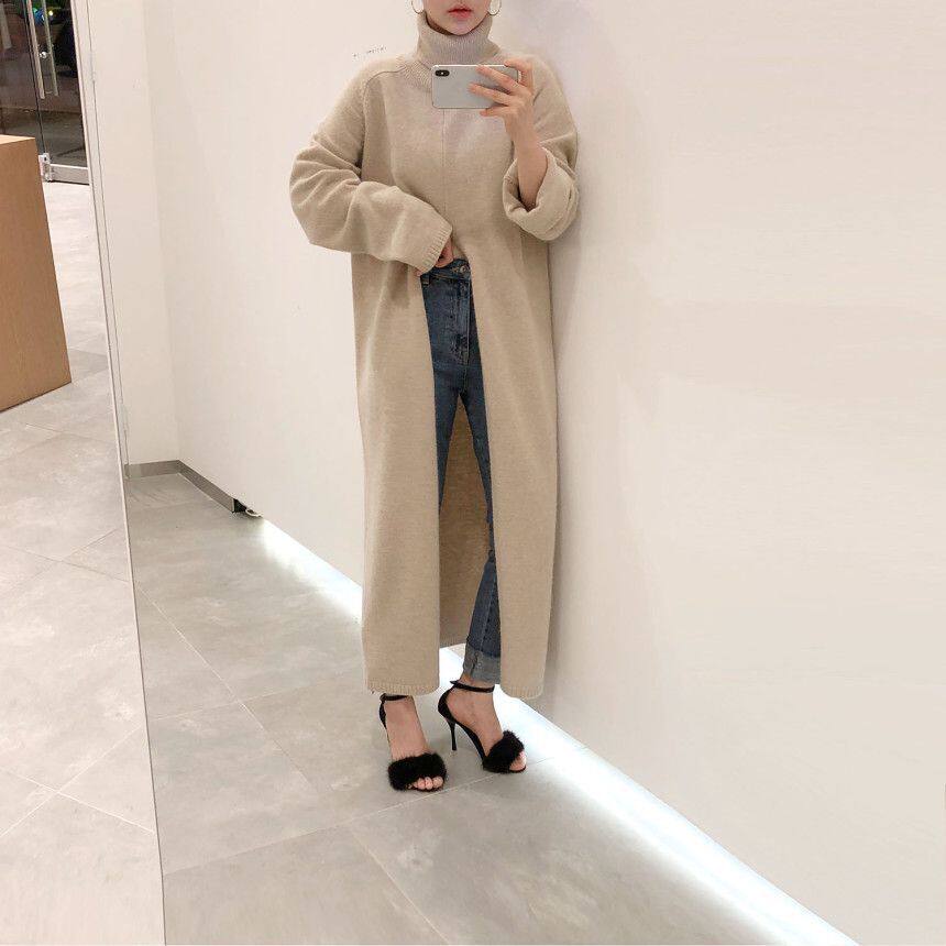韩国chic秋冬小众设计高领套头宽松休闲开叉过膝长款针织衫毛衣女