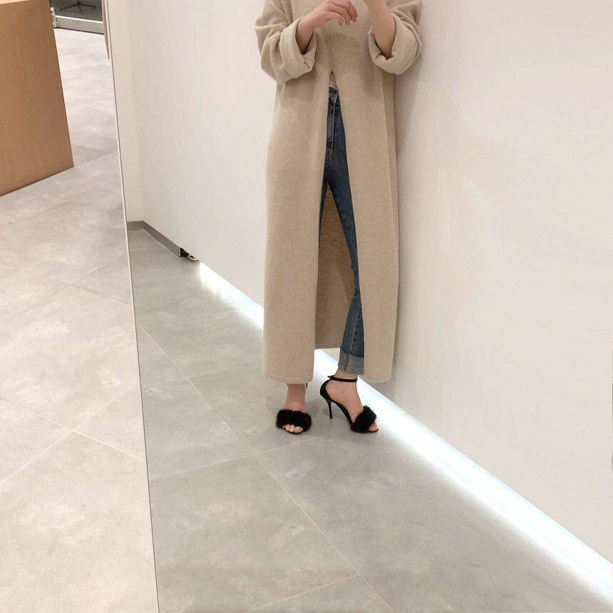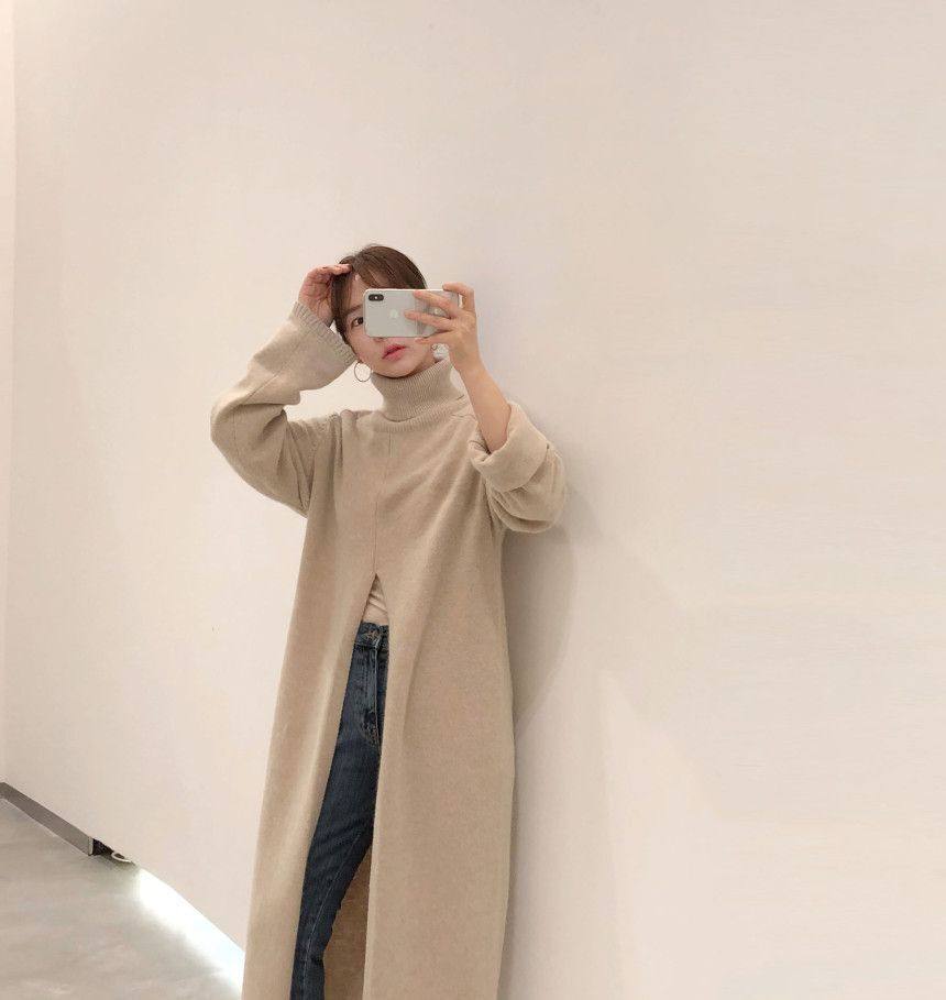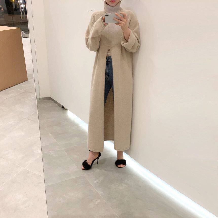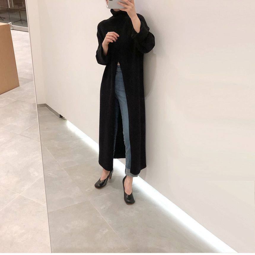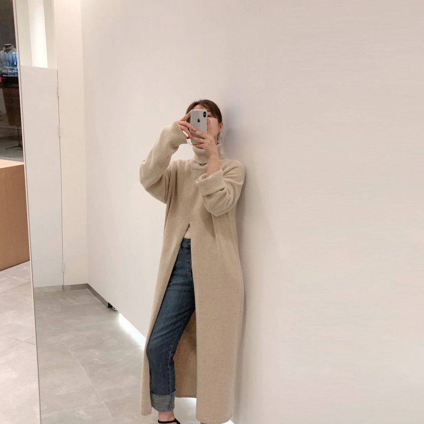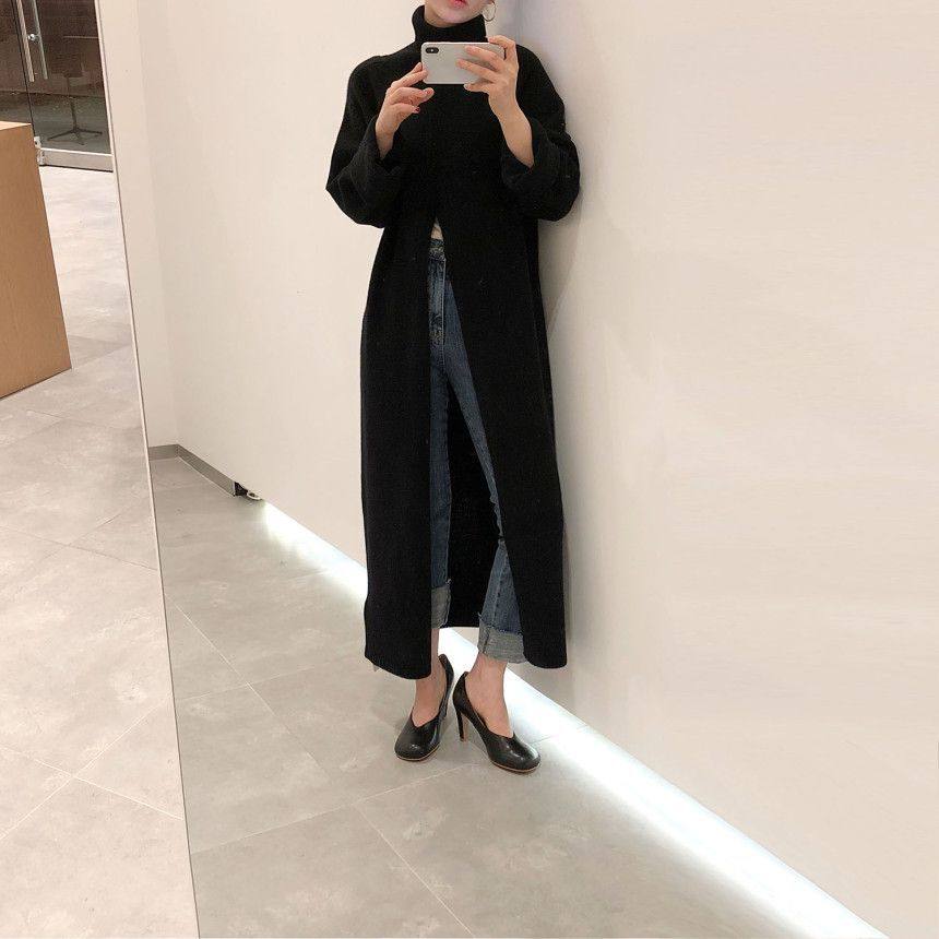 韩国chic秋冬小众设计高领套头宽松休闲开叉过膝长款针织衫毛衣女