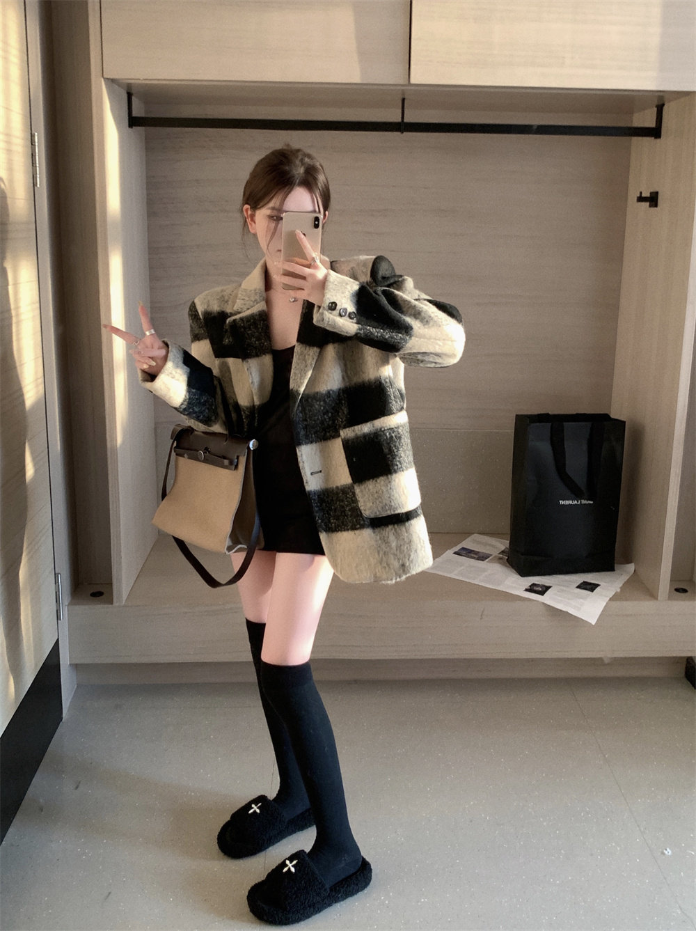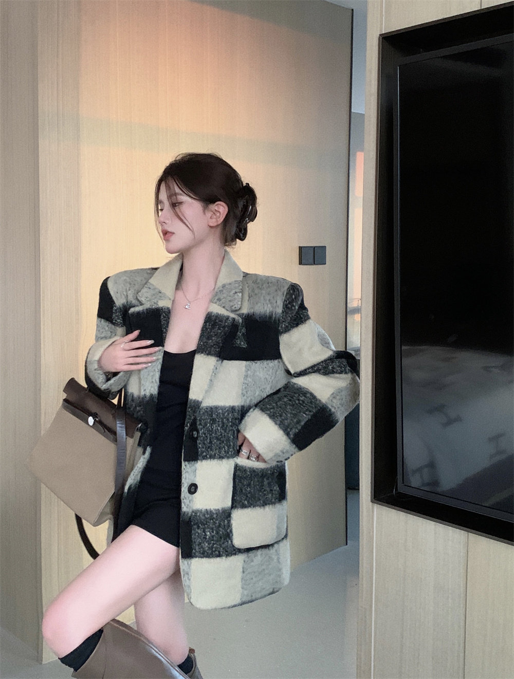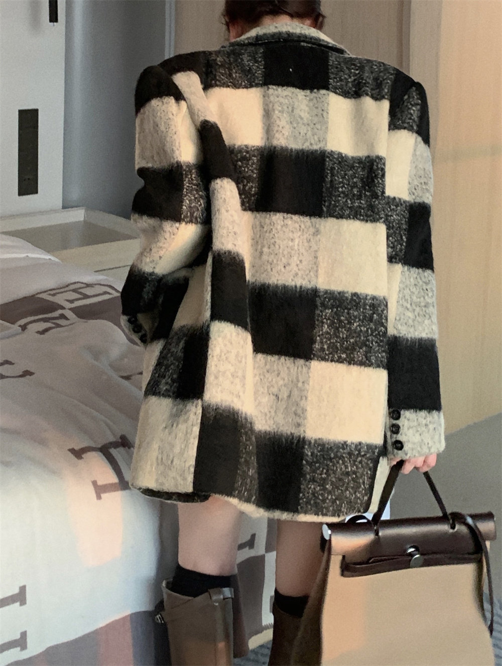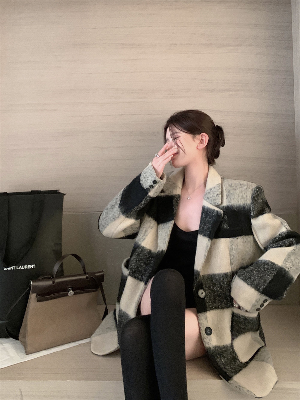 韩版格子毛呢西装外套女装秋冬赫本风复古加厚气质中长款呢子大衣