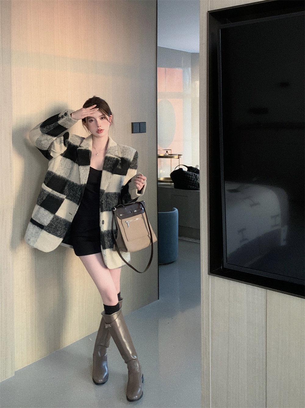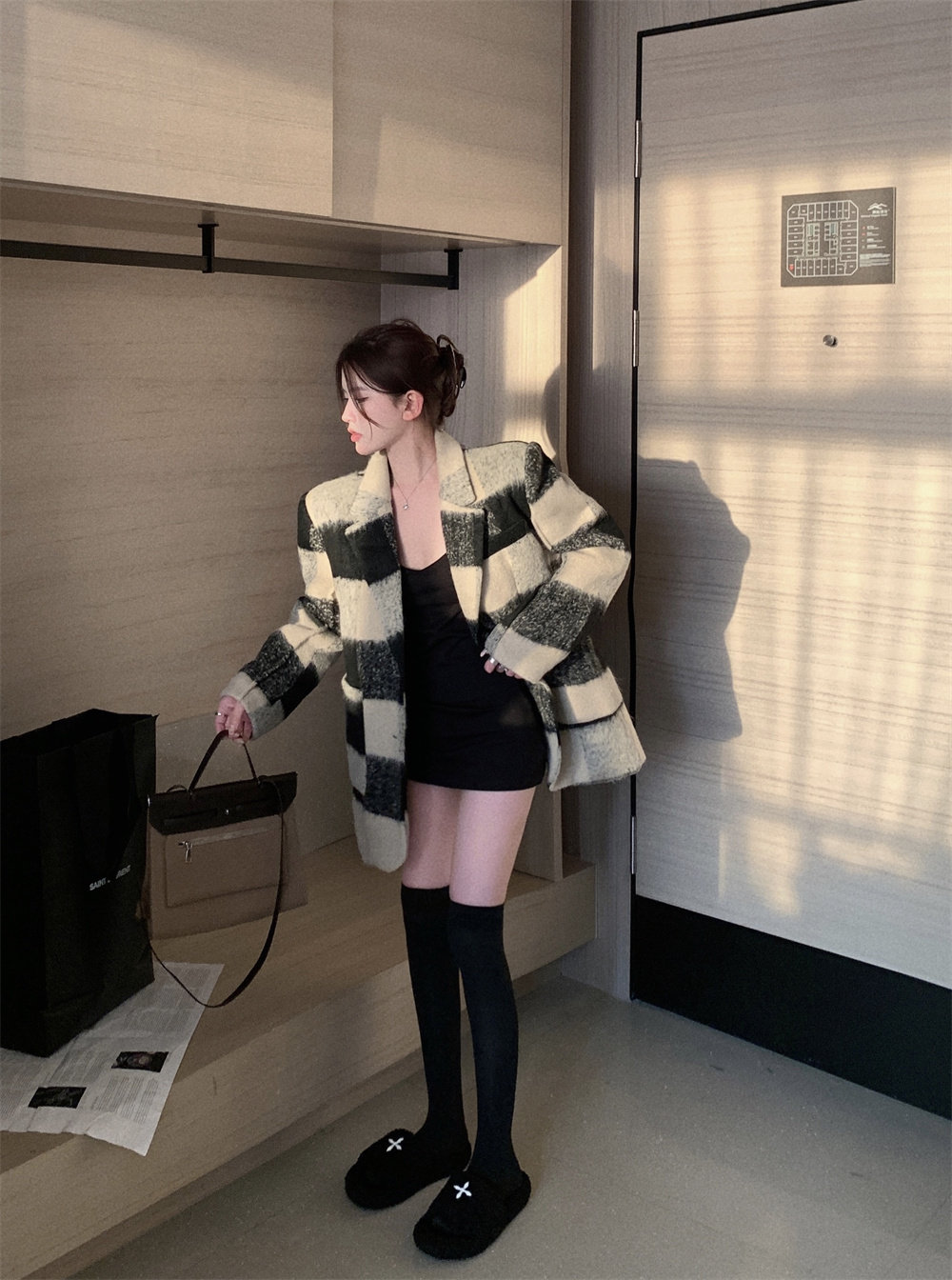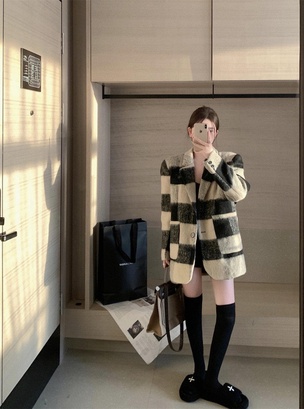韩版格子毛呢西装外套女装秋冬赫本风复古加厚气质中长款呢子大衣