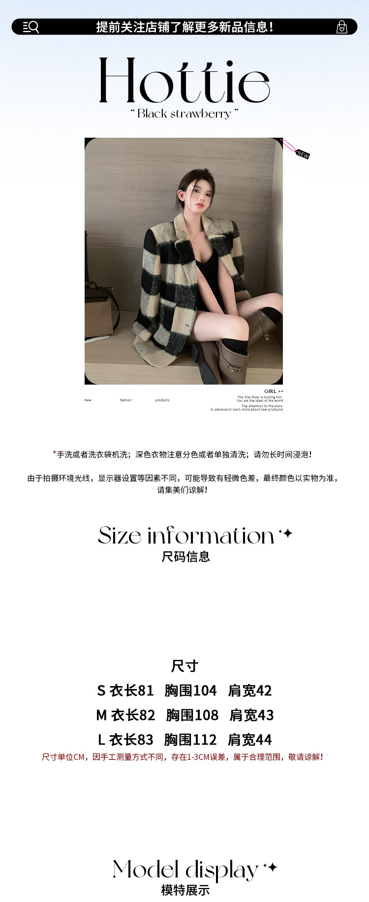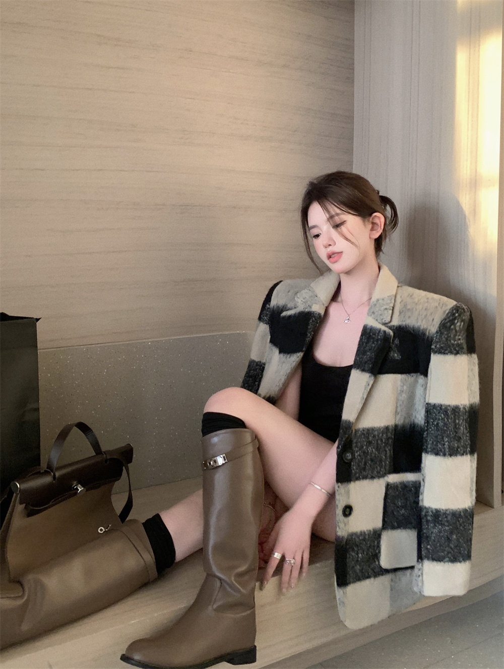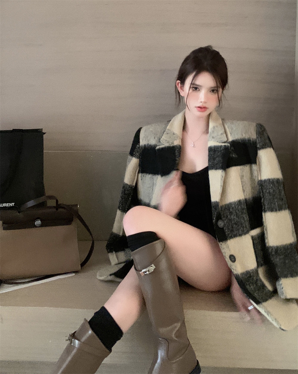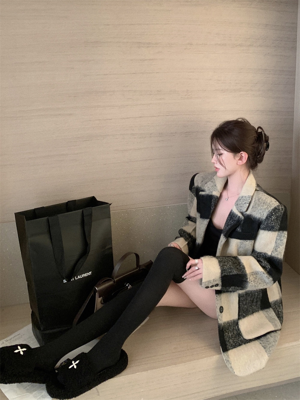 韩版格子毛呢西装外套女装秋冬赫本风复古加厚气质中长款呢子大衣