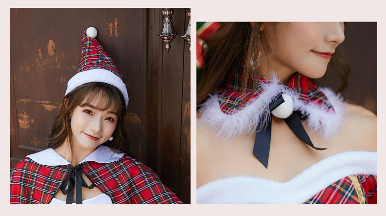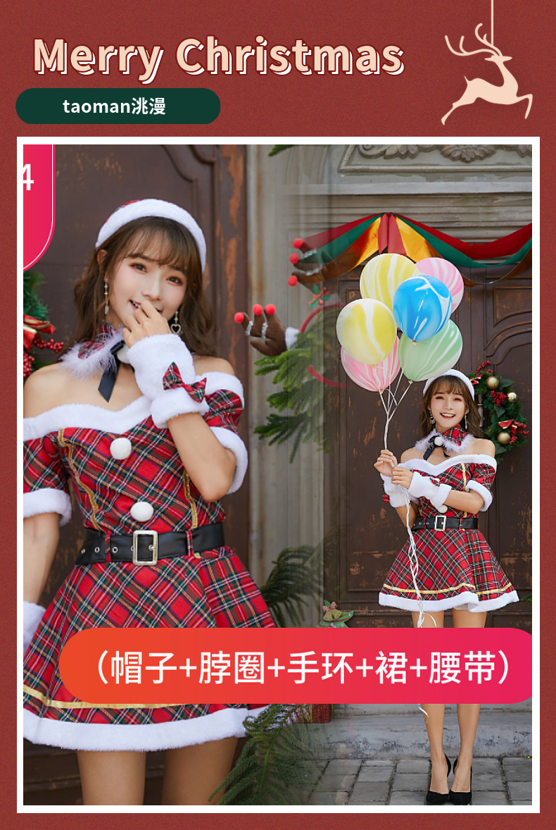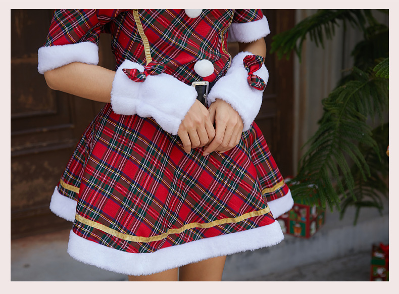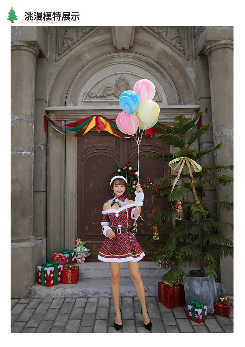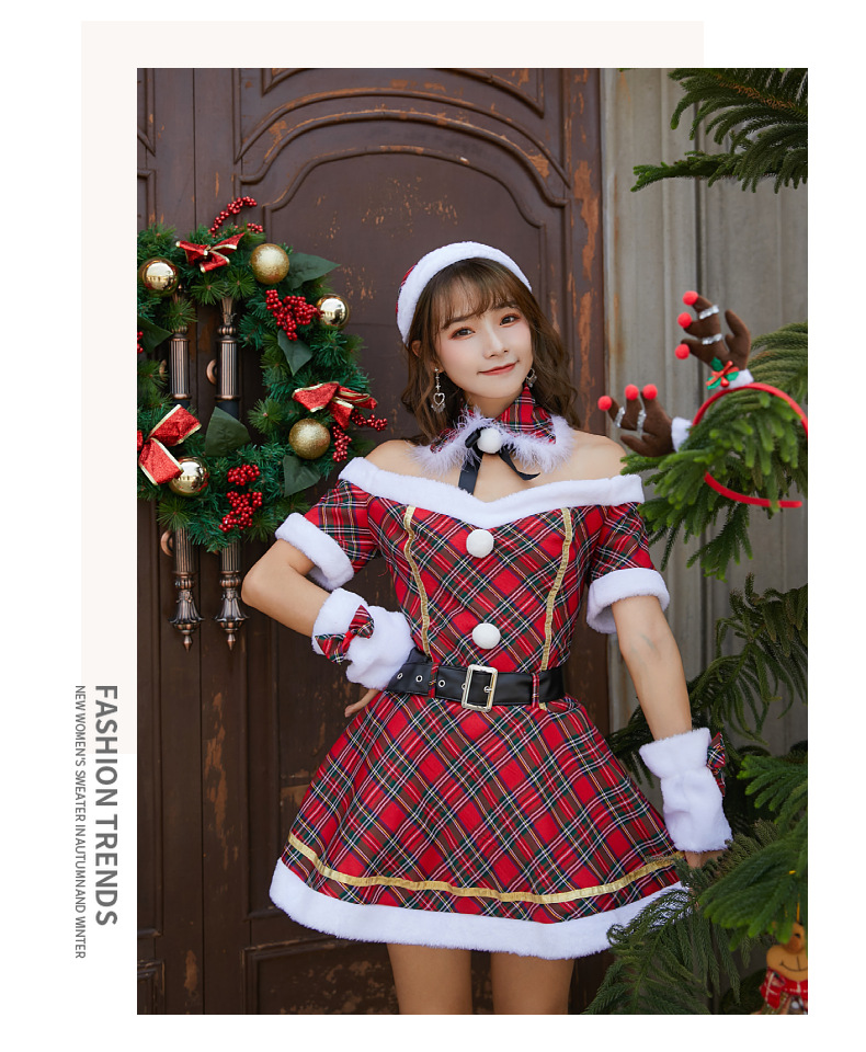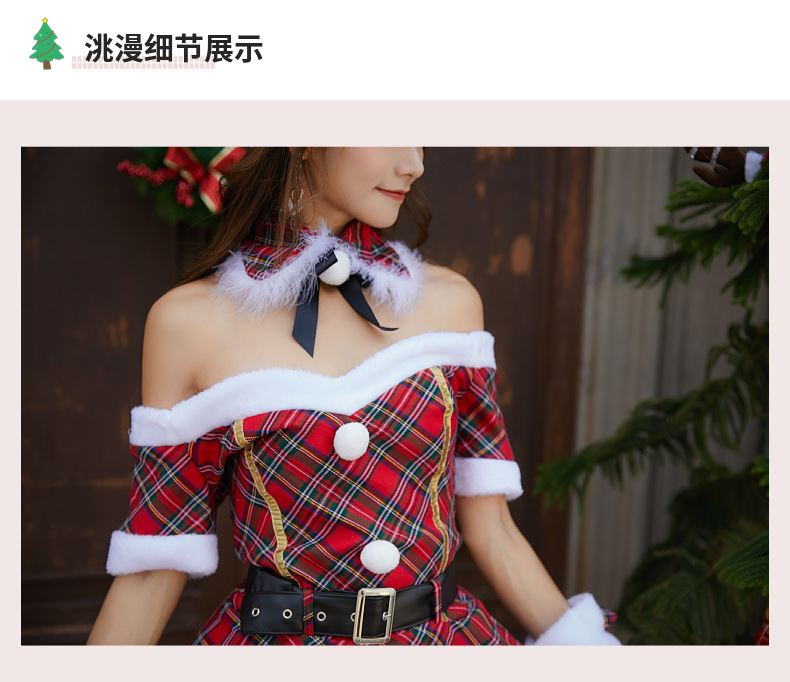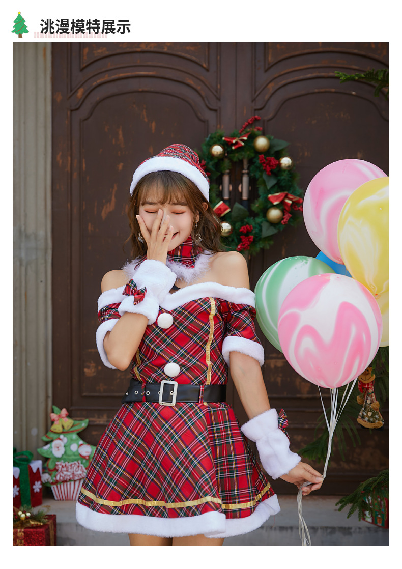 新款格子圣诞装圣诞节服装成人大人女连衣裙日韩一字肩抹胸圣诞裙