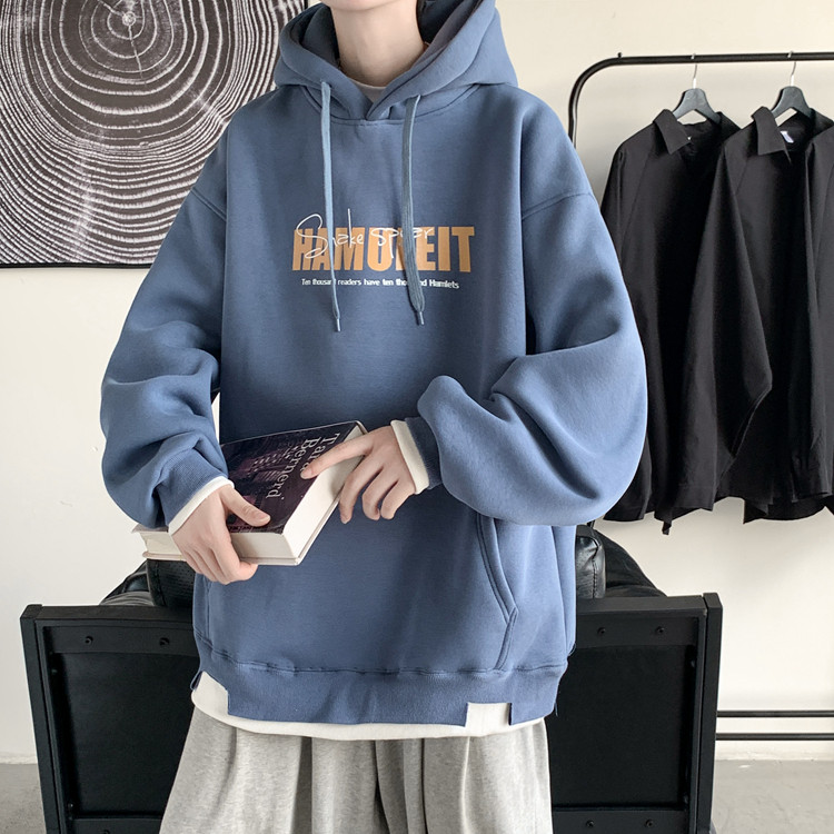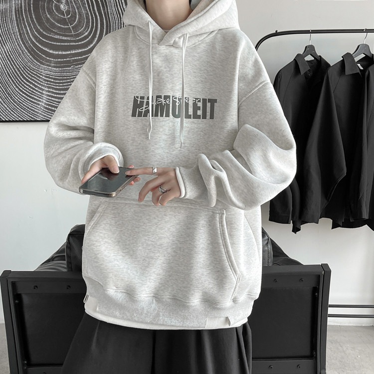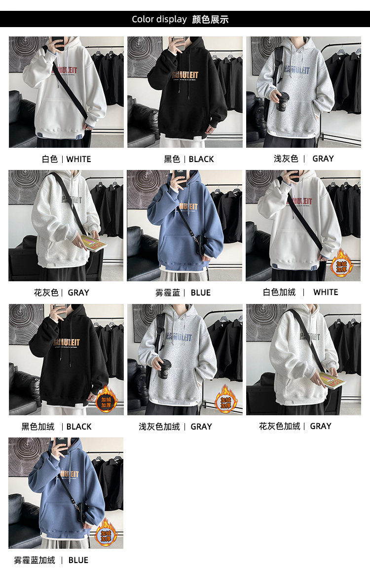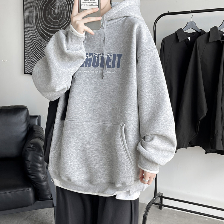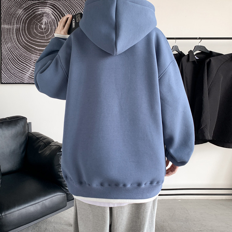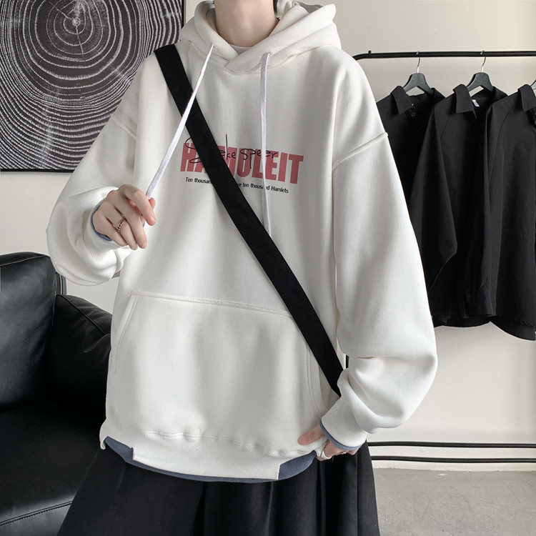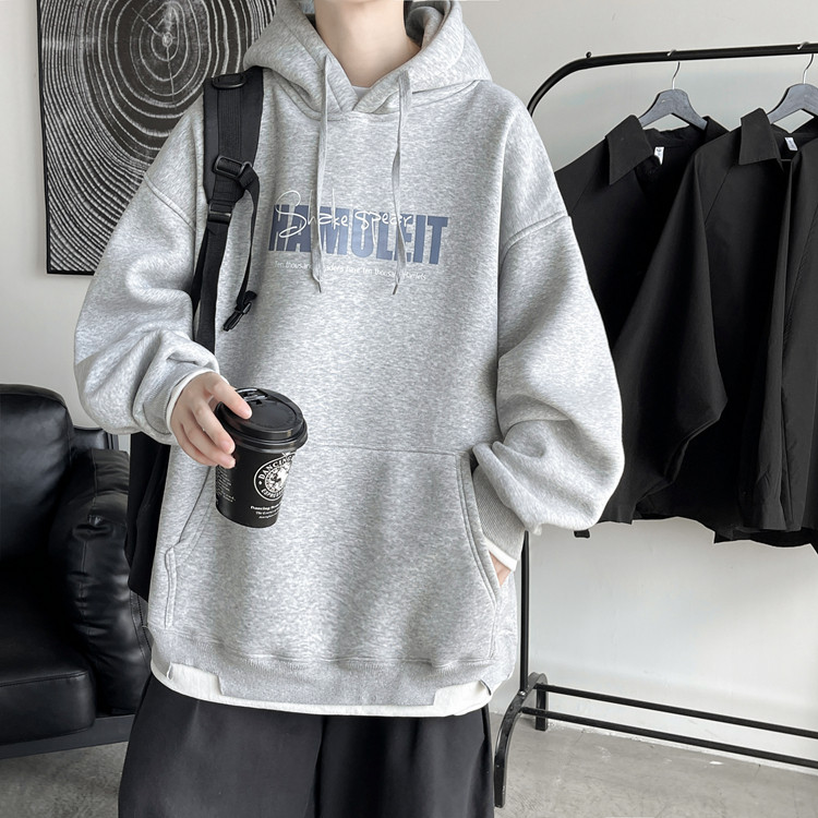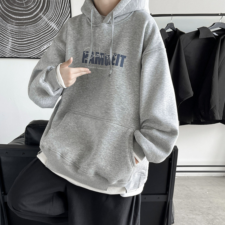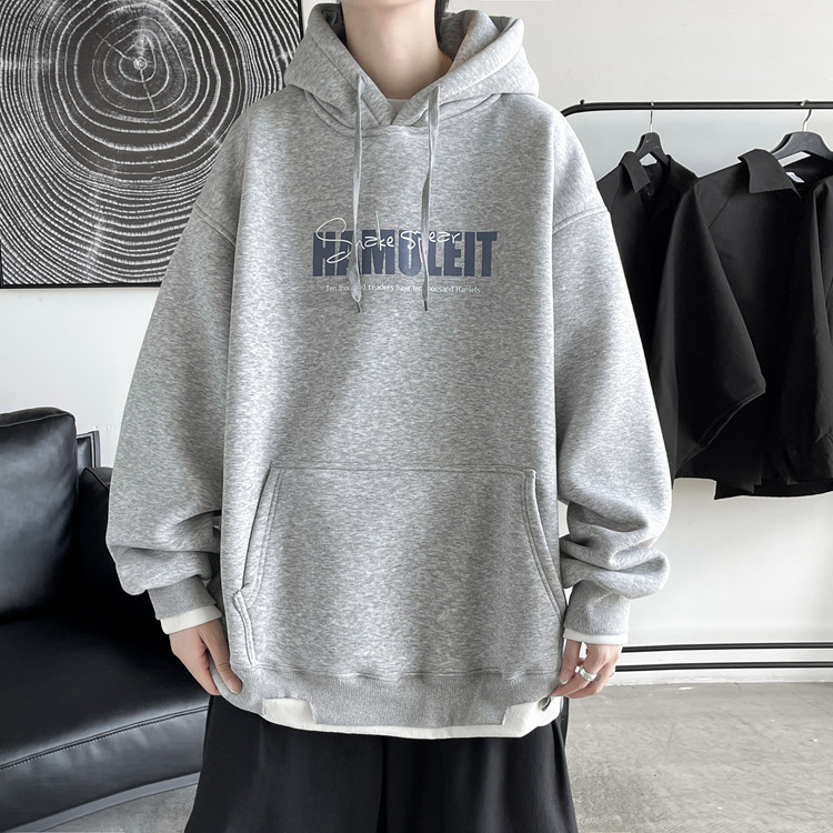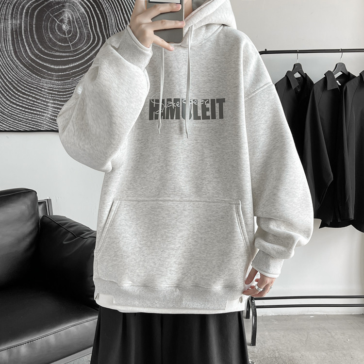 青少年连帽卫衣男秋冬款潮牌加绒加厚外套港风chic假两件上衣服