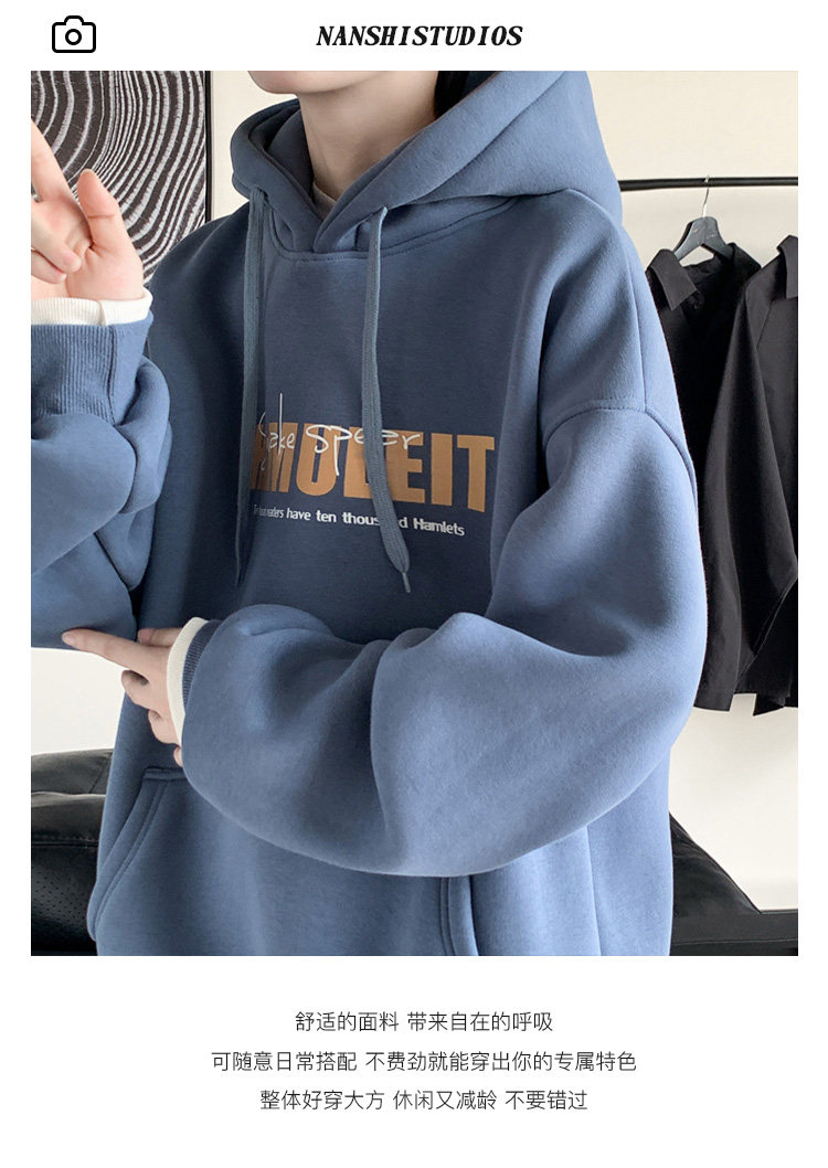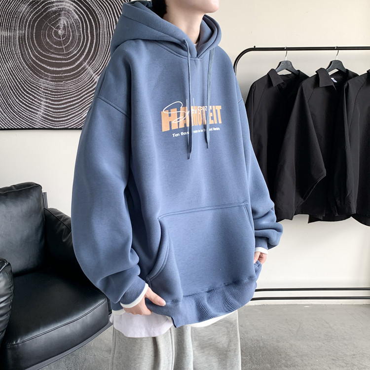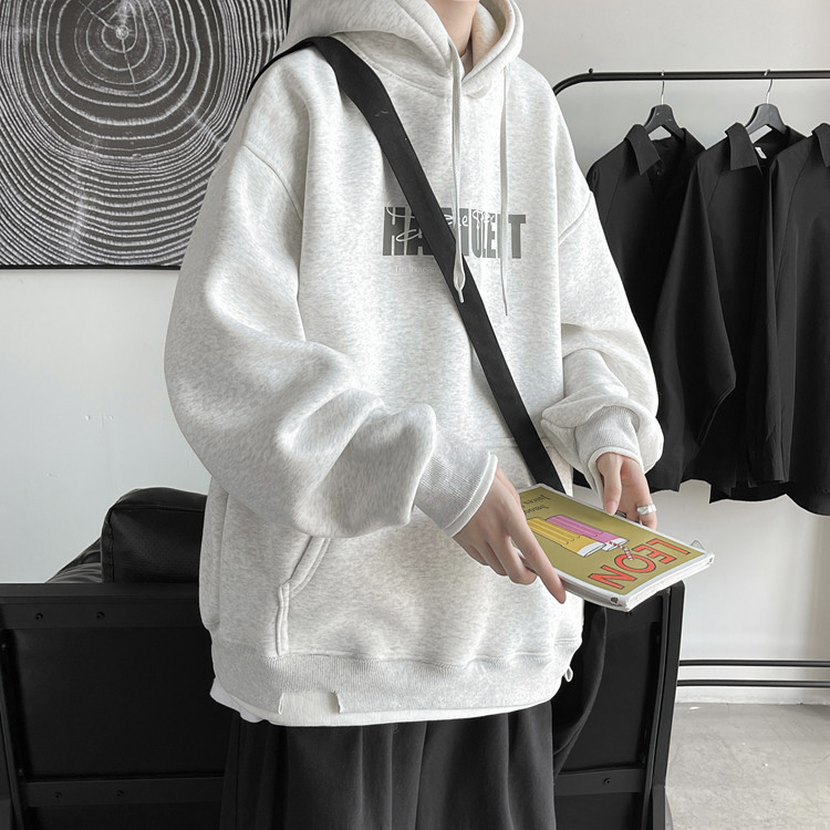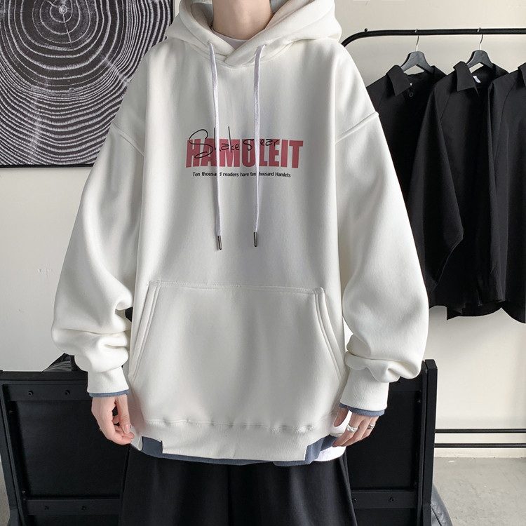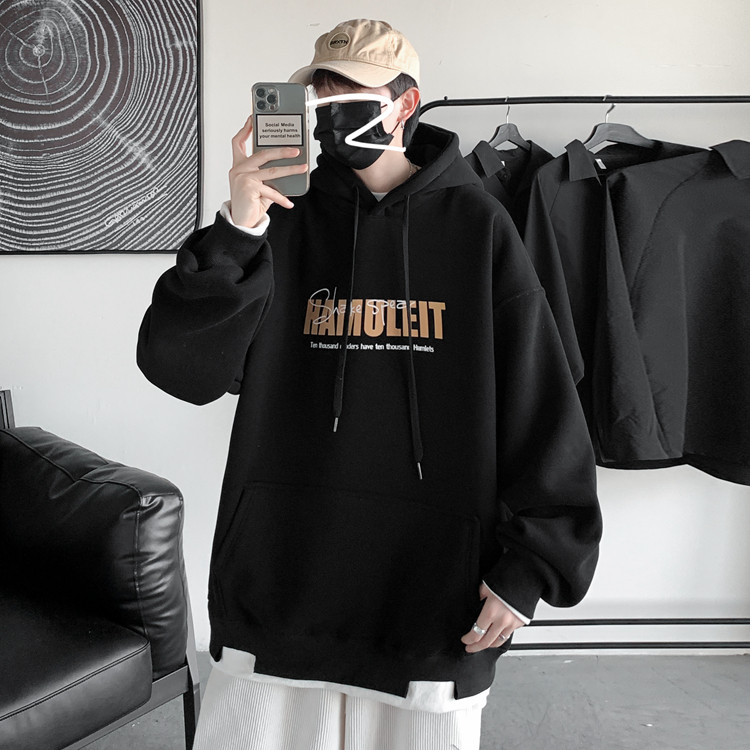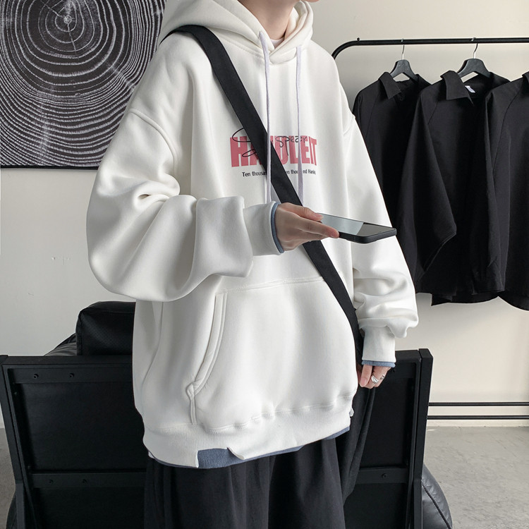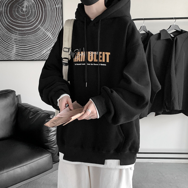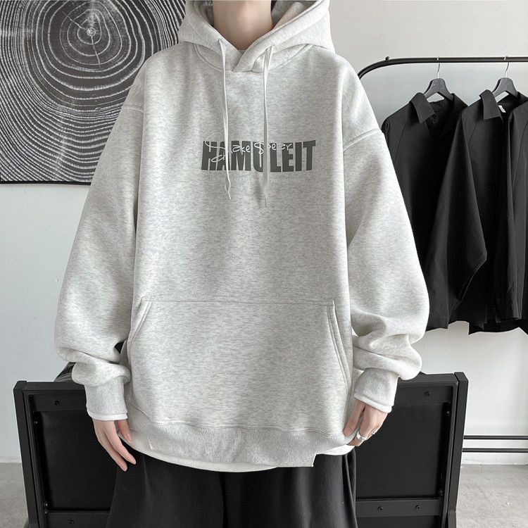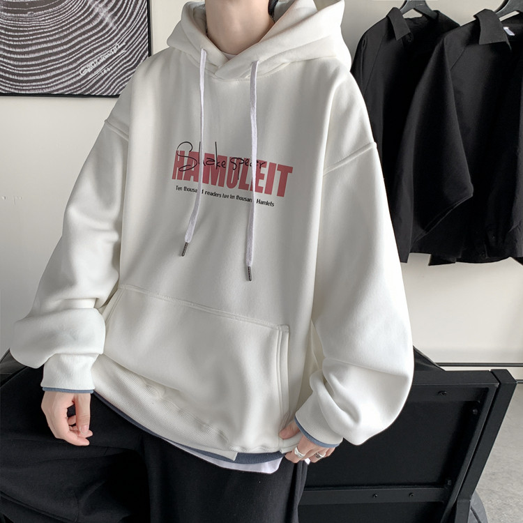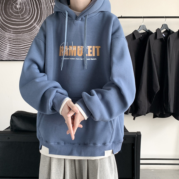 青少年连帽卫衣男秋冬款潮牌加绒加厚外套港风chic假两件上衣服