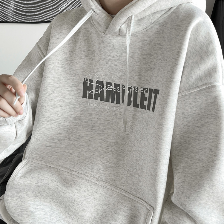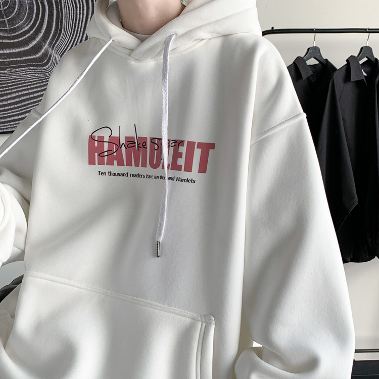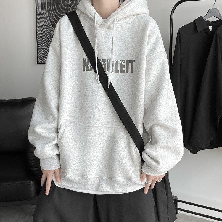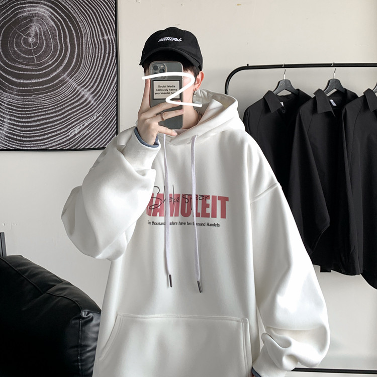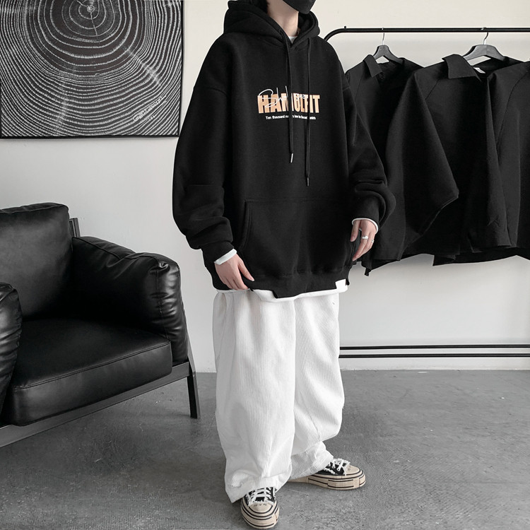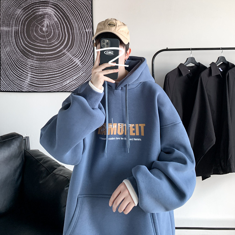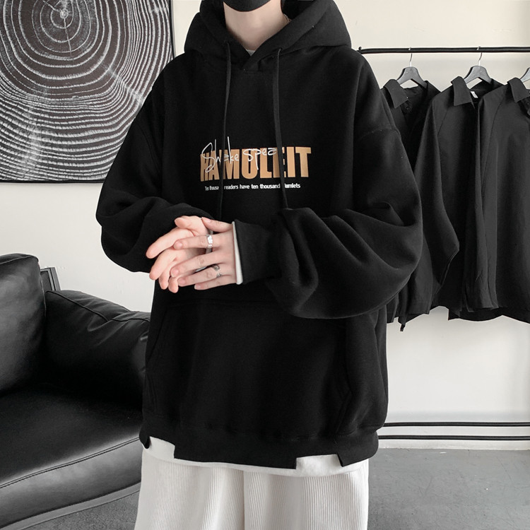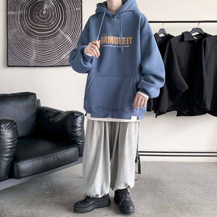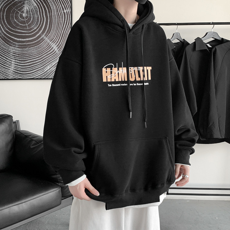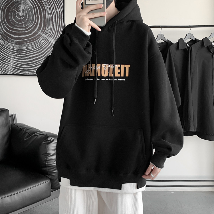 青少年连帽卫衣男秋冬款潮牌加绒加厚外套港风chic假两件上衣服