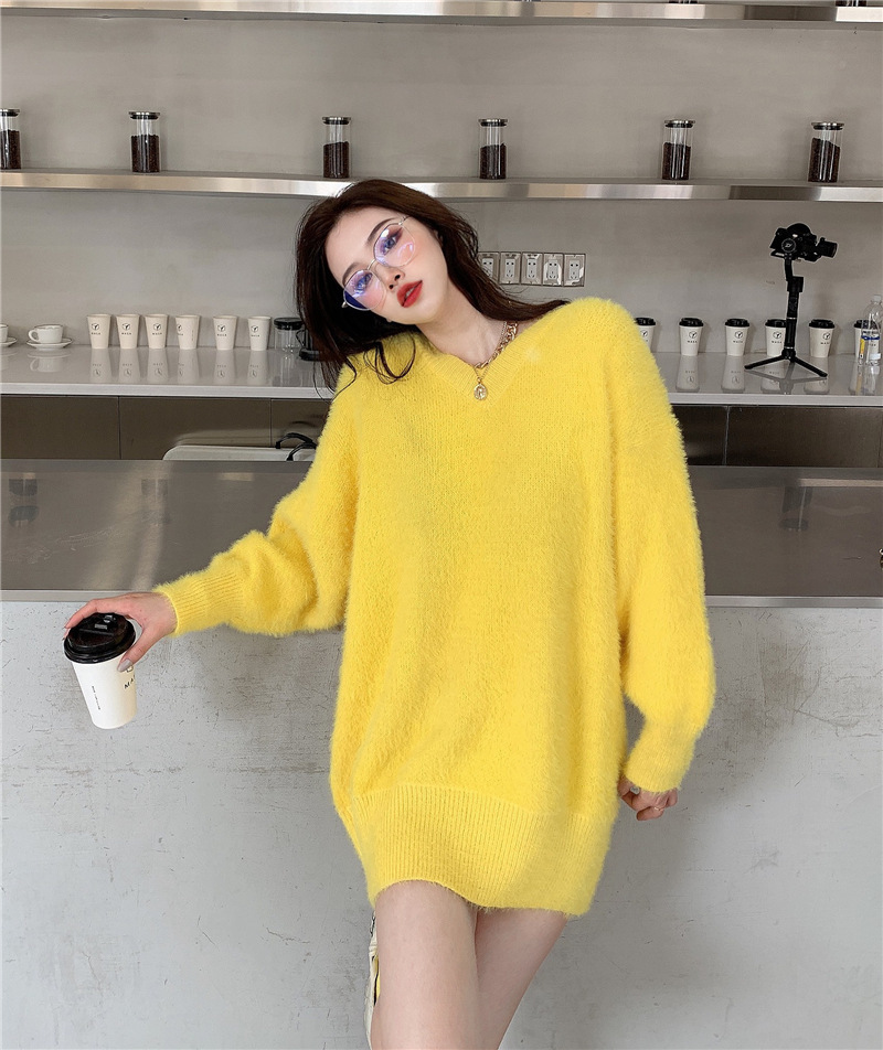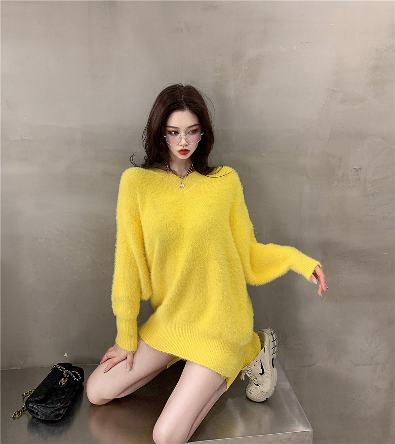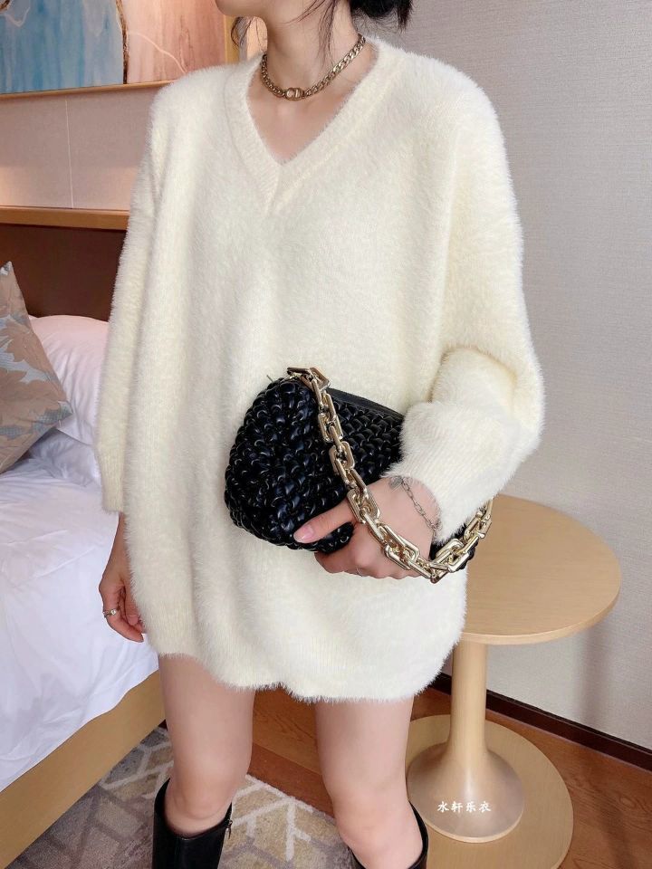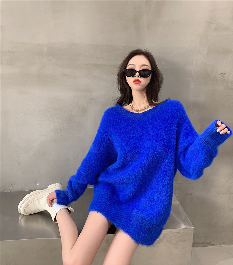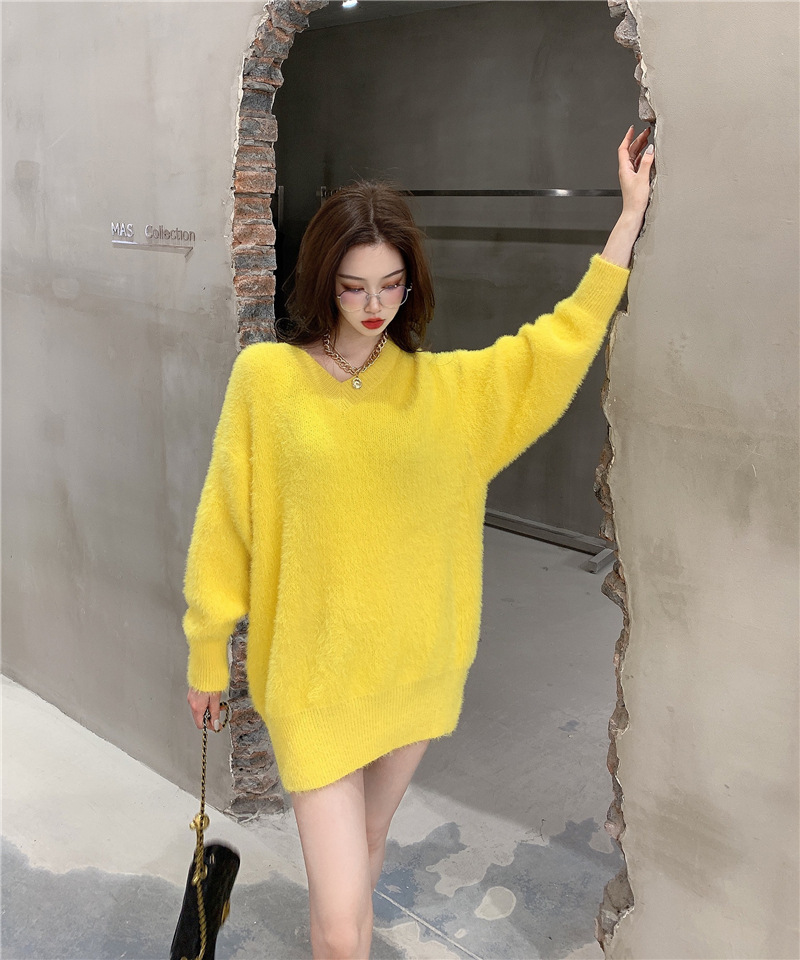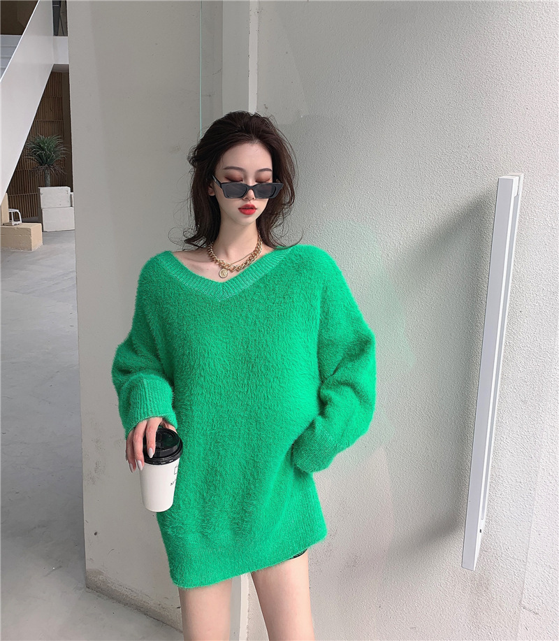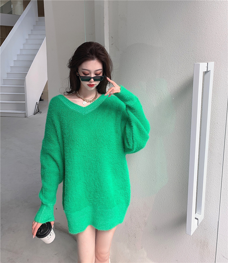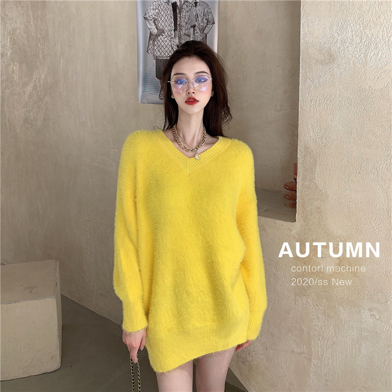 仿水貂绒毛衣女秋冬新款中长款V领大码宽松韩版外穿慵懒风针织衫
