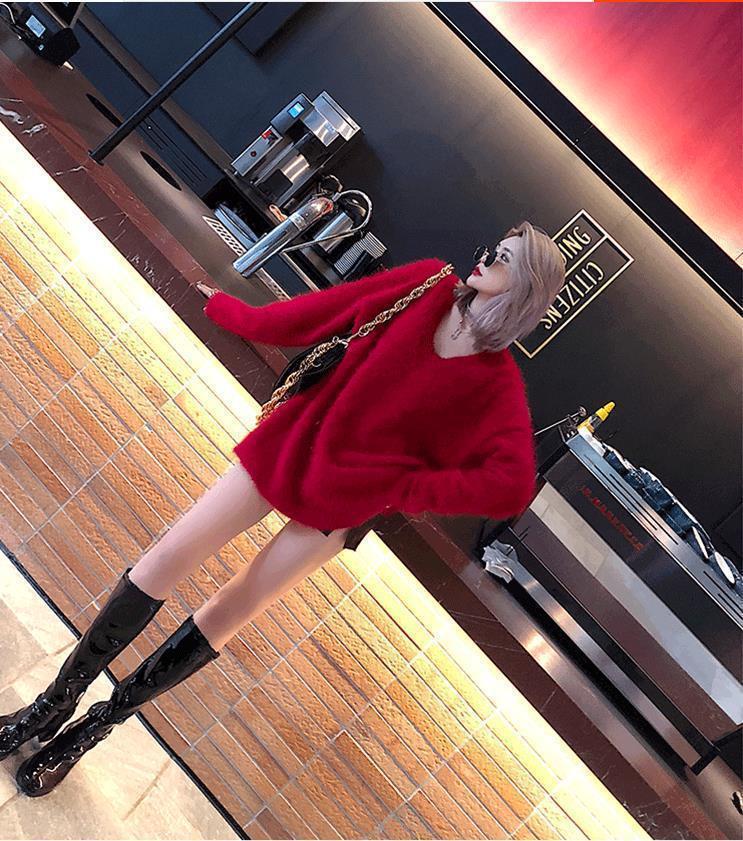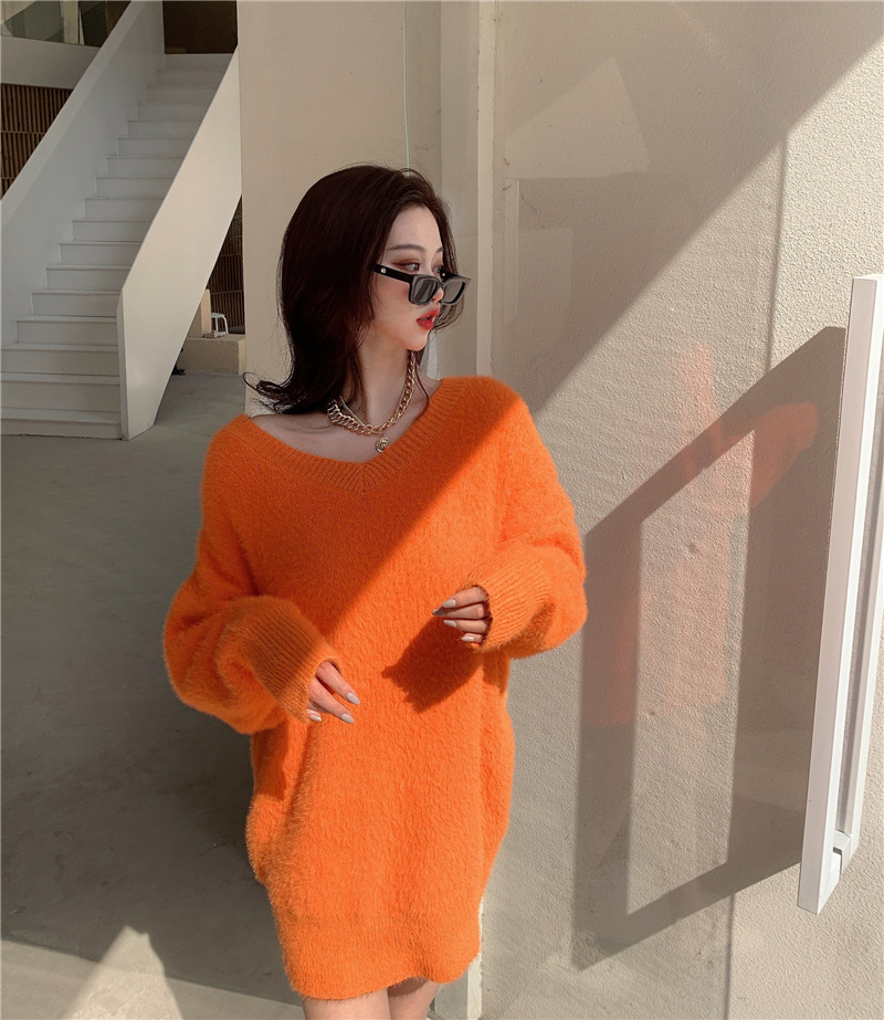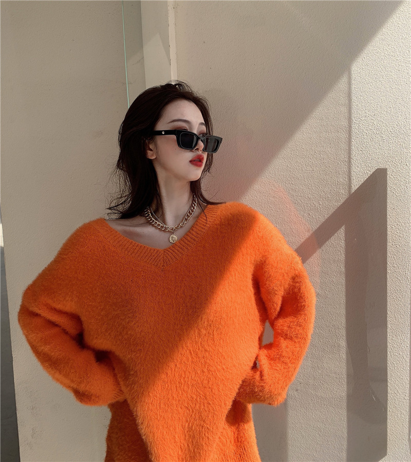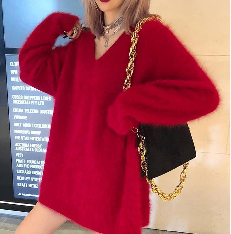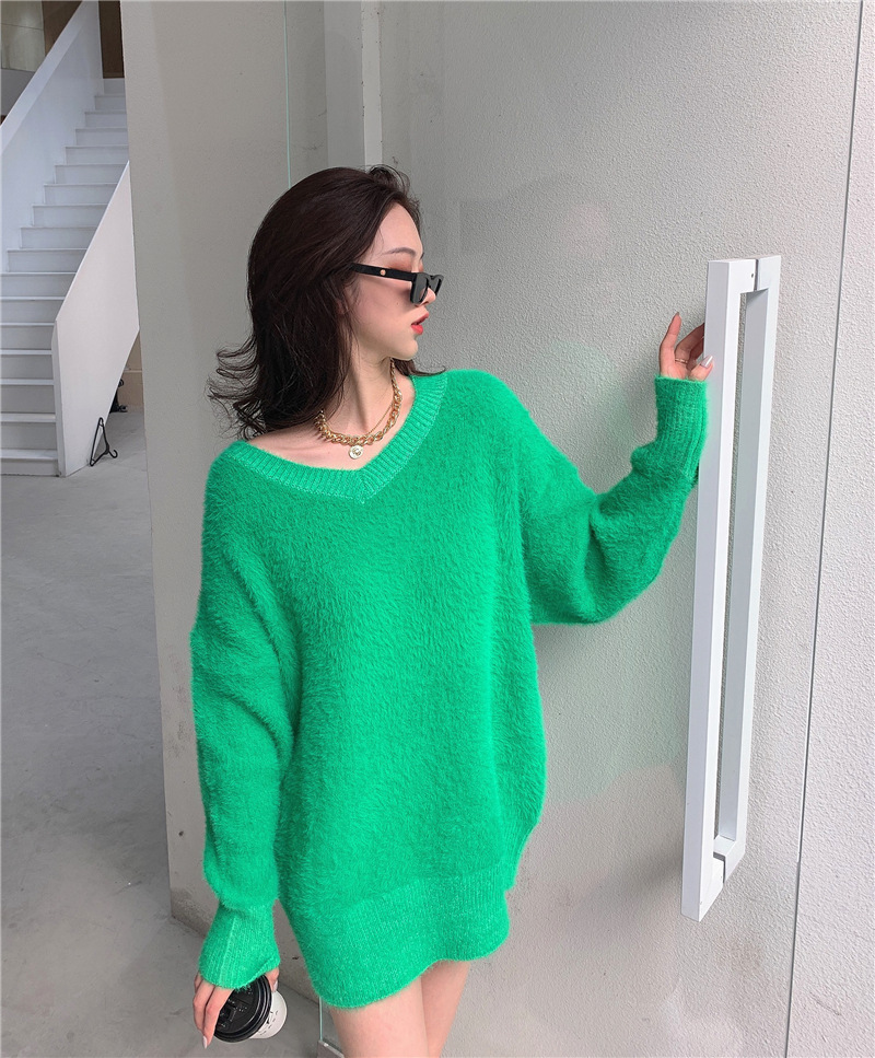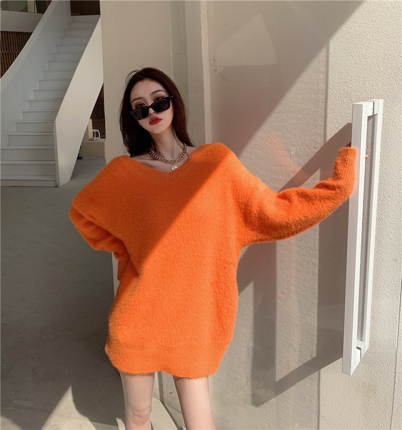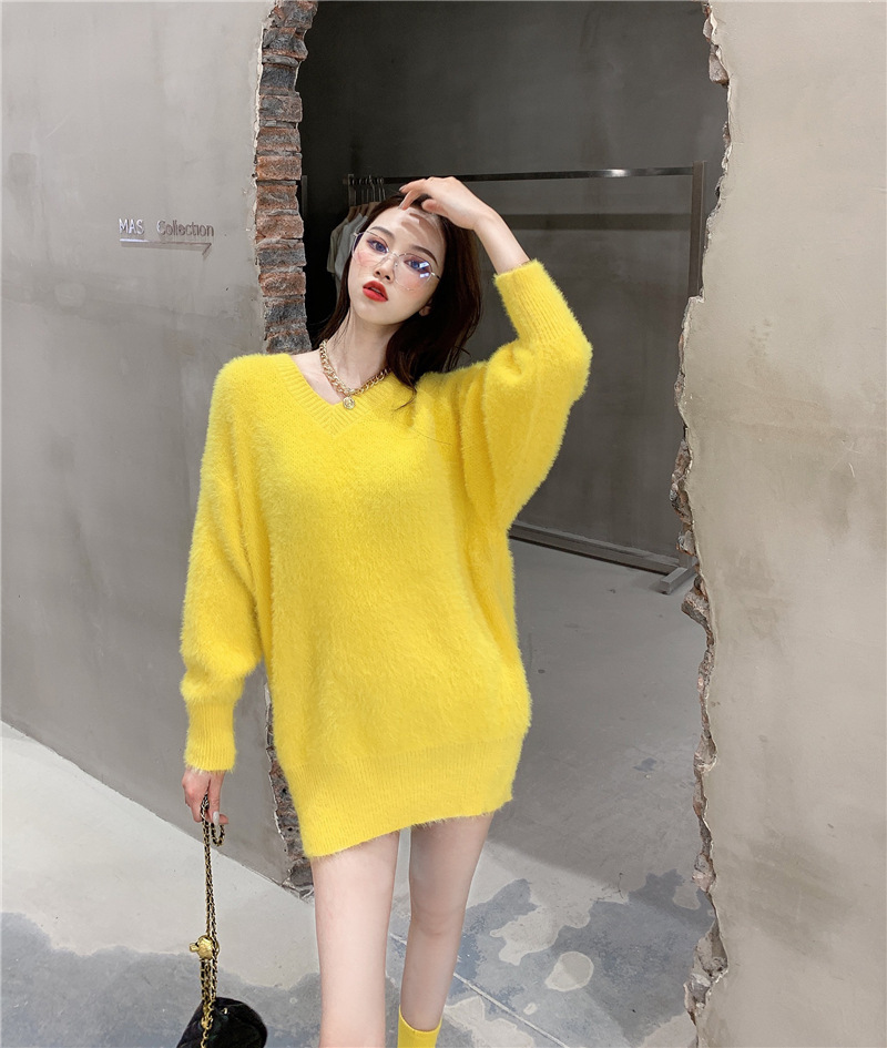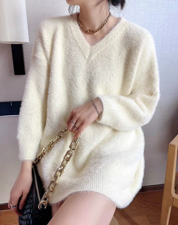 仿水貂绒毛衣女秋冬新款中长款V领大码宽松韩版外穿慵懒风针织衫