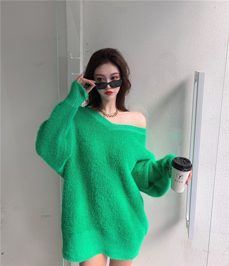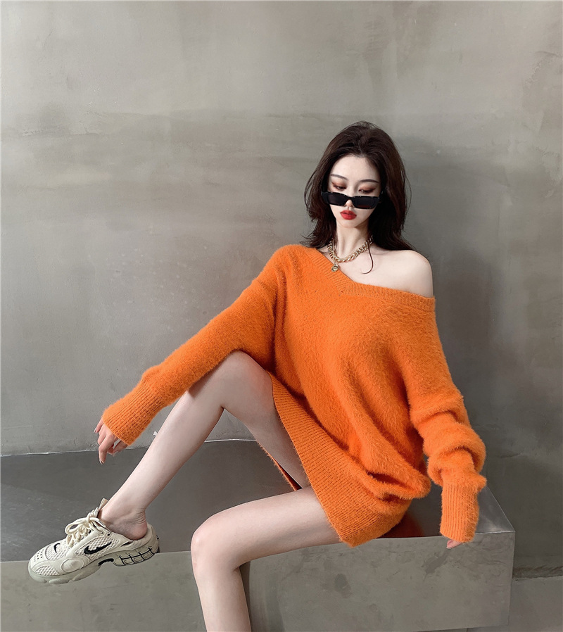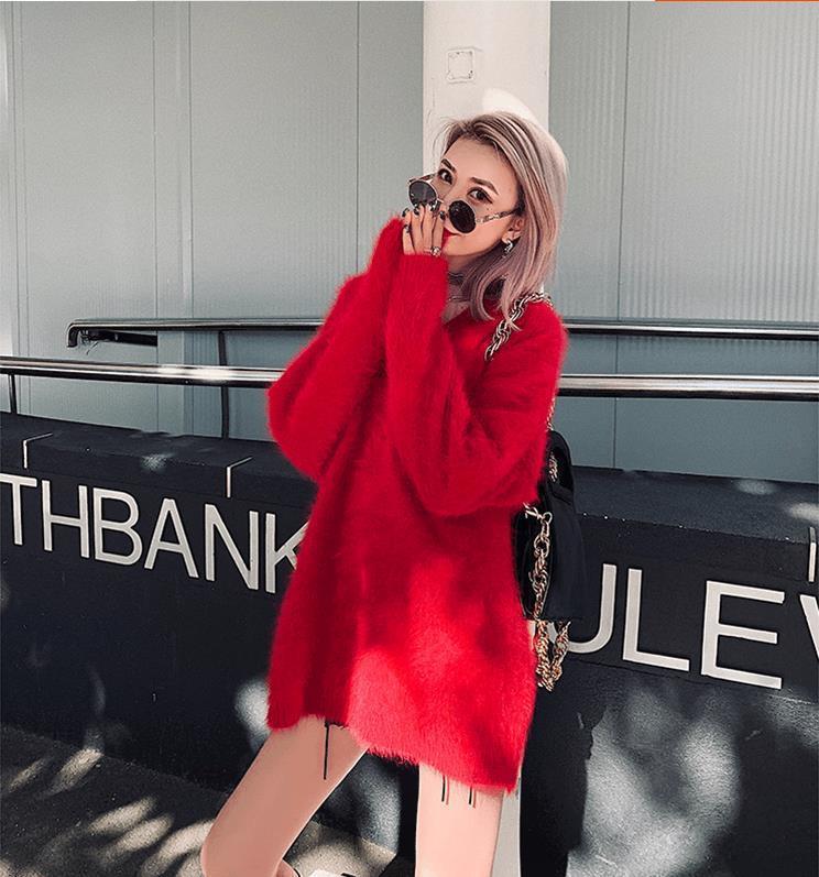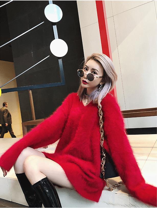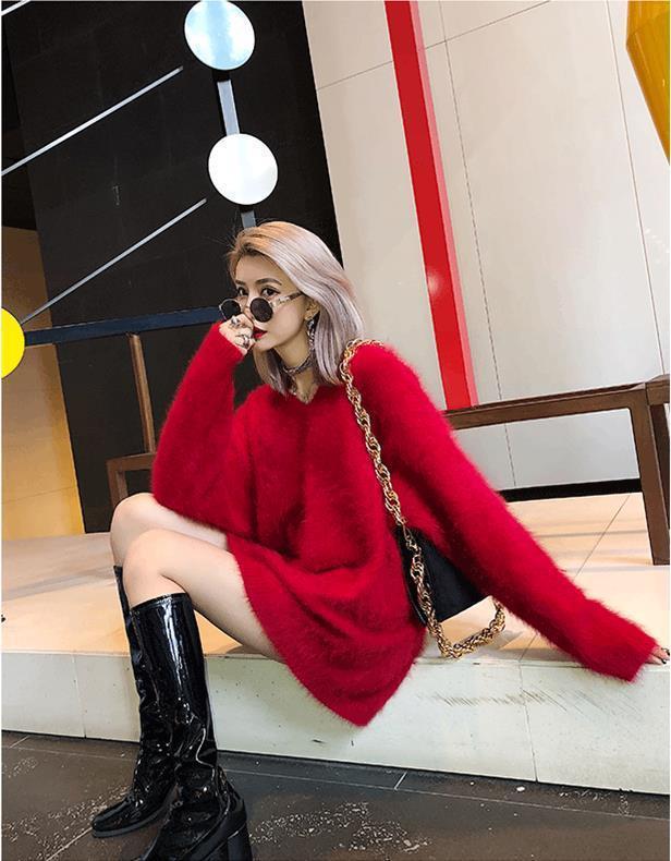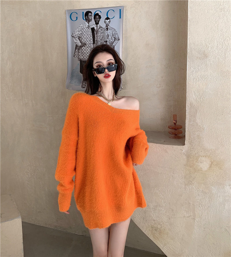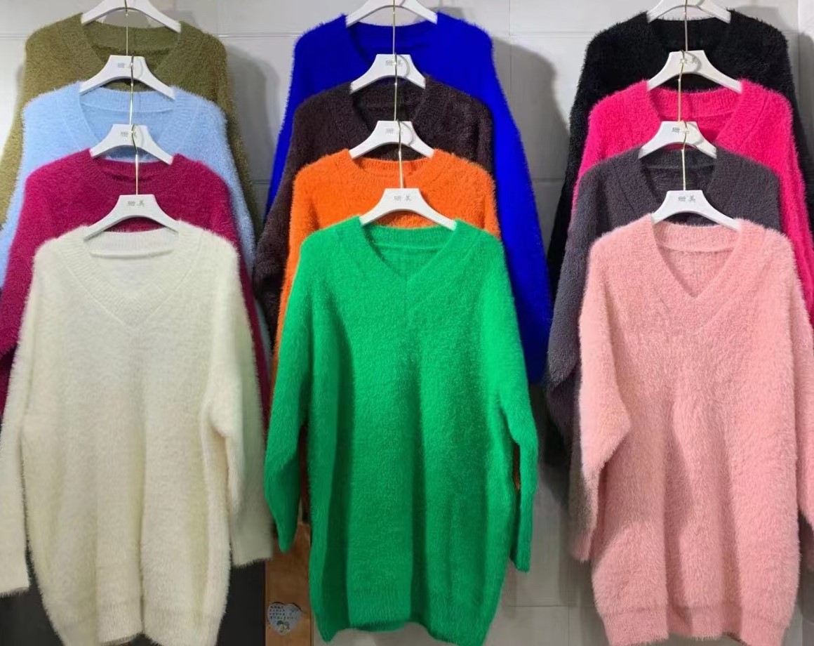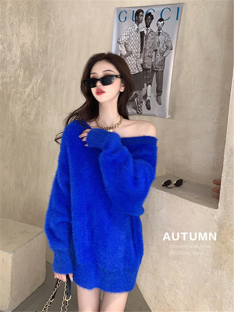 仿水貂绒毛衣女秋冬新款中长款V领大码宽松韩版外穿慵懒风针织衫