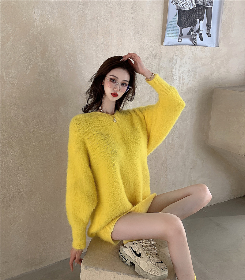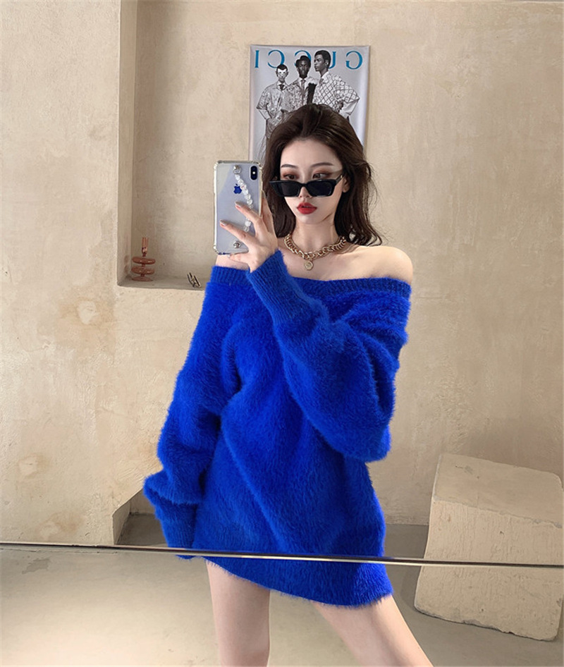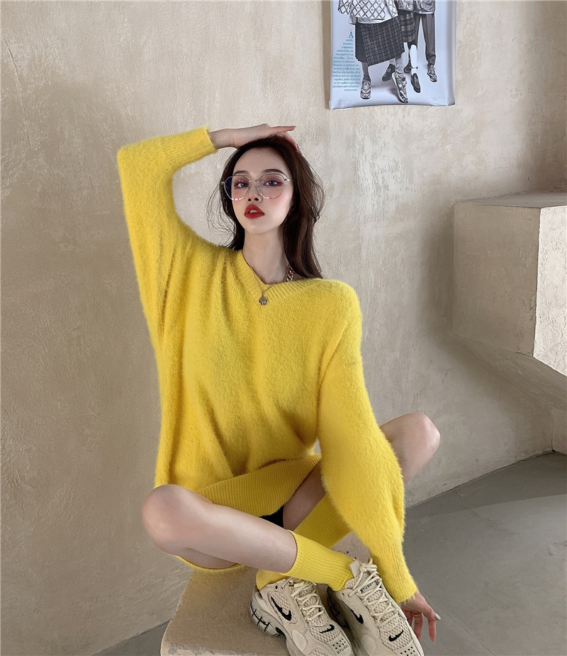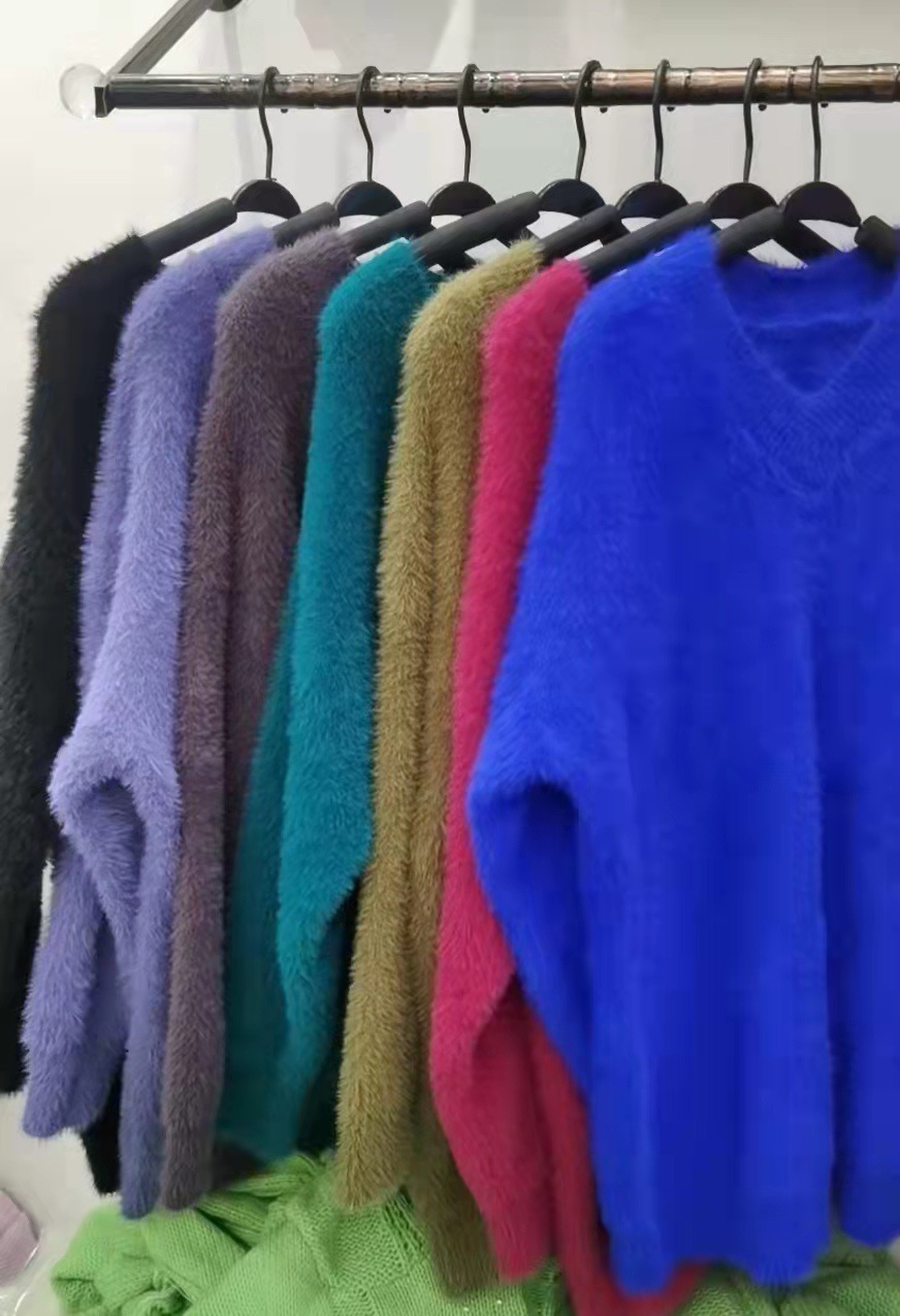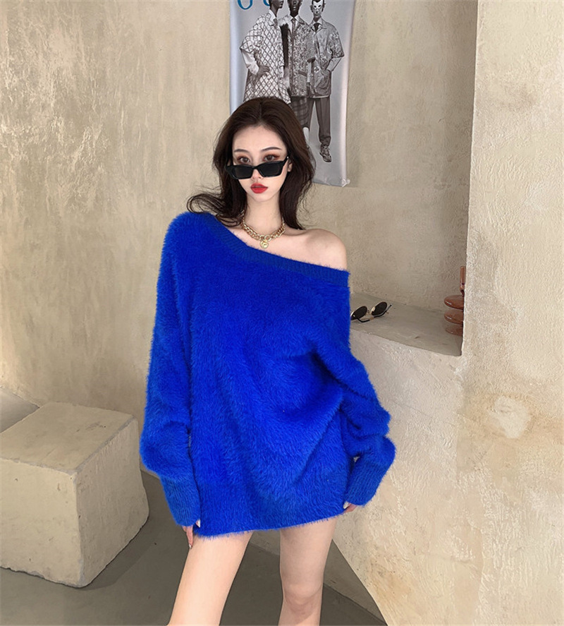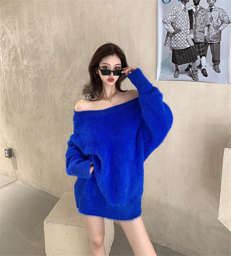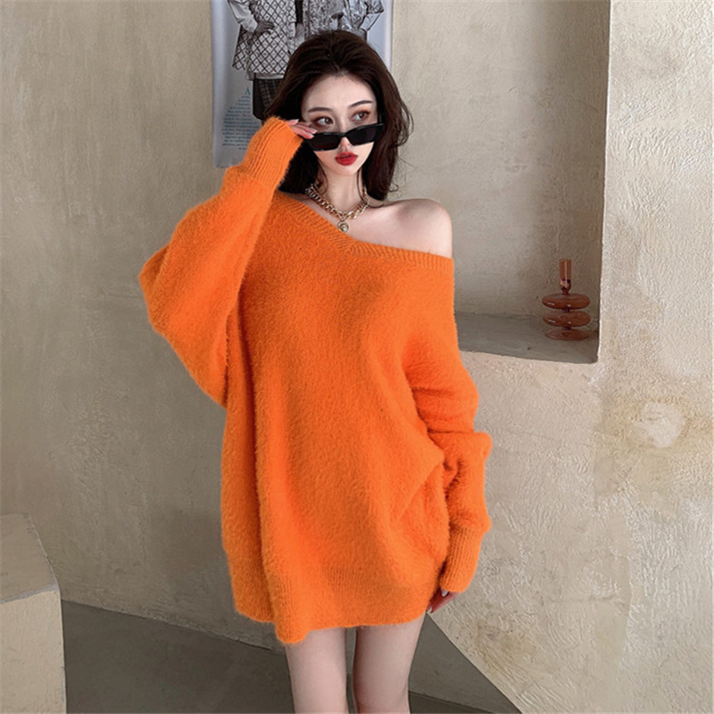 仿水貂绒毛衣女秋冬新款中长款V领大码宽松韩版外穿慵懒风针织衫