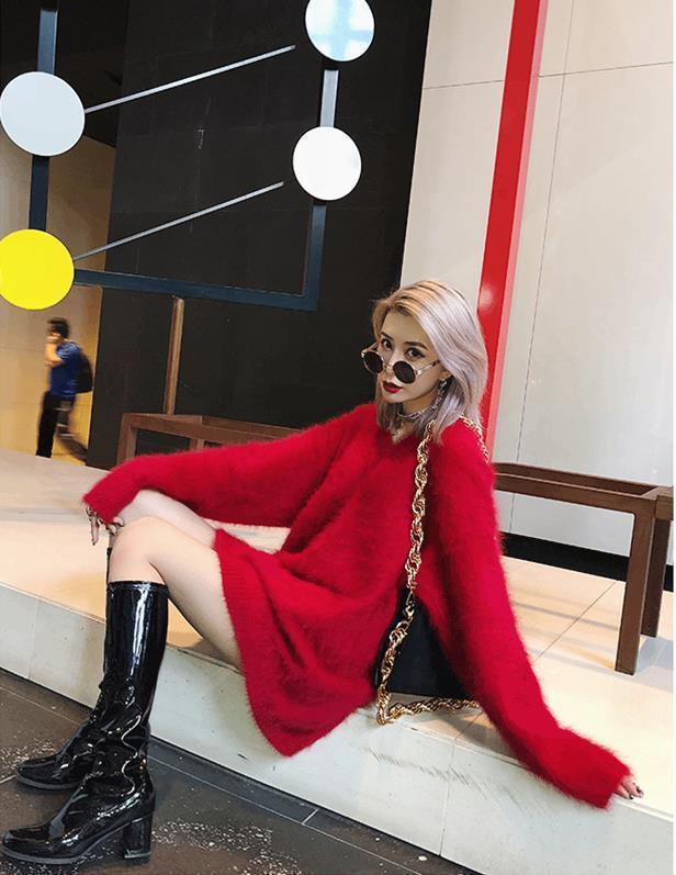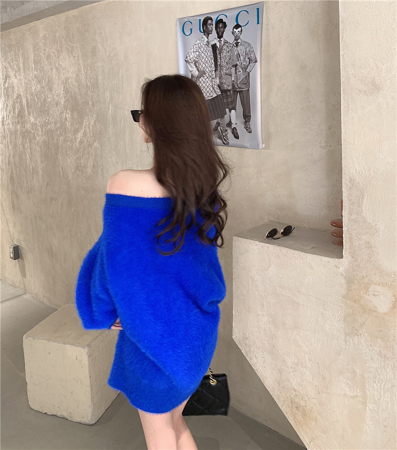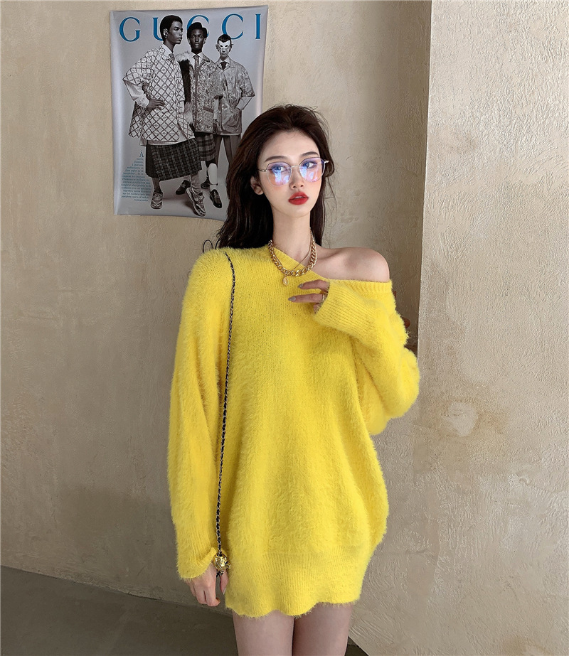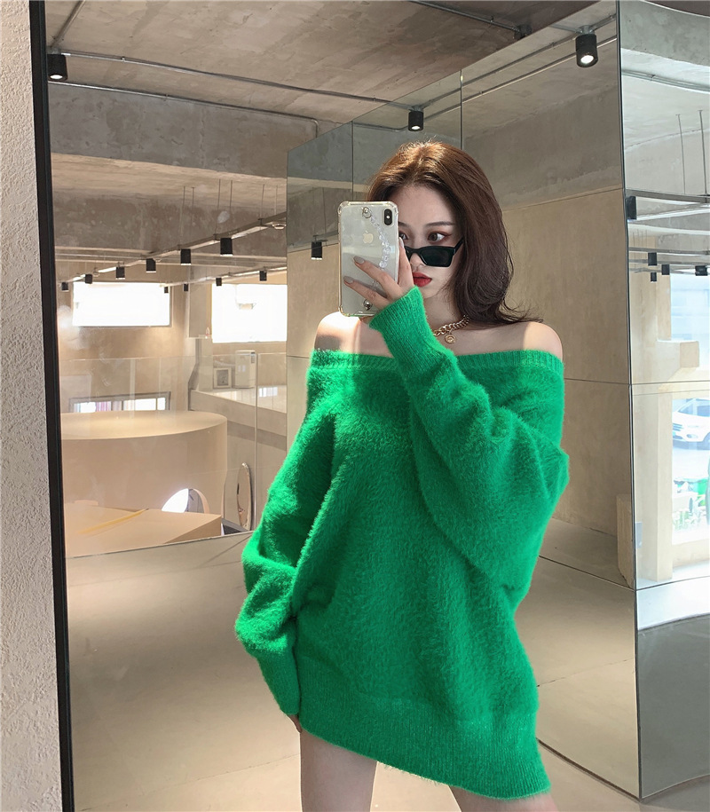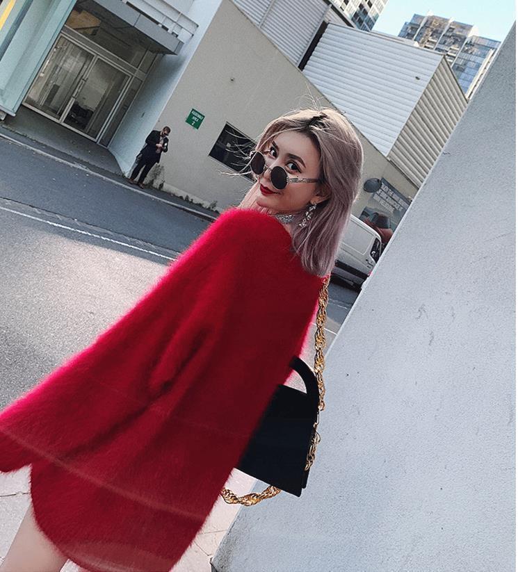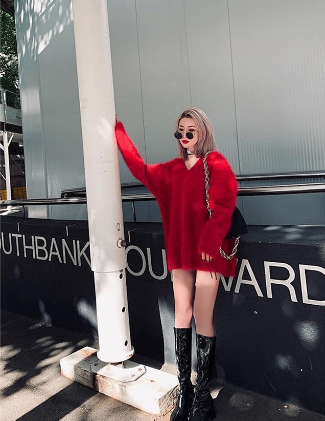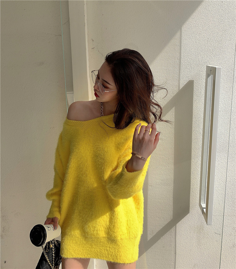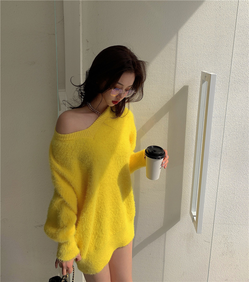仿水貂绒毛衣女秋冬新款中长款V领大码宽松韩版外穿慵懒风针织衫