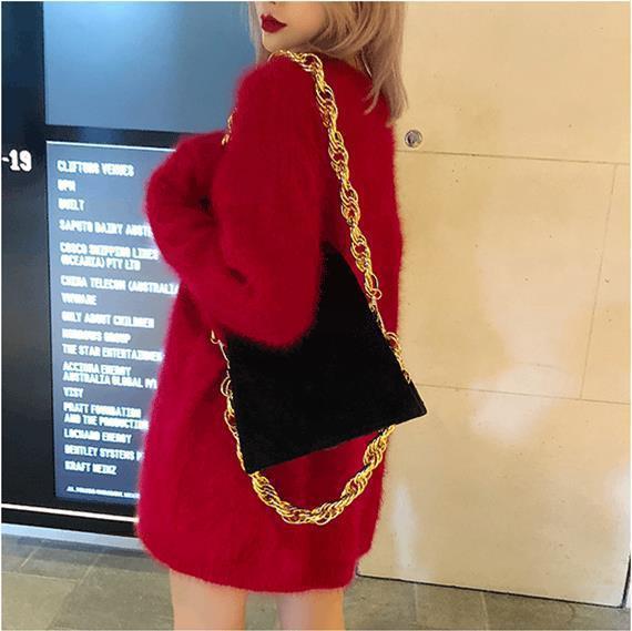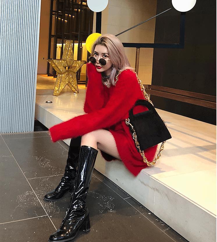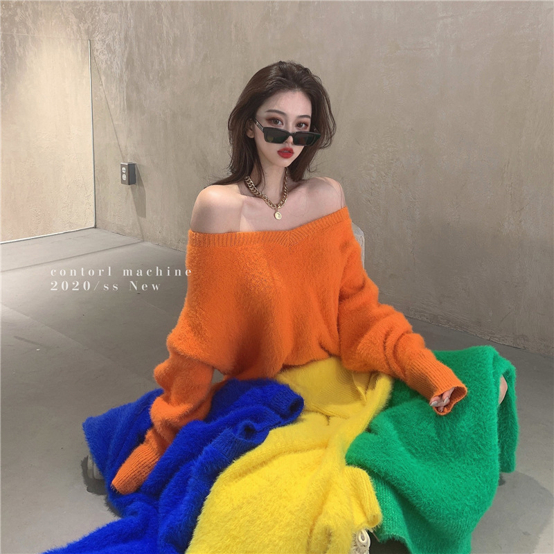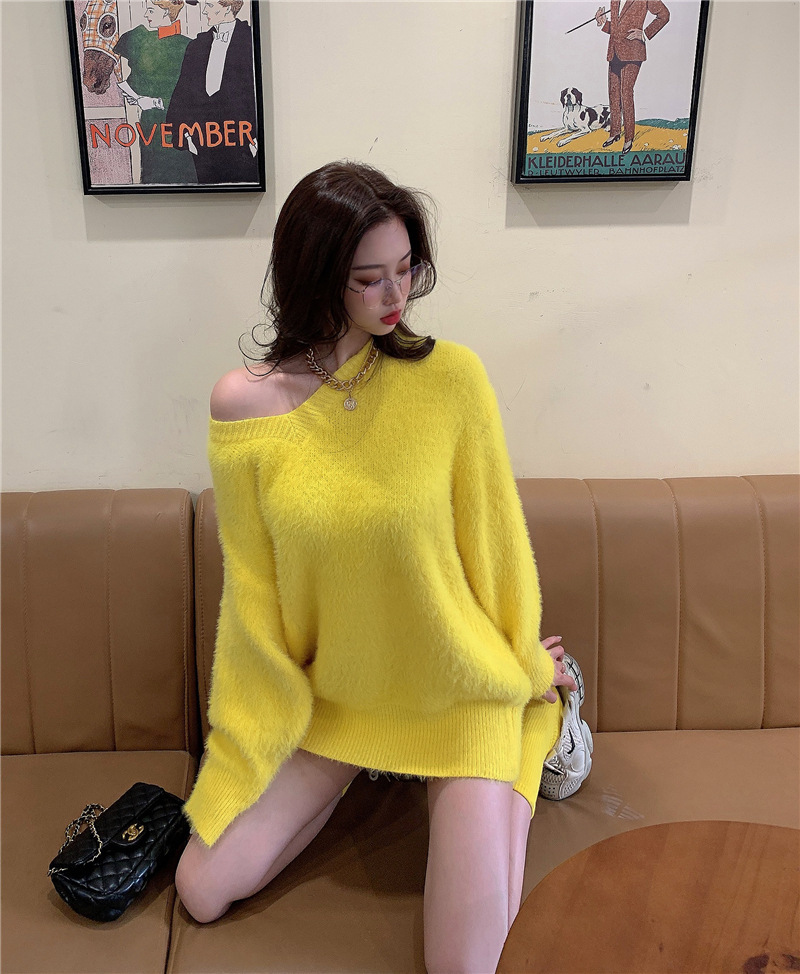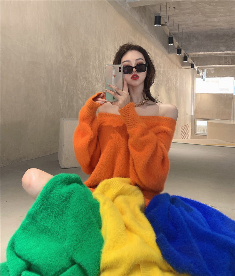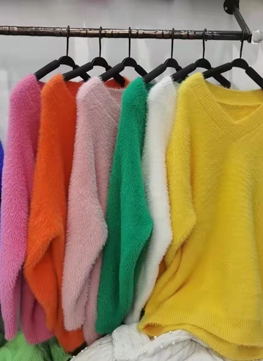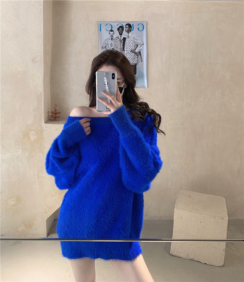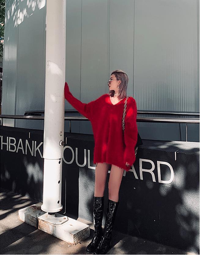 仿水貂绒毛衣女秋冬新款中长款V领大码宽松韩版外穿慵懒风针织衫