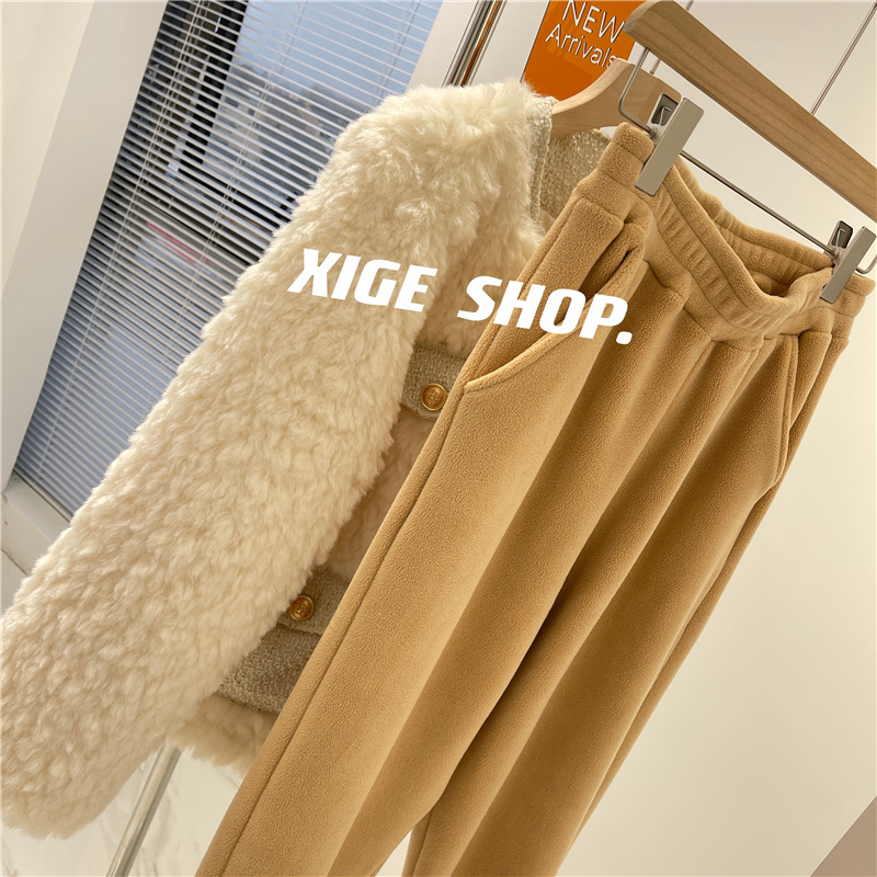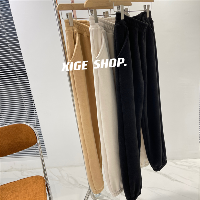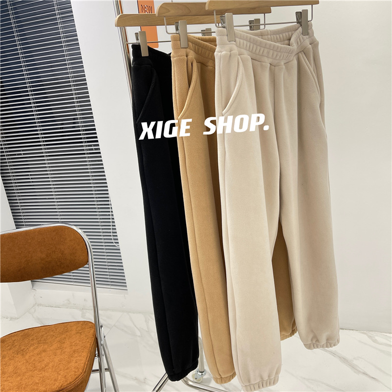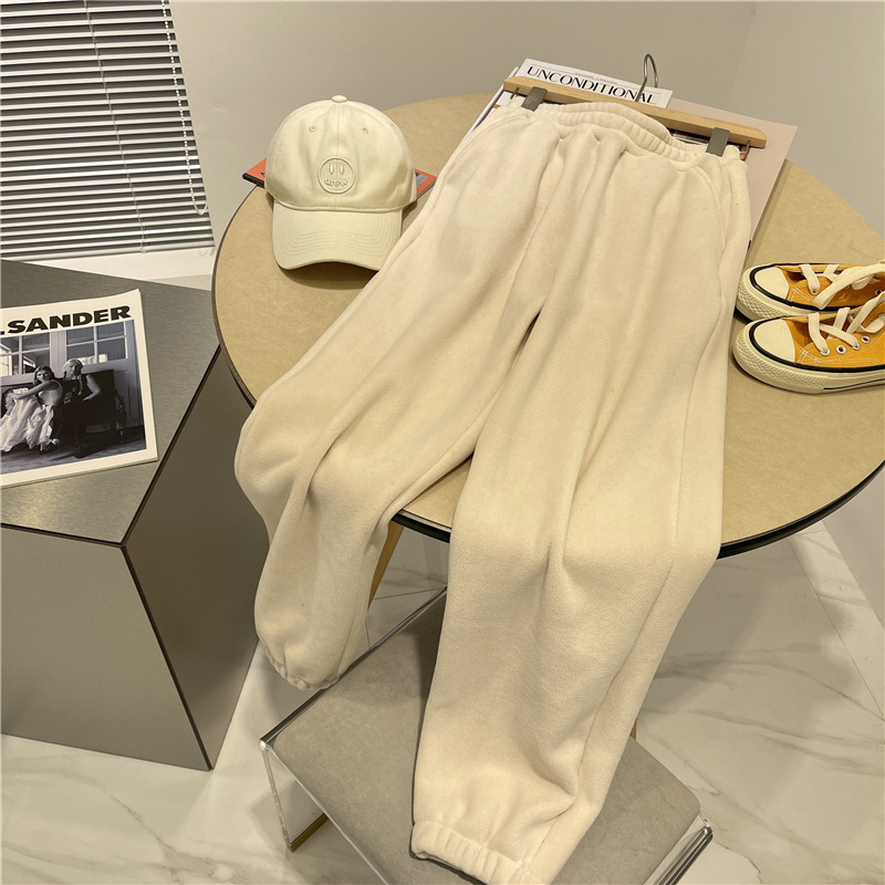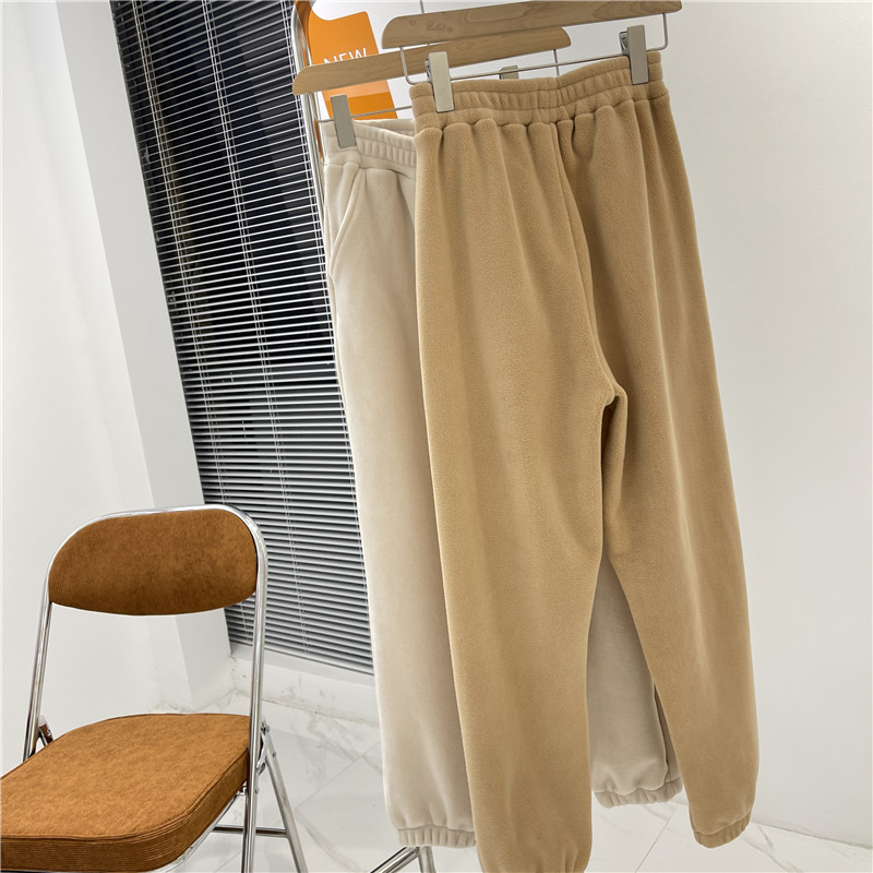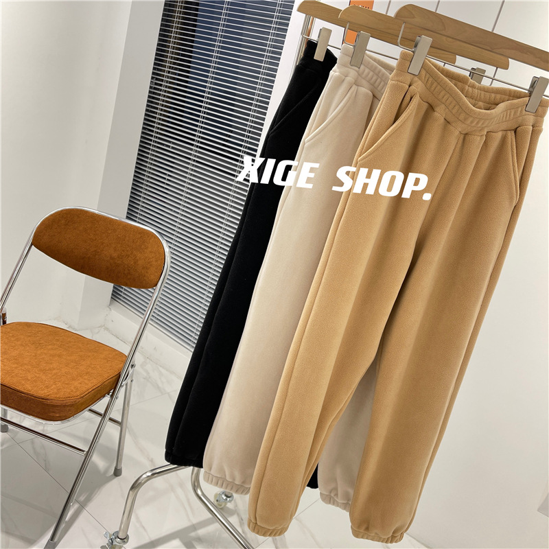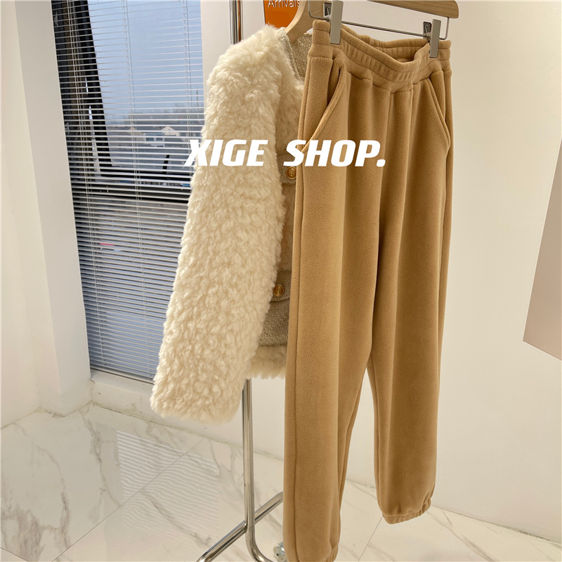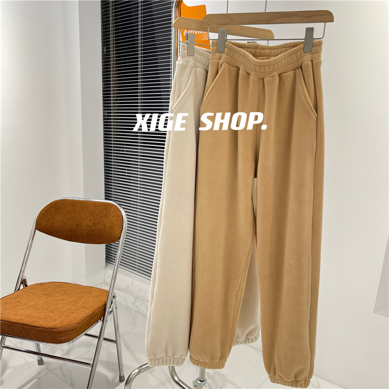 双面奥利绒运动裤女居家外穿百搭宽松加绒加厚奶茶色束脚哈伦卫裤