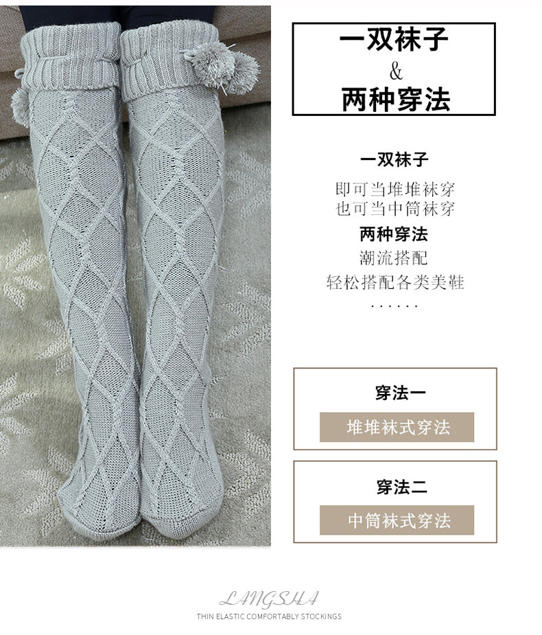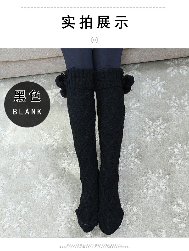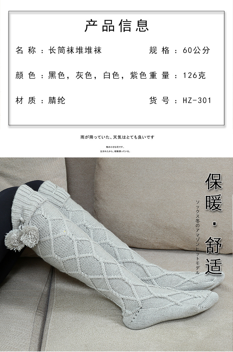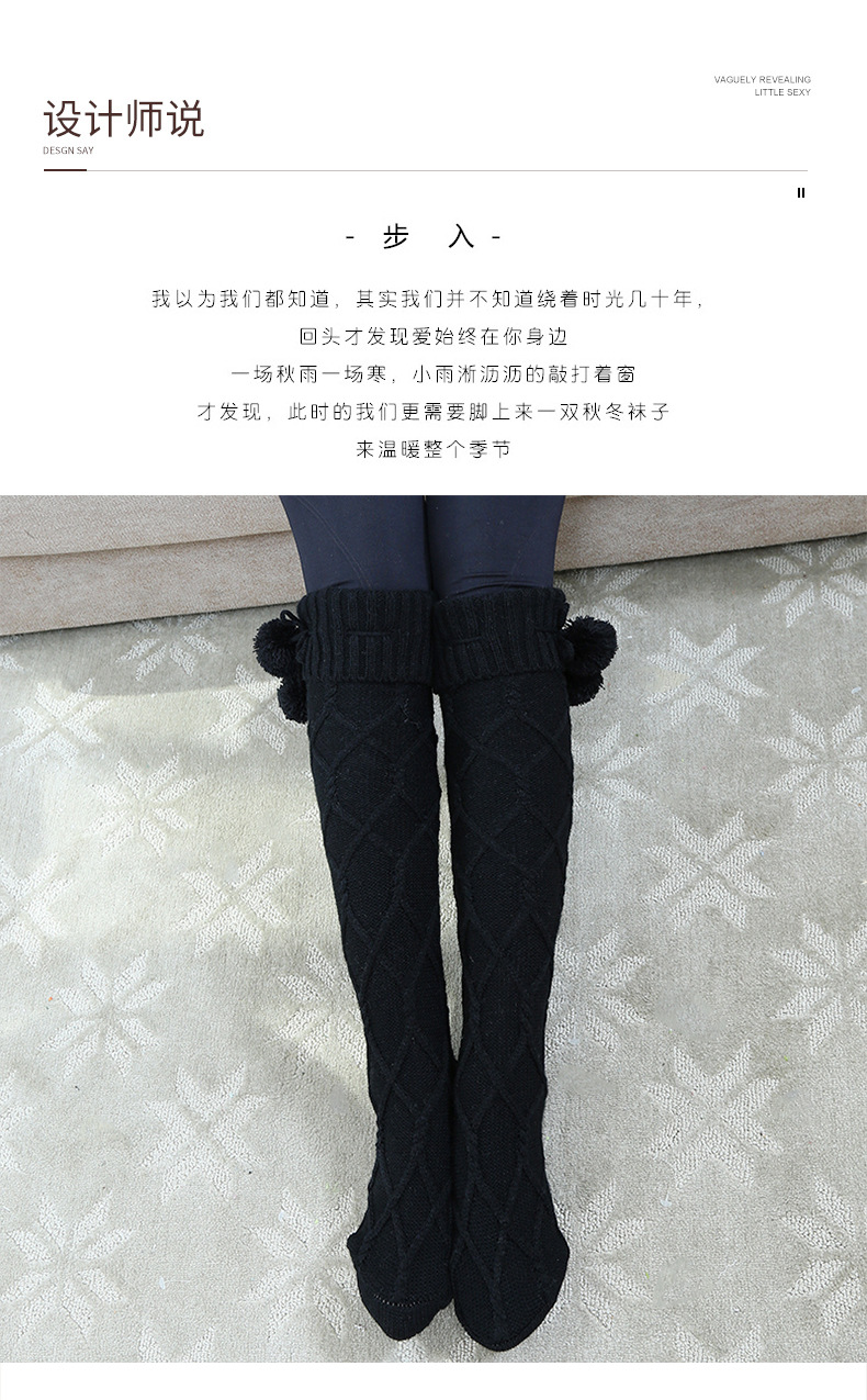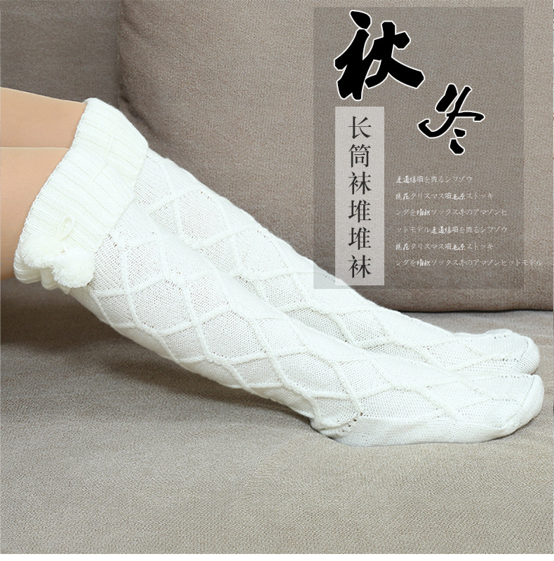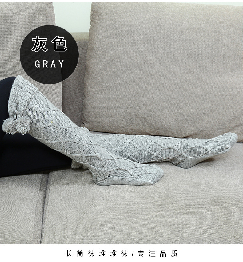 新款韩版高筒针织长袜子时尚毛球袜过膝袜纯色堆堆袜透气长筒袜
