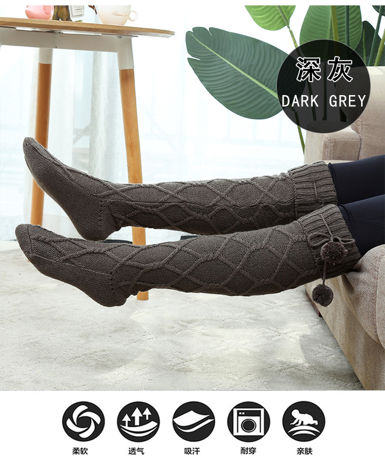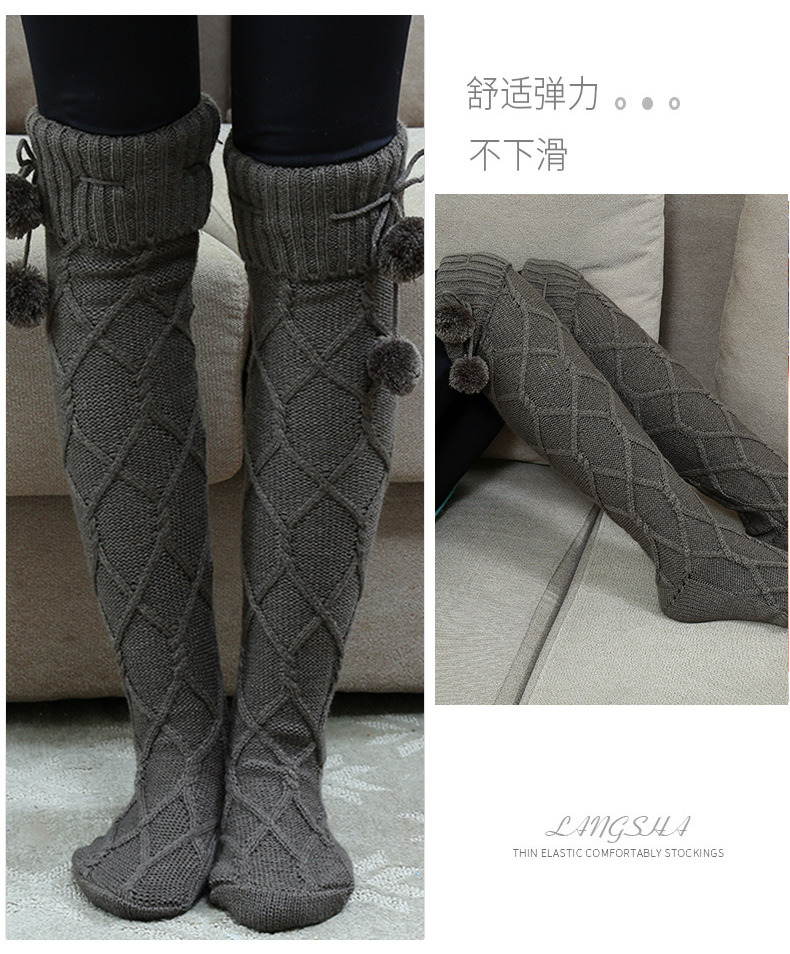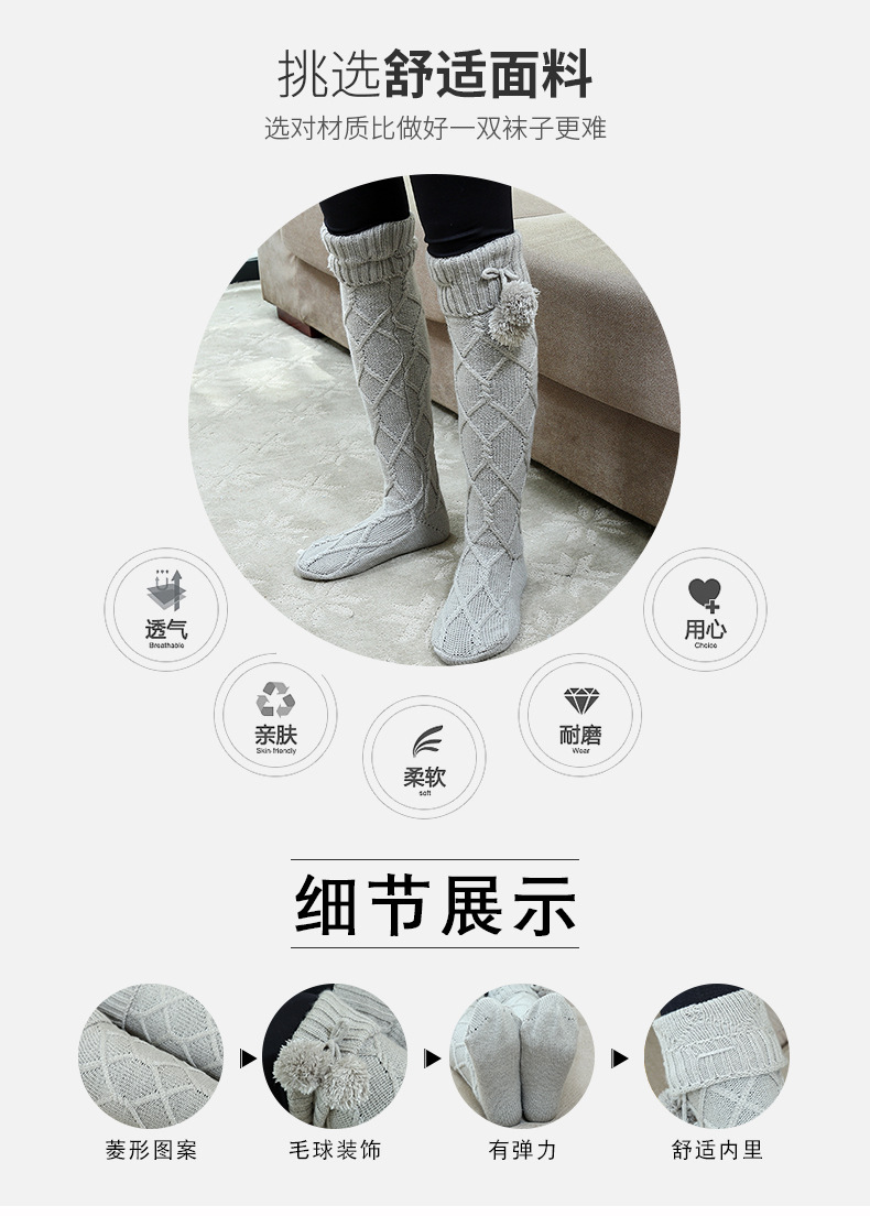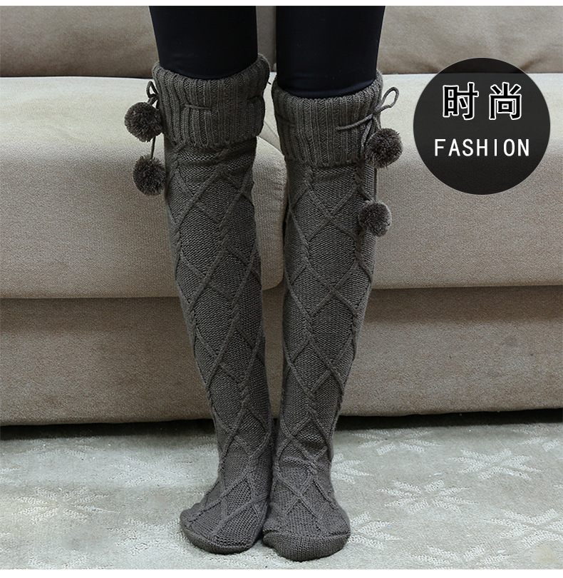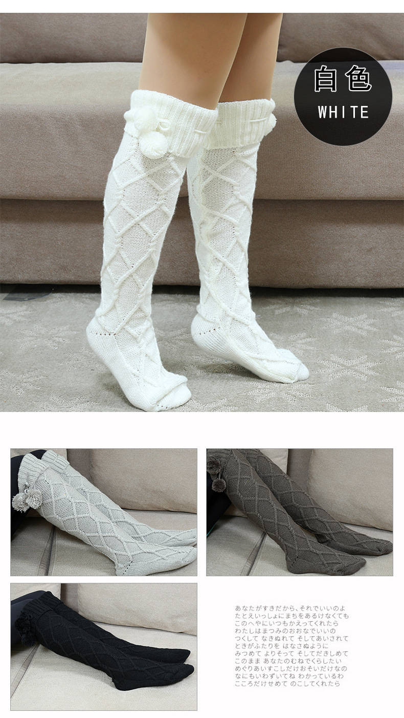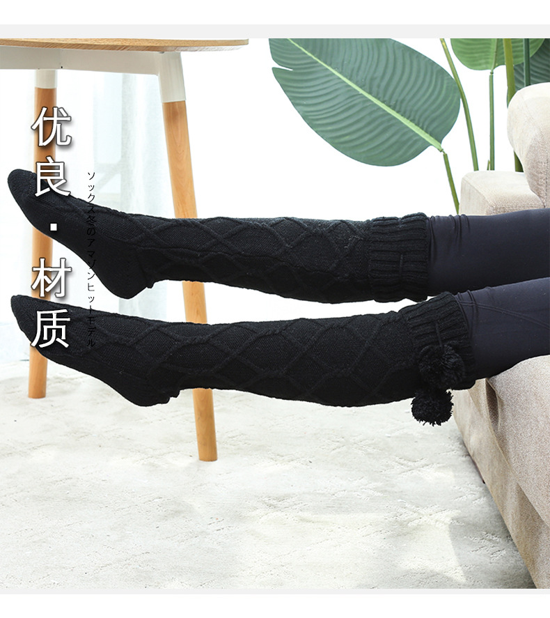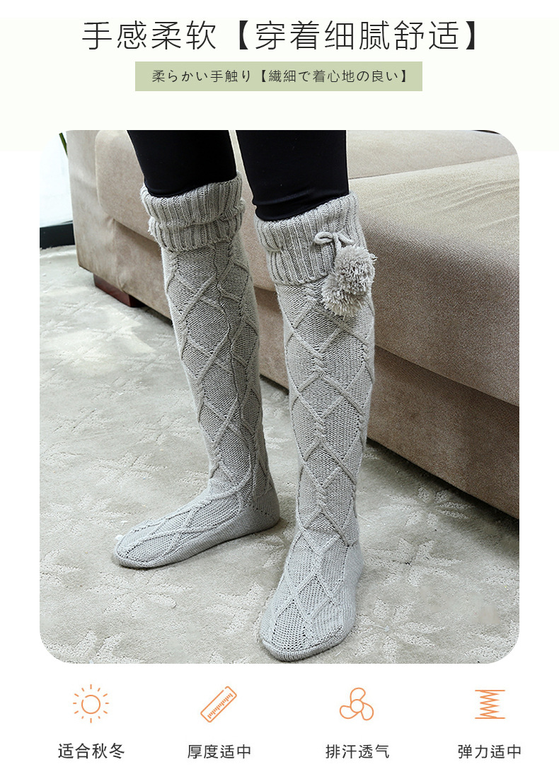 新款韩版高筒针织长袜子时尚毛球袜过膝袜纯色堆堆袜透气长筒袜