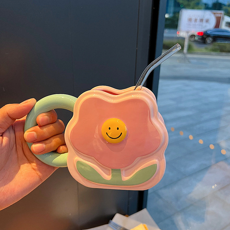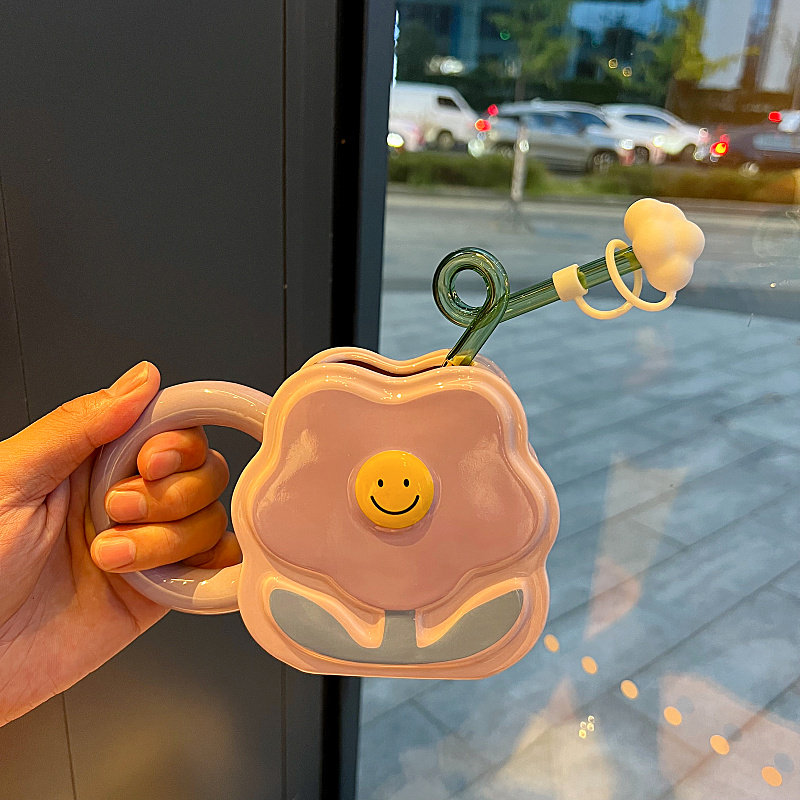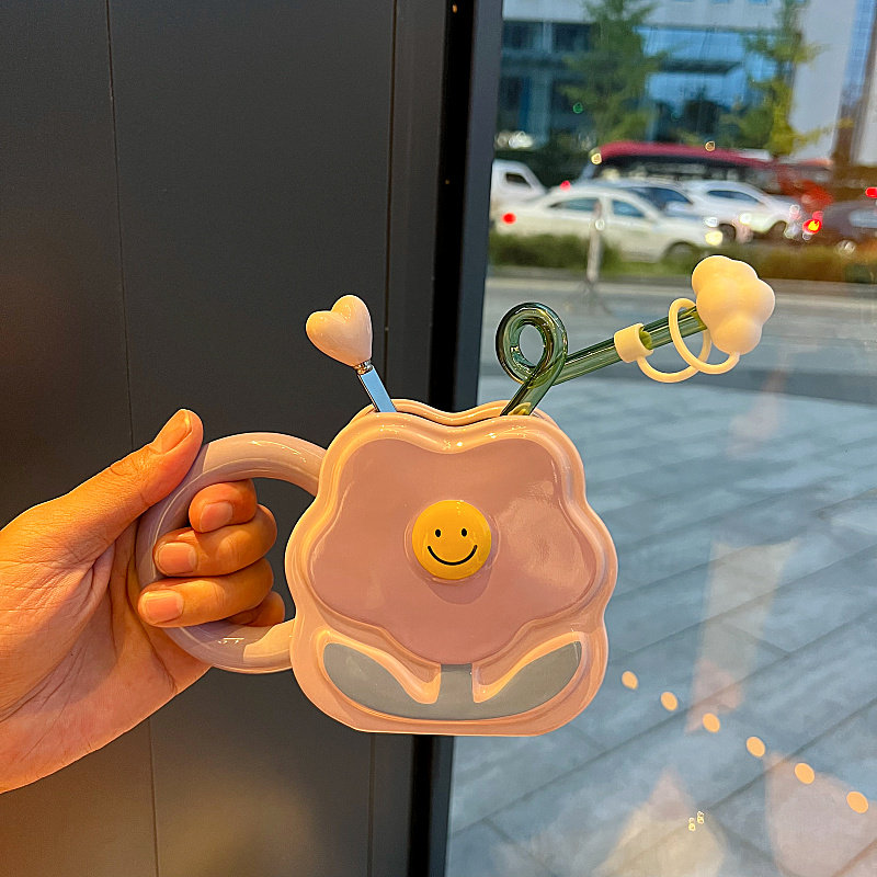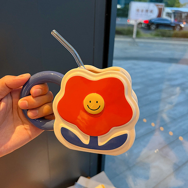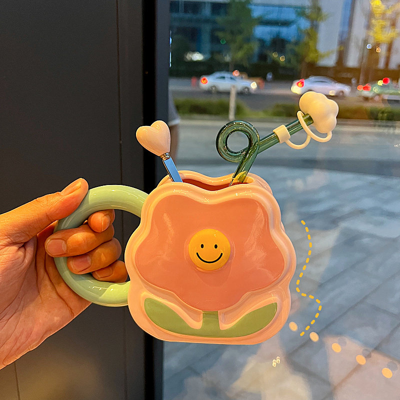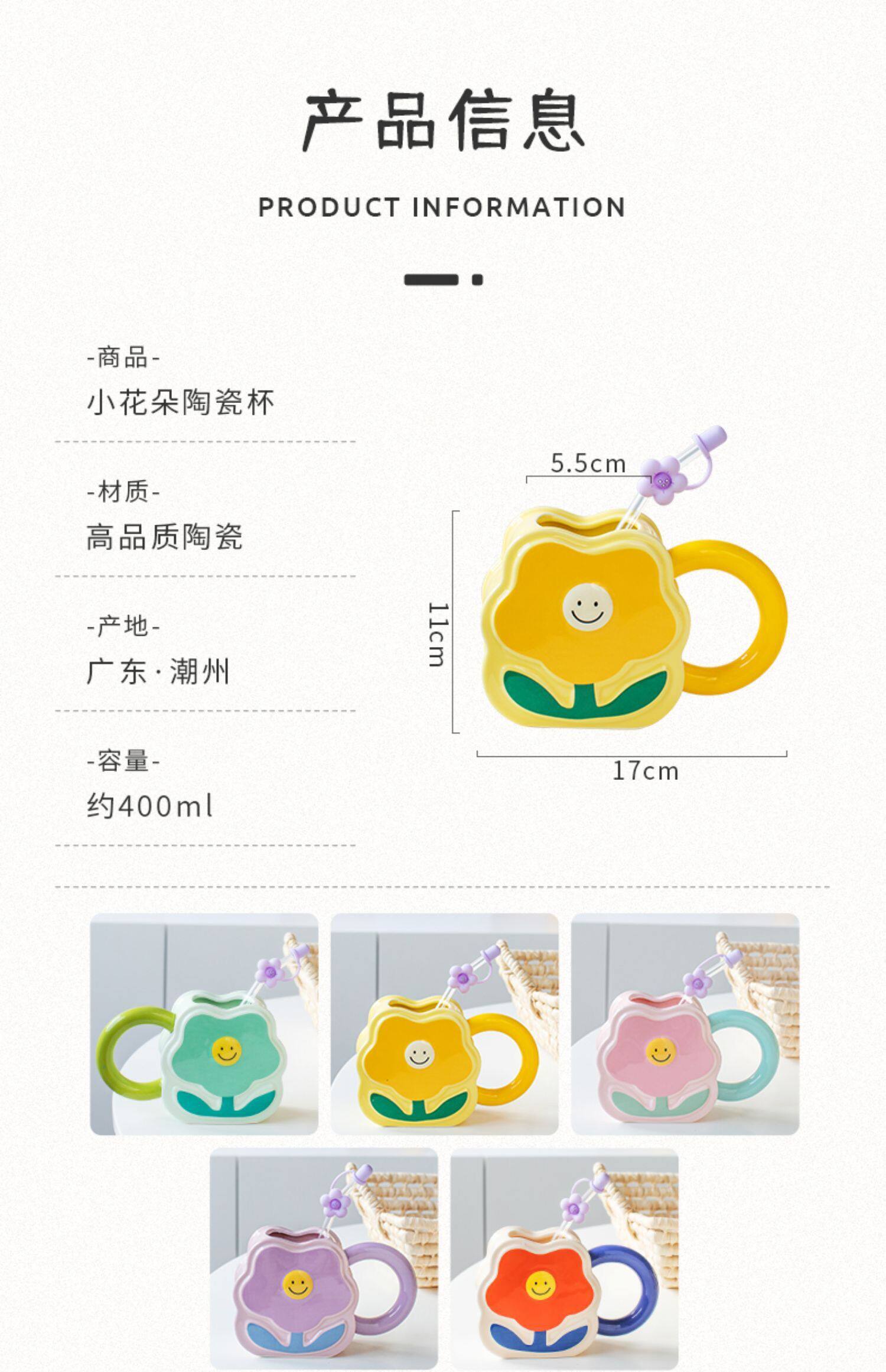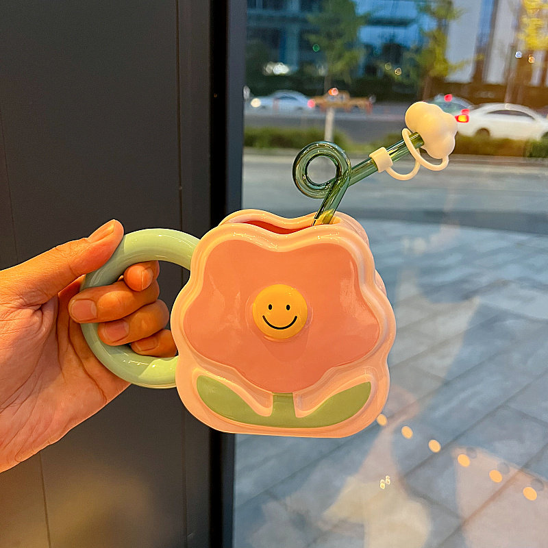 ins可爱花朵高颜值水杯子少女心学生带吸管陶瓷杯创意清新马克杯