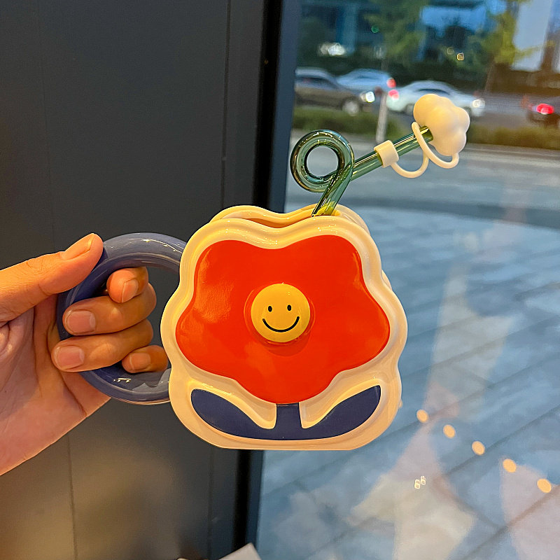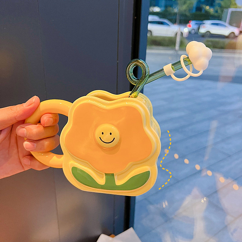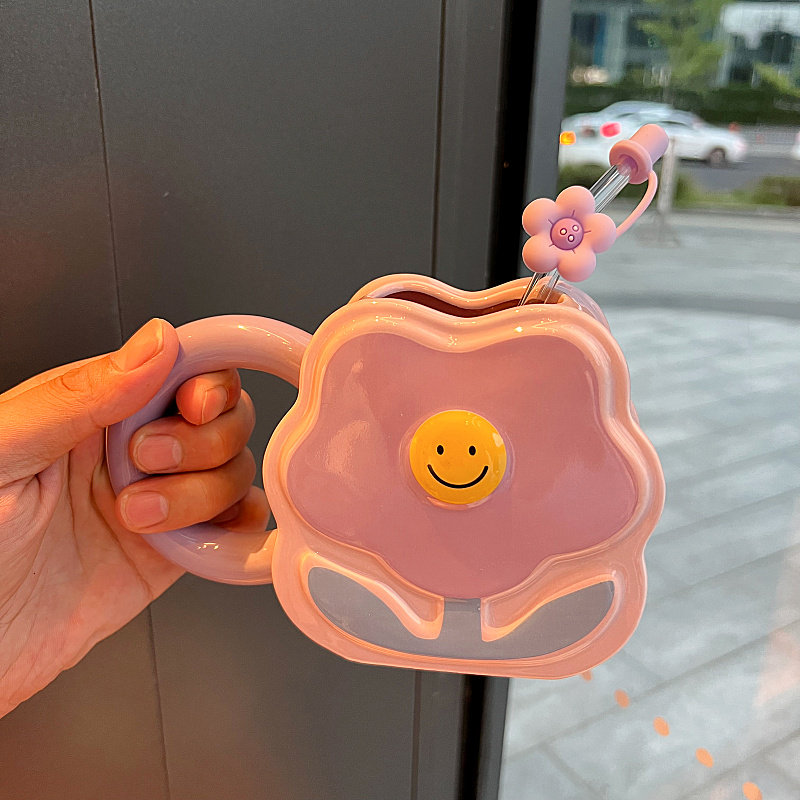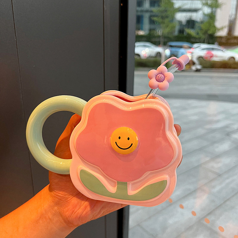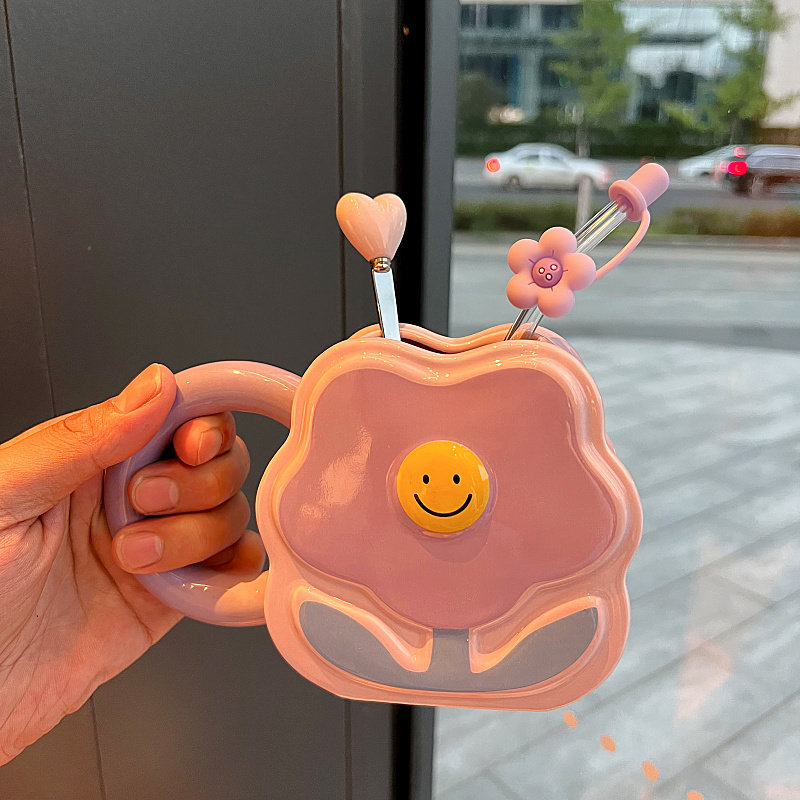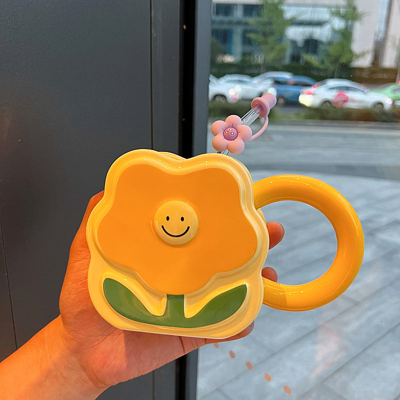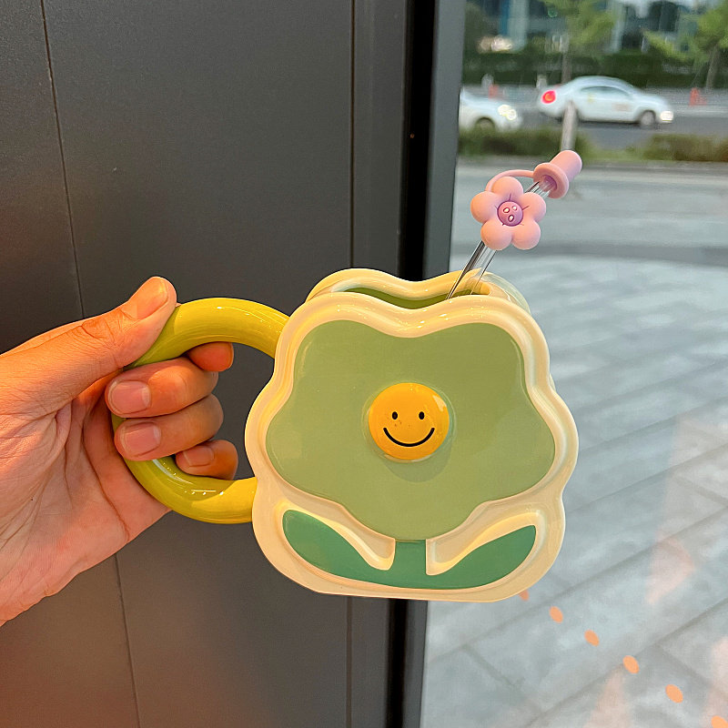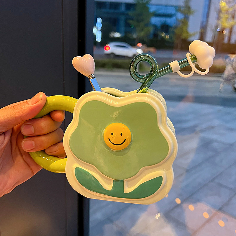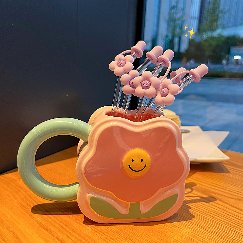 ins可爱花朵高颜值水杯子少女心学生带吸管陶瓷杯创意清新马克杯