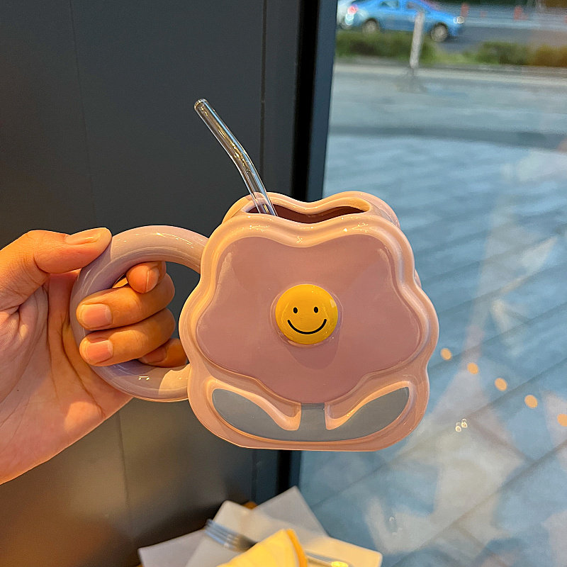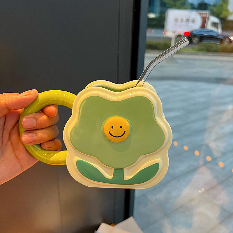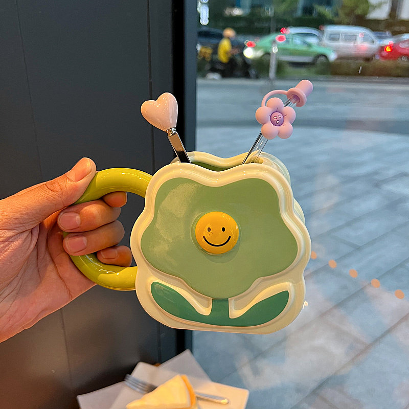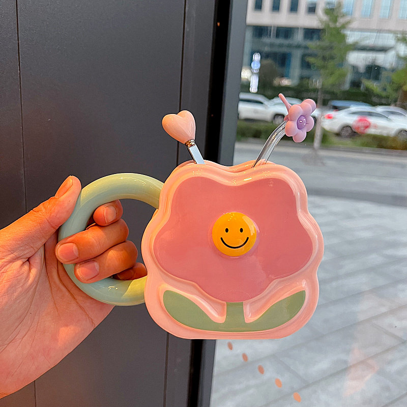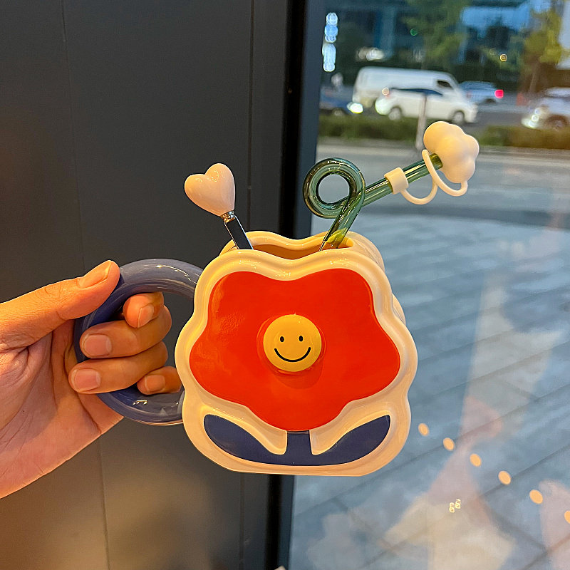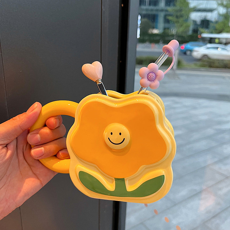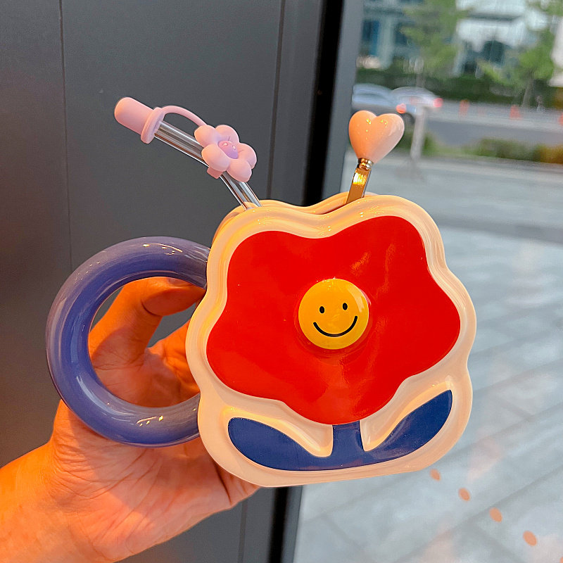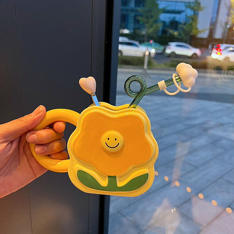 ins可爱花朵高颜值水杯子少女心学生带吸管陶瓷杯创意清新马克杯