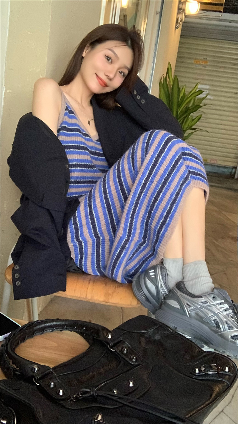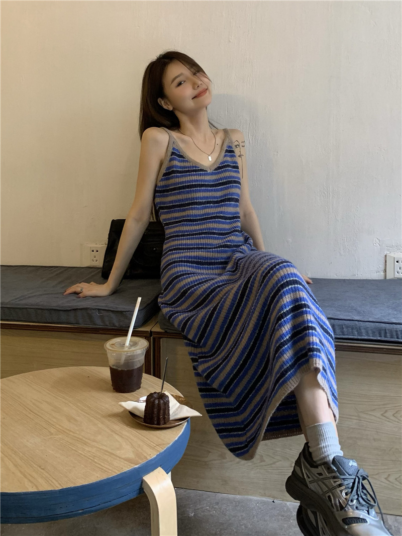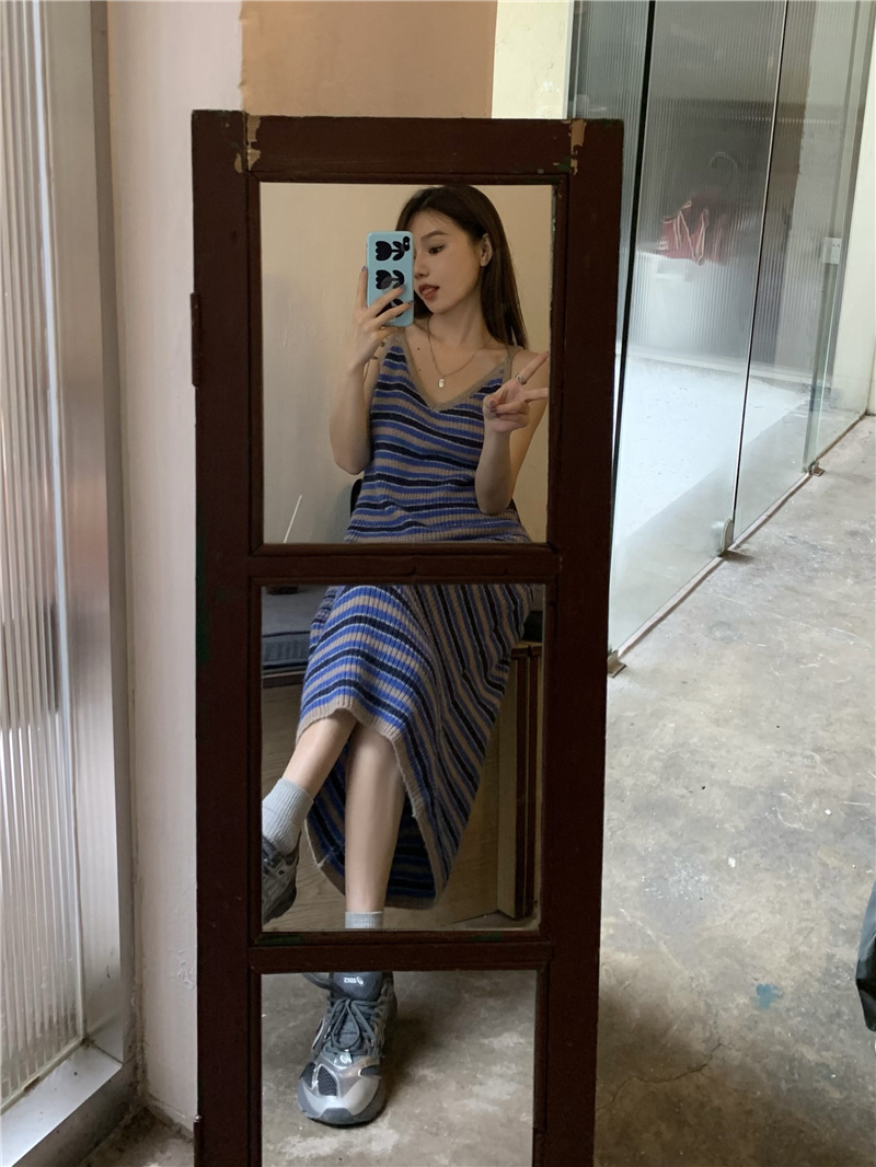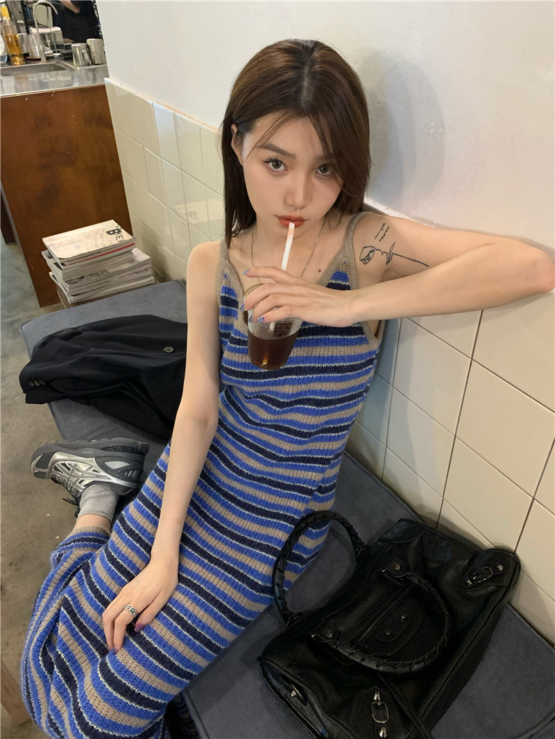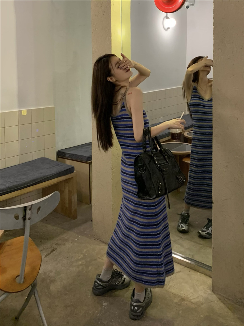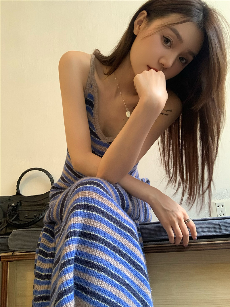实拍修身百搭设计感撞色条纹针织连衣裙女早秋中长款吊带裙43433