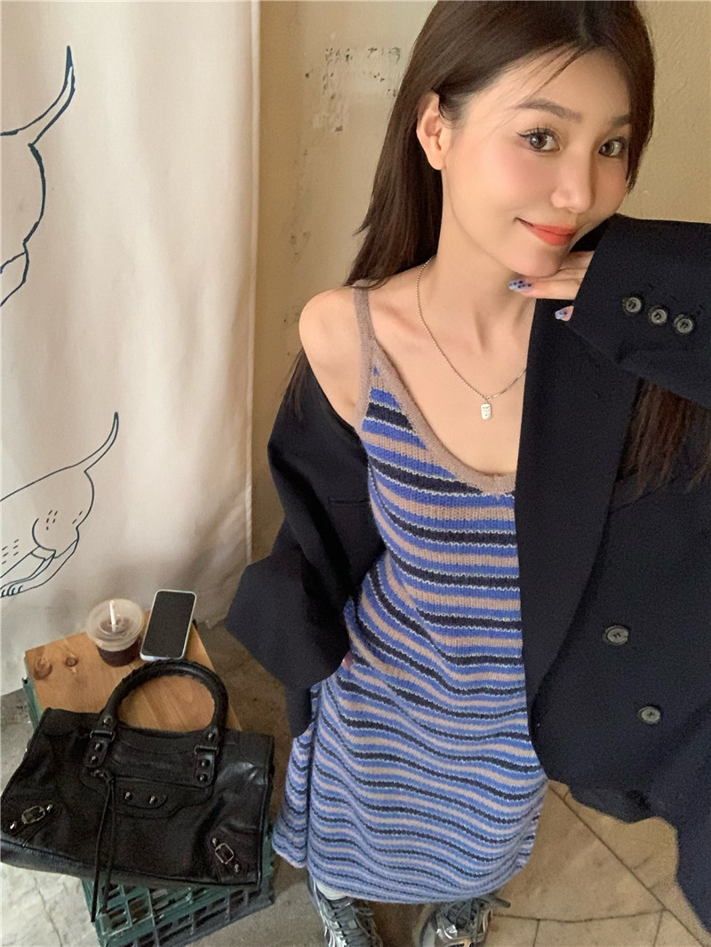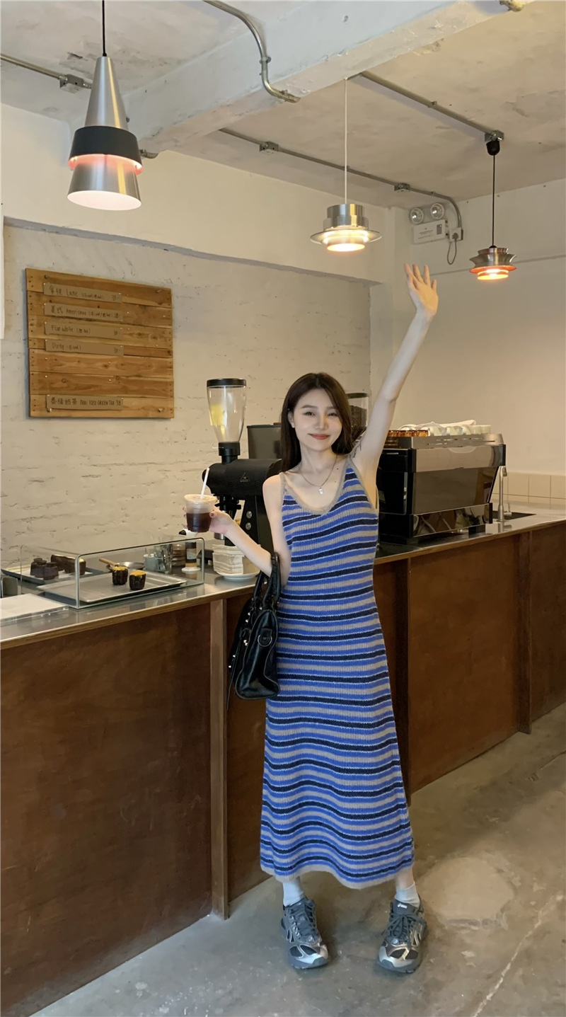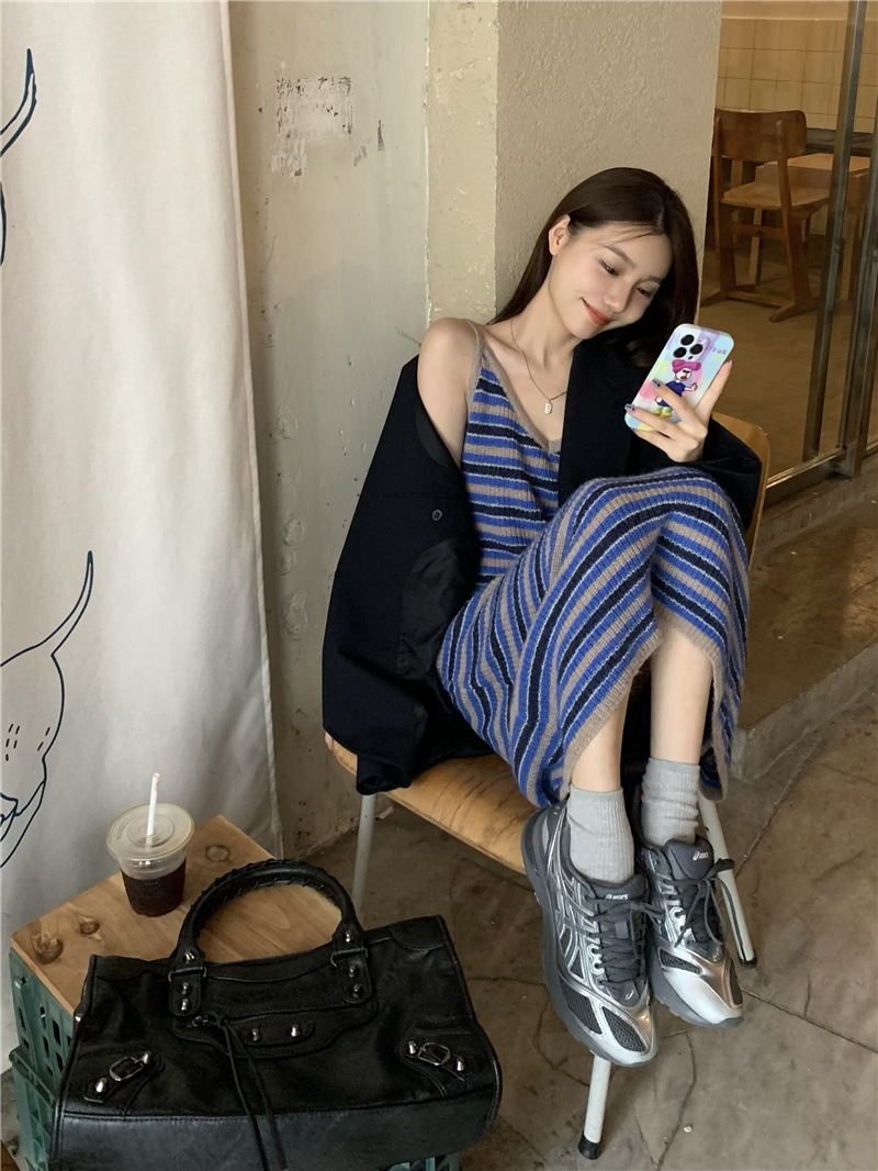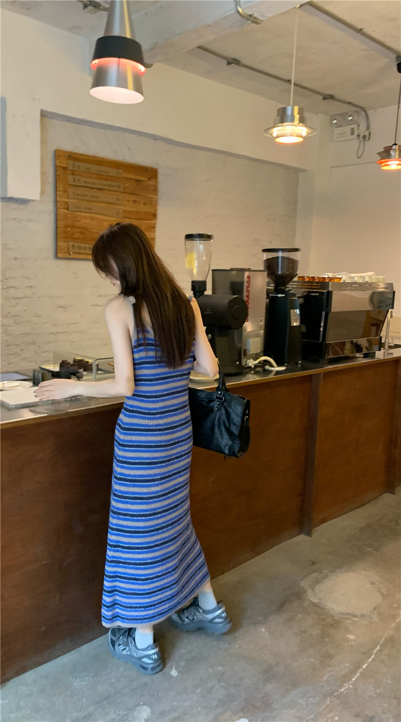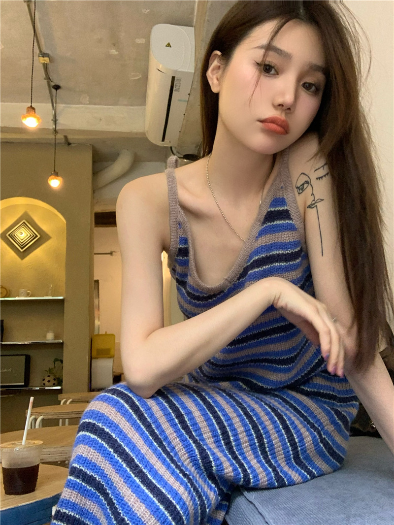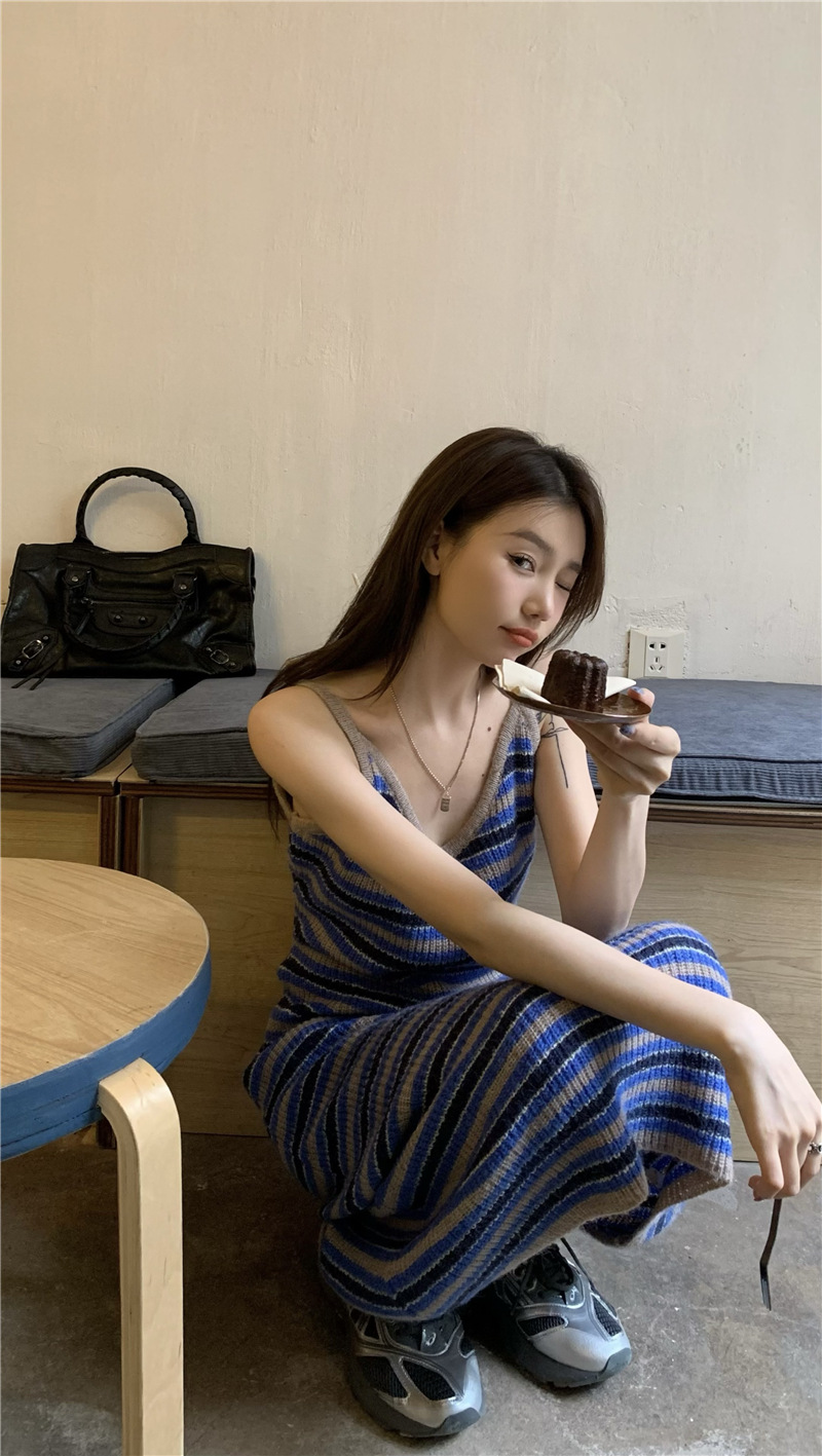 实拍修身百搭设计感撞色条纹针织连衣裙女早秋中长款吊带裙43433